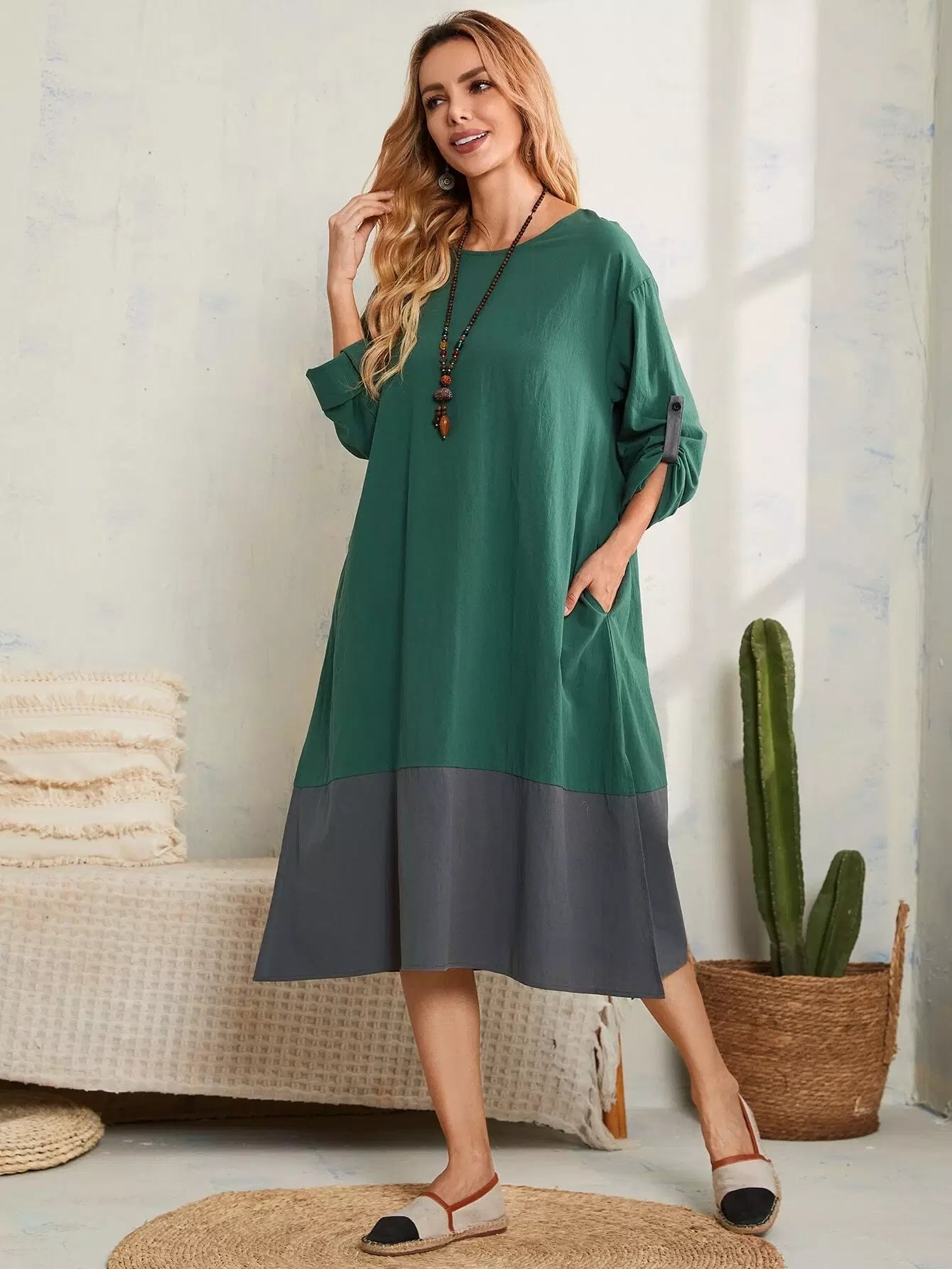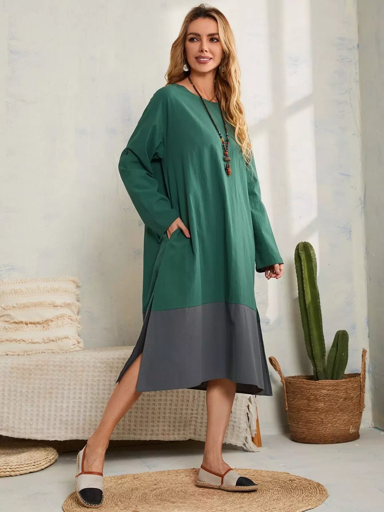 Two Tone Roll Tab Sleeve Split Hem Dress
