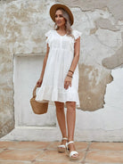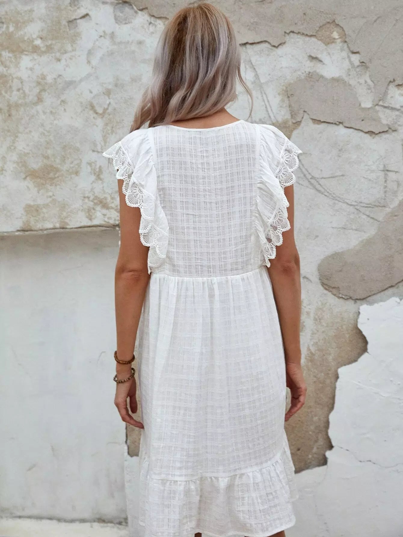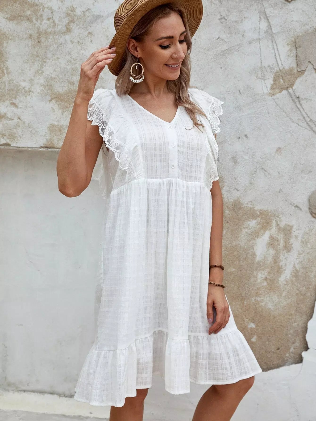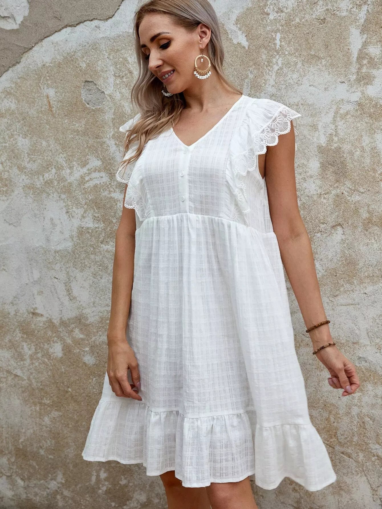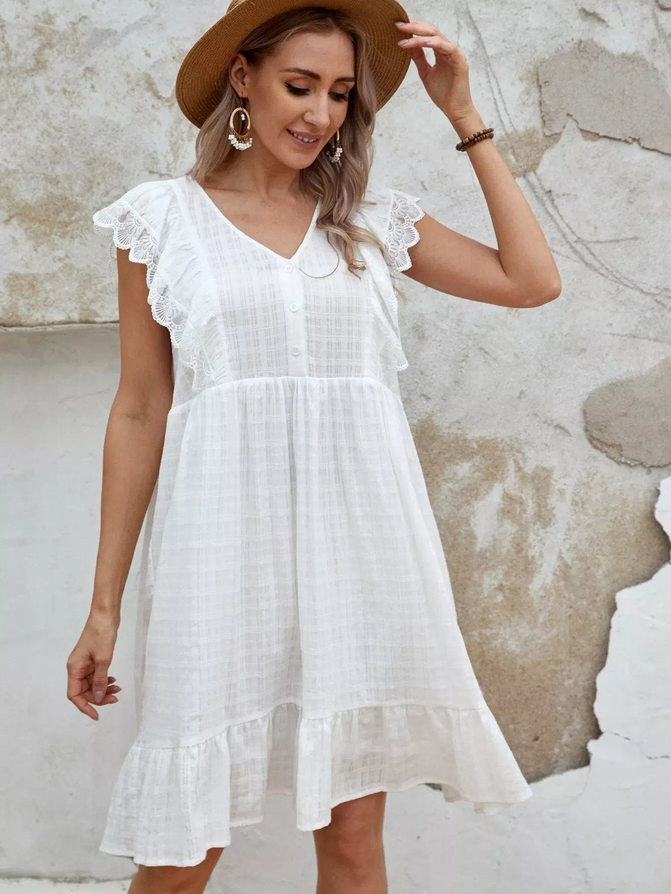 V Neck Lace Trim Ruffle Hem Smock Dress