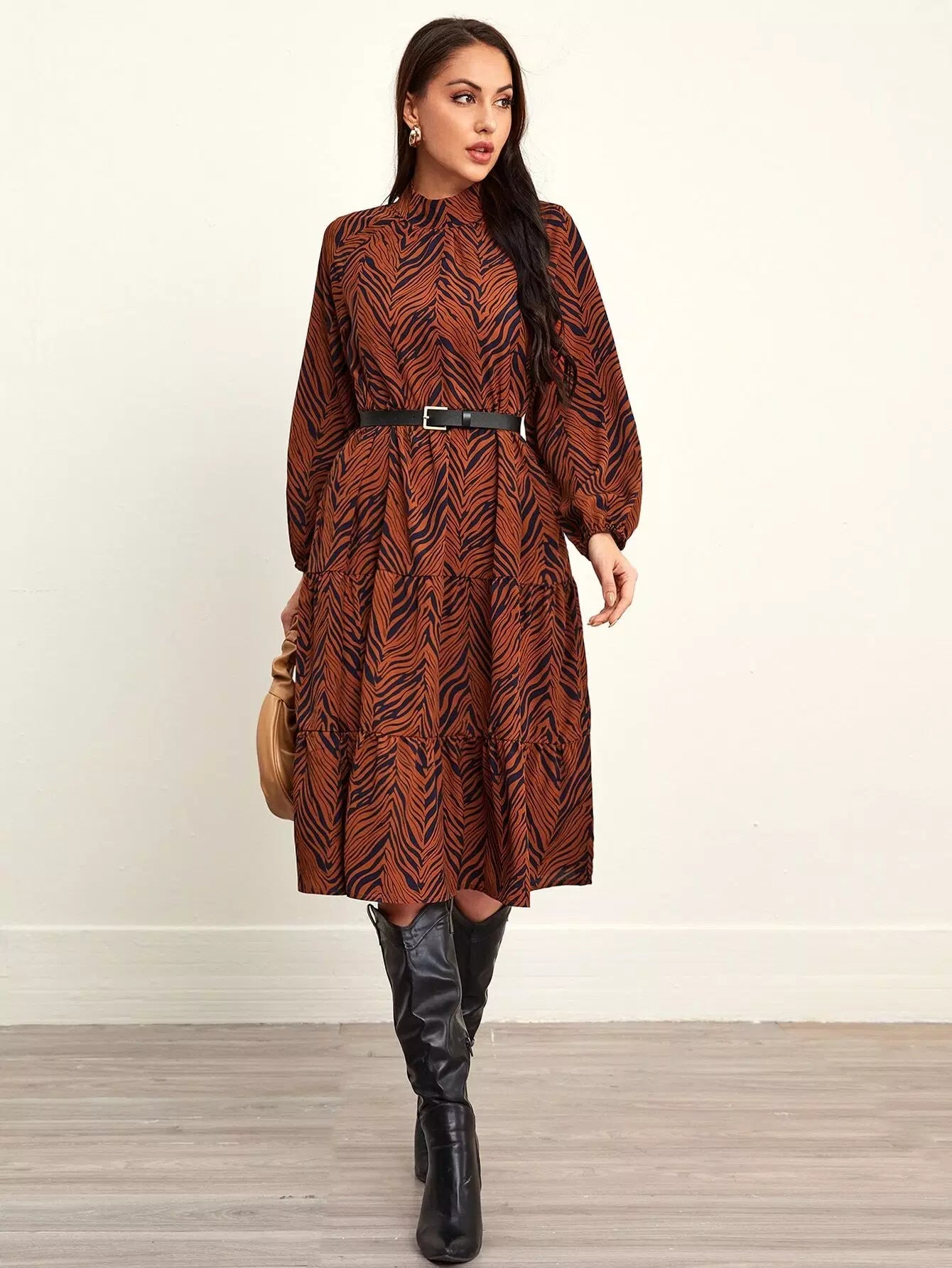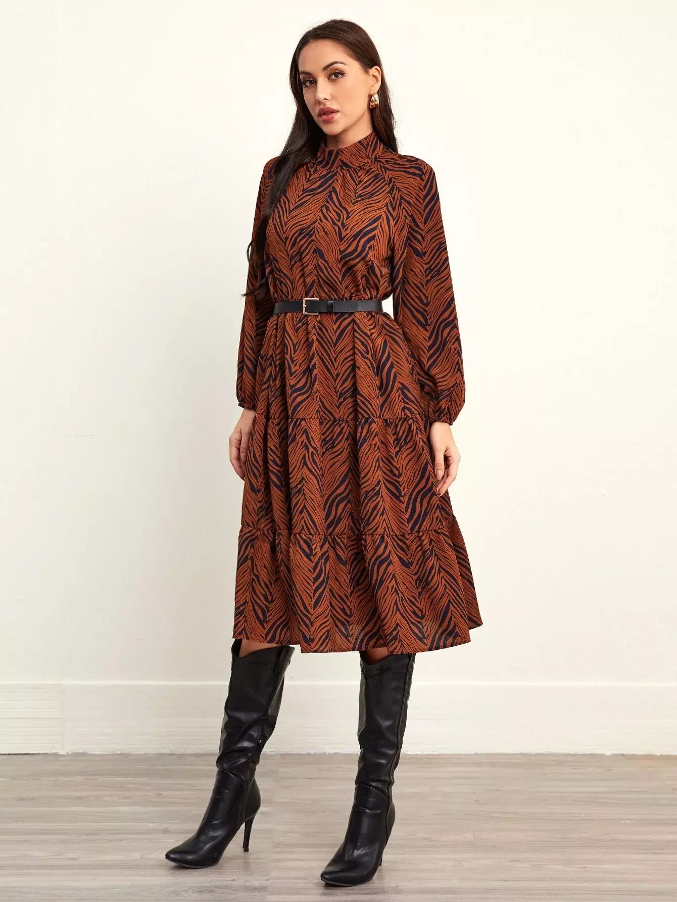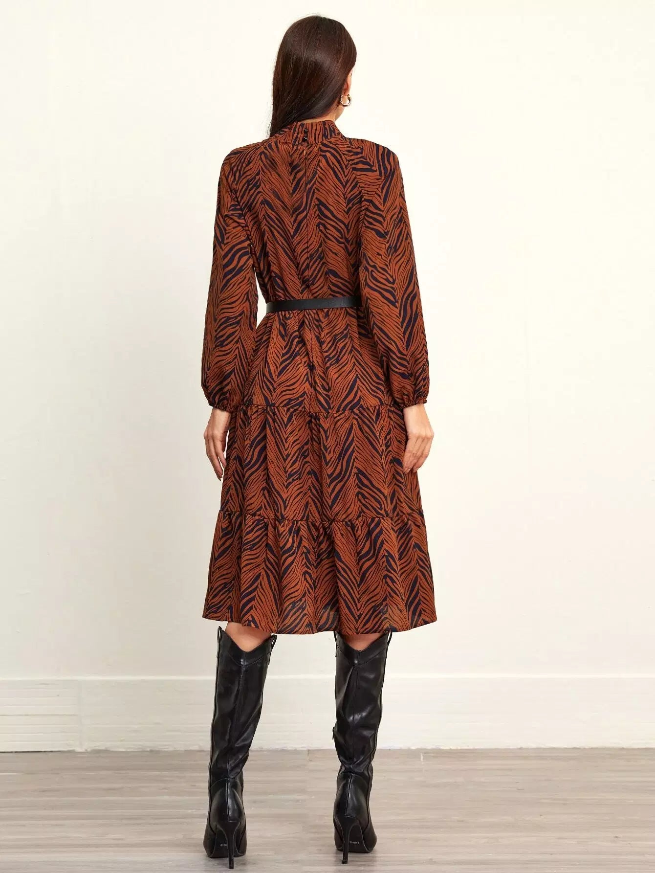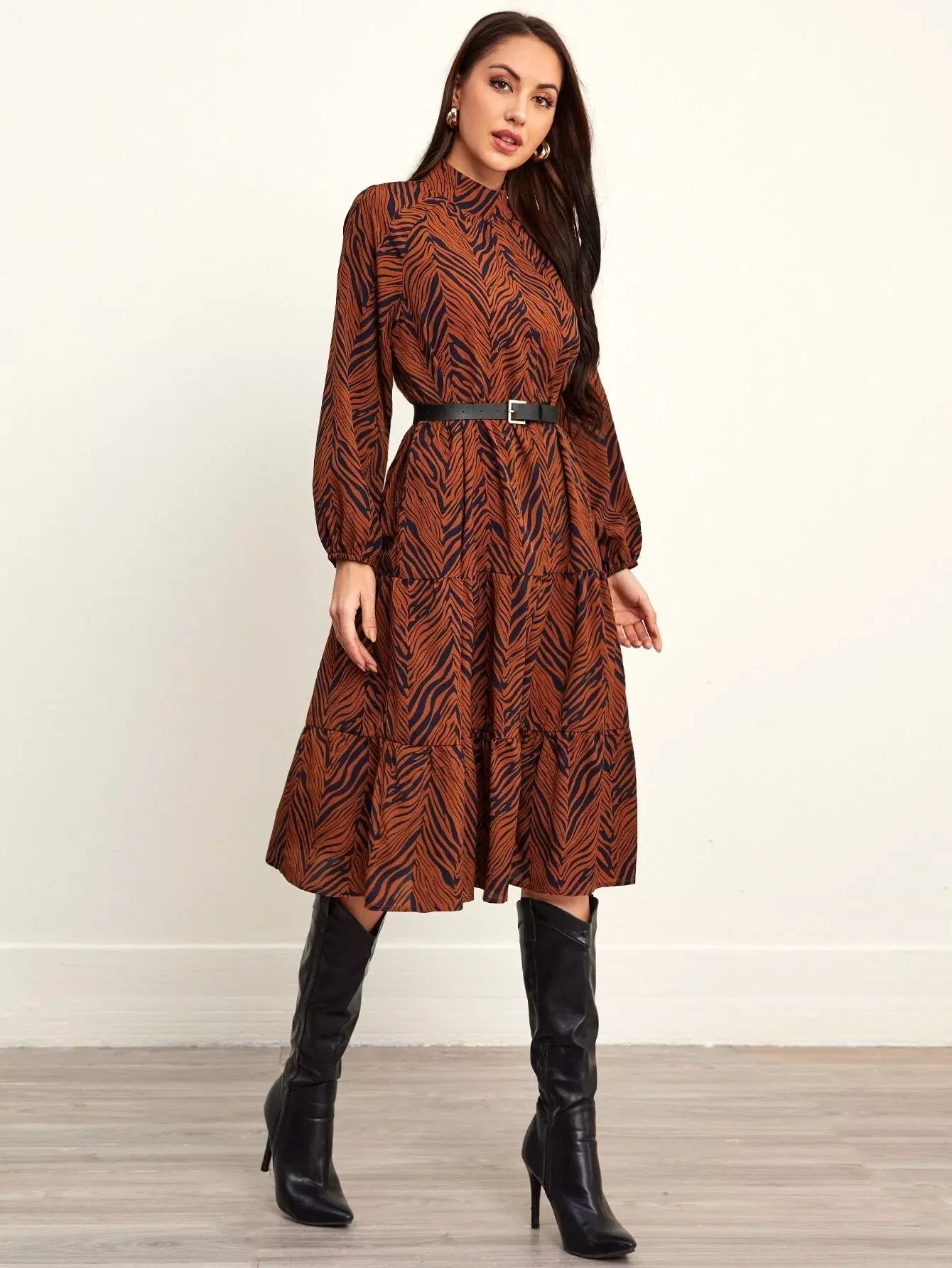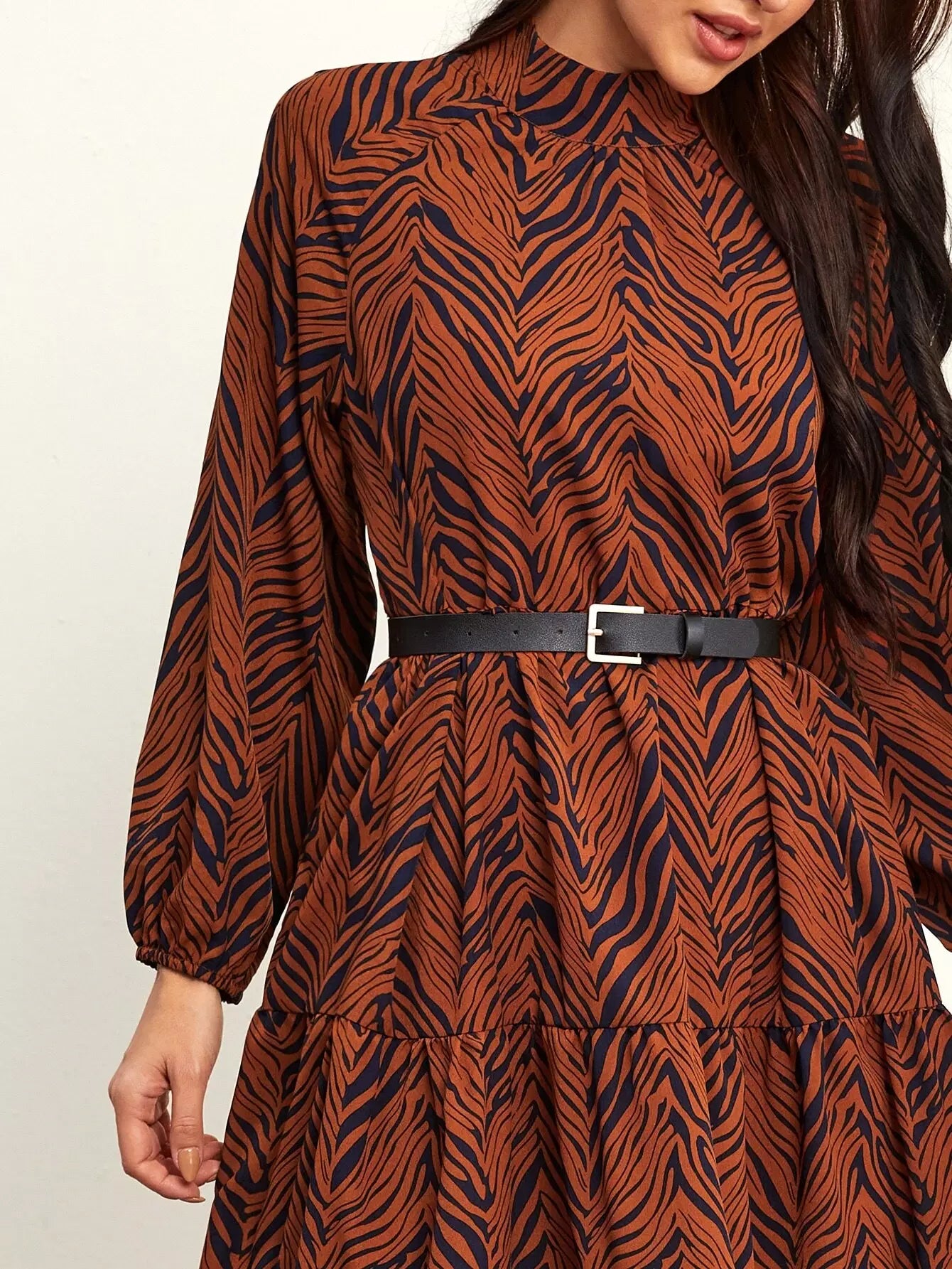 Zebra Stripe Mock Neck Ruffle Hem Dress Without Belt