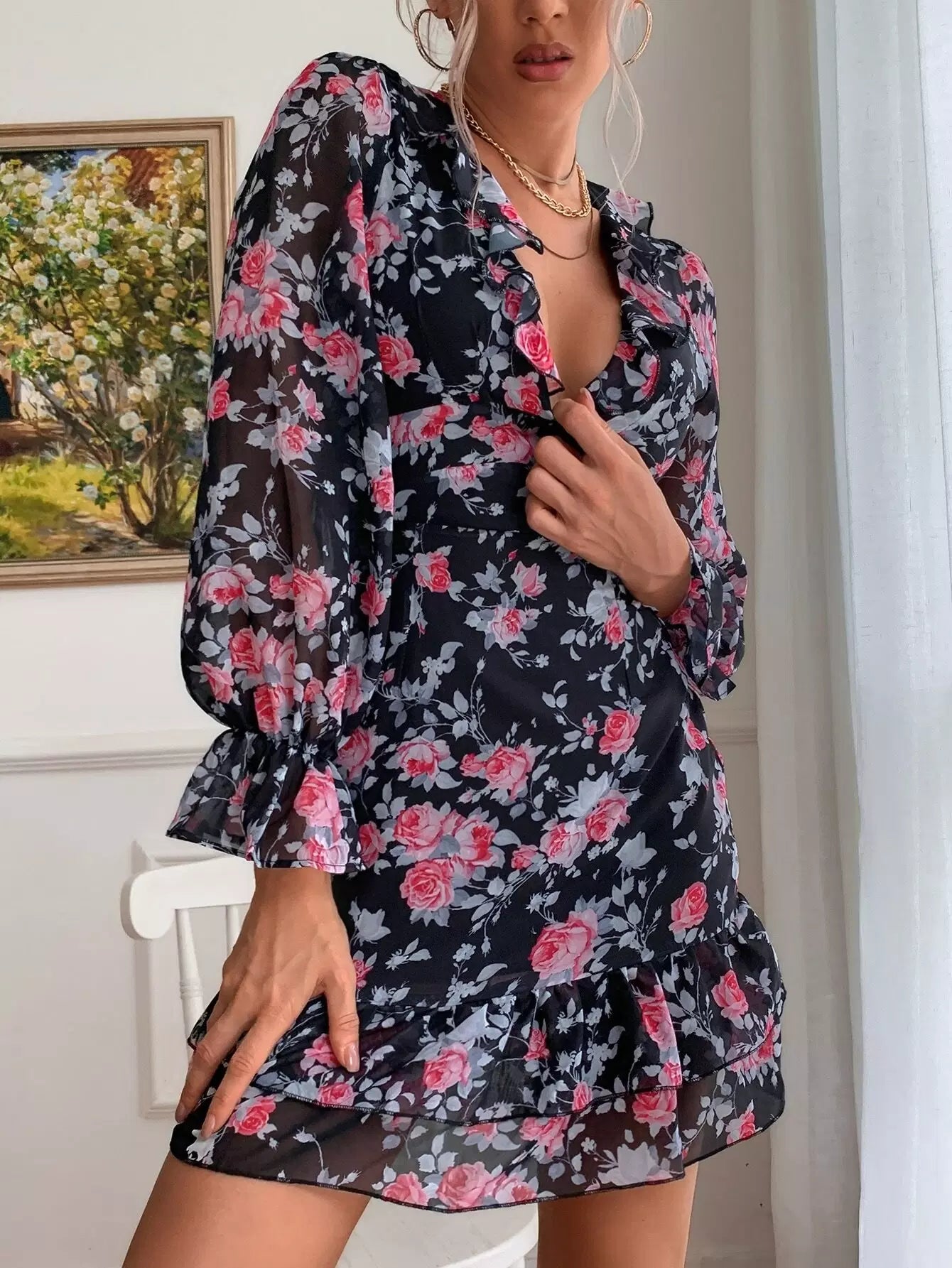 Allover Floral Lace Up Back Flounce Sleeve Dress