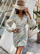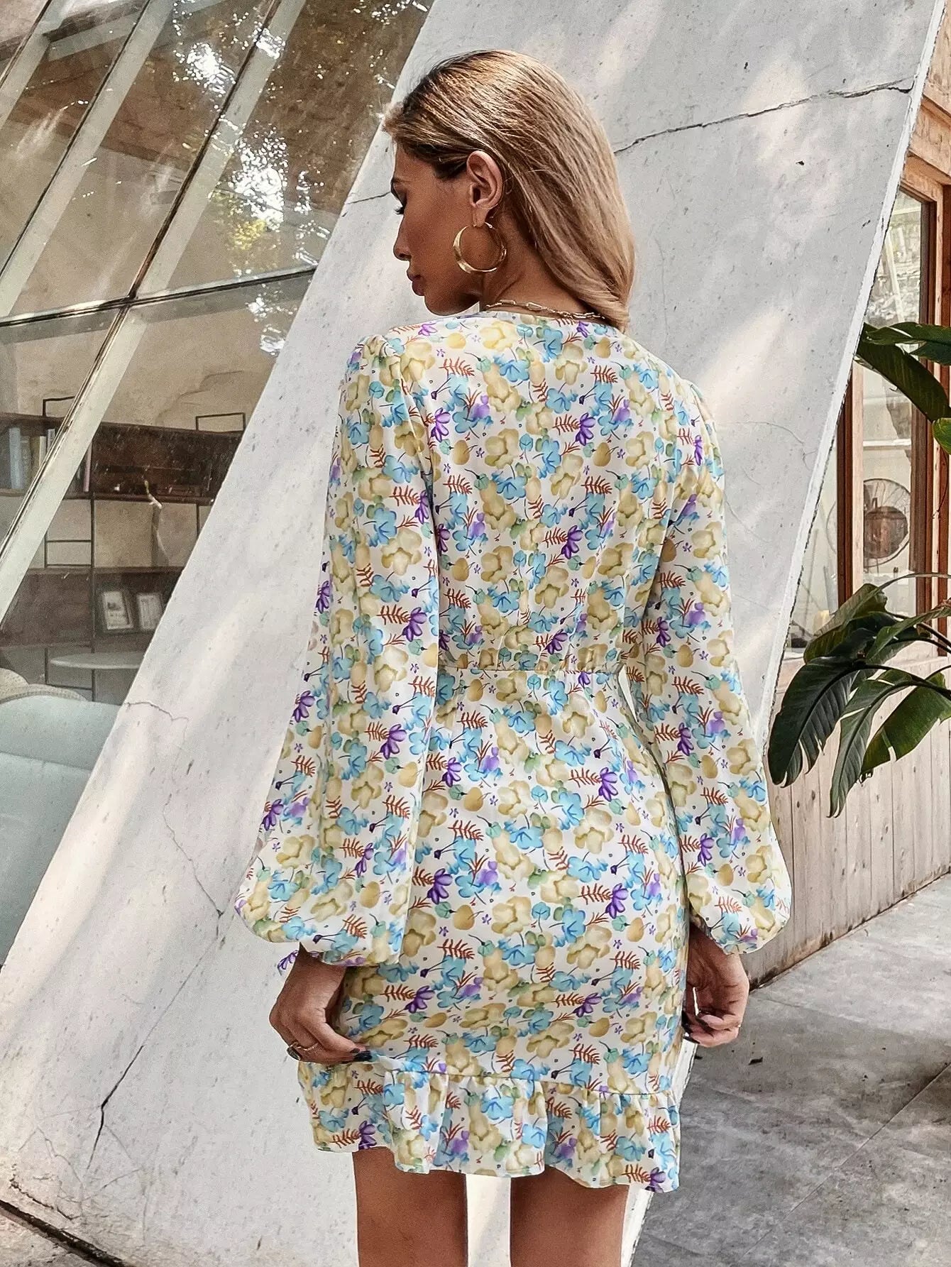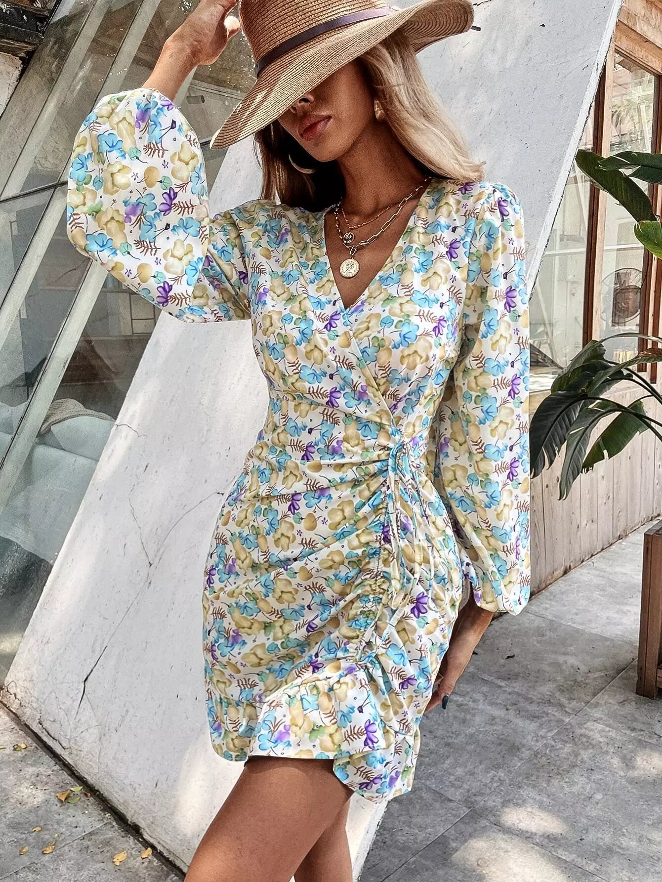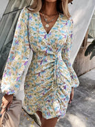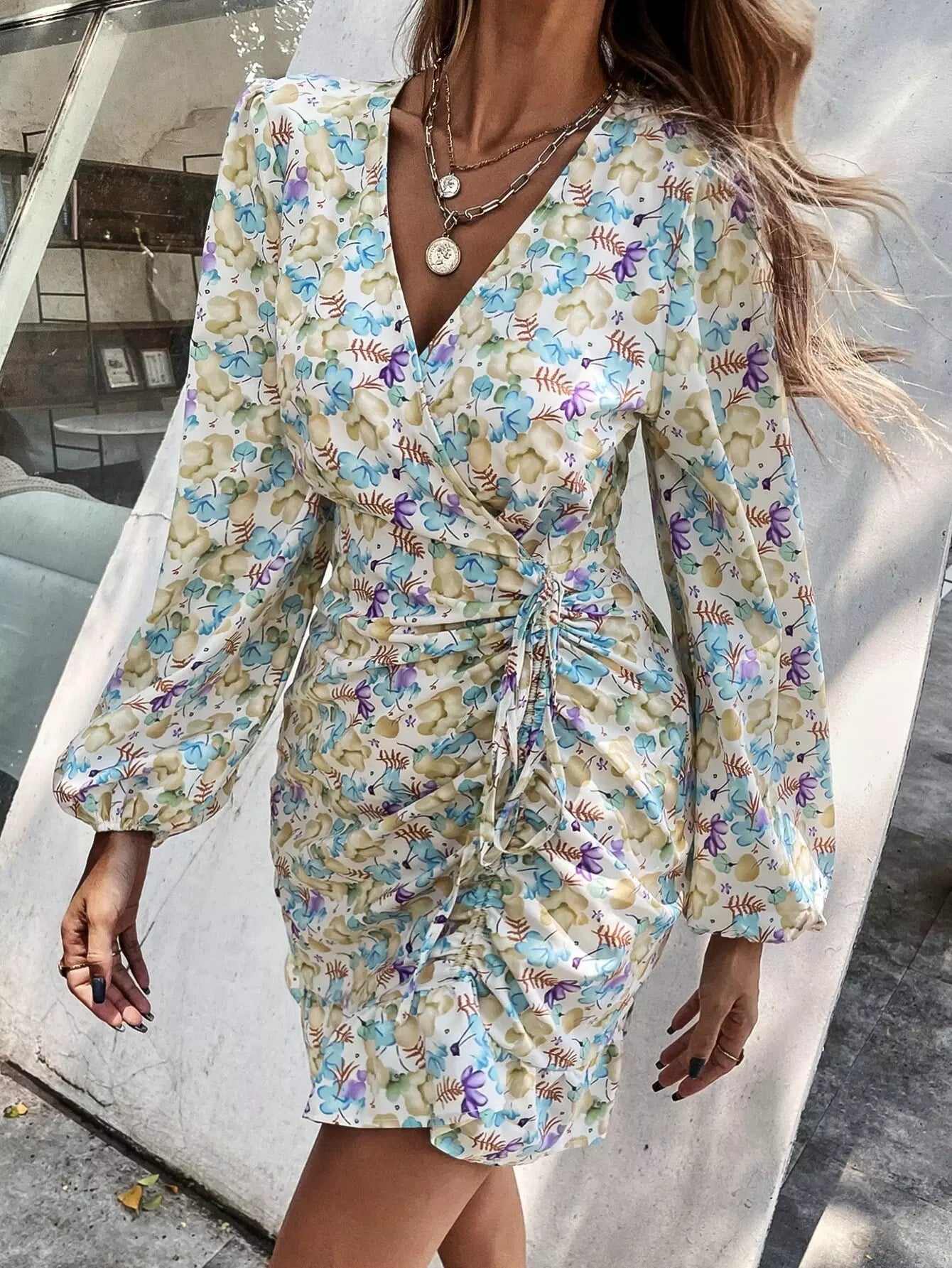 Allover Floral Print Drawstring Side Ruffle Hem Bishop Sleeve Dress