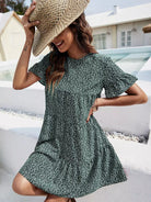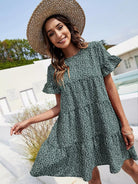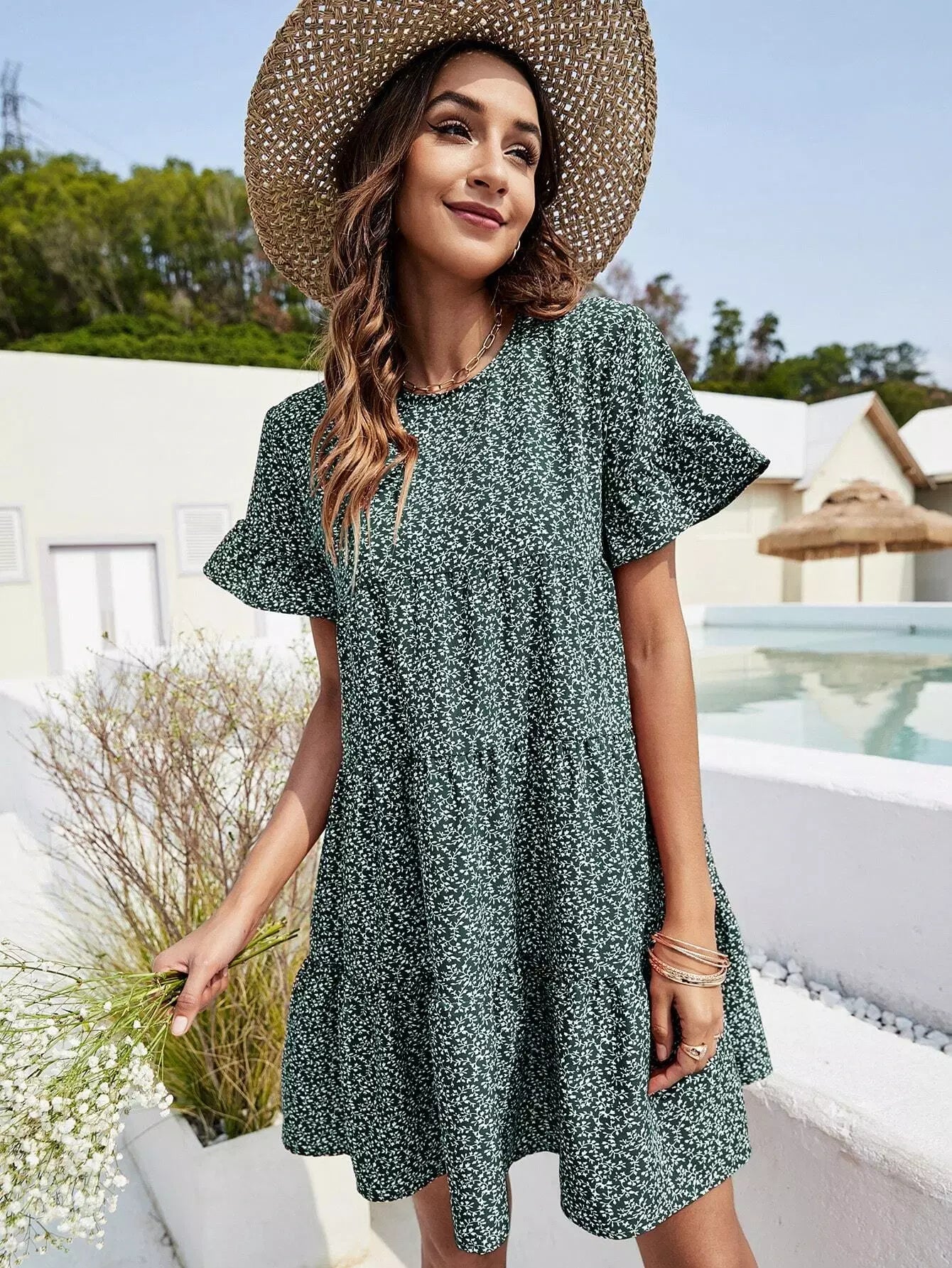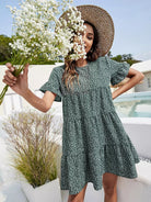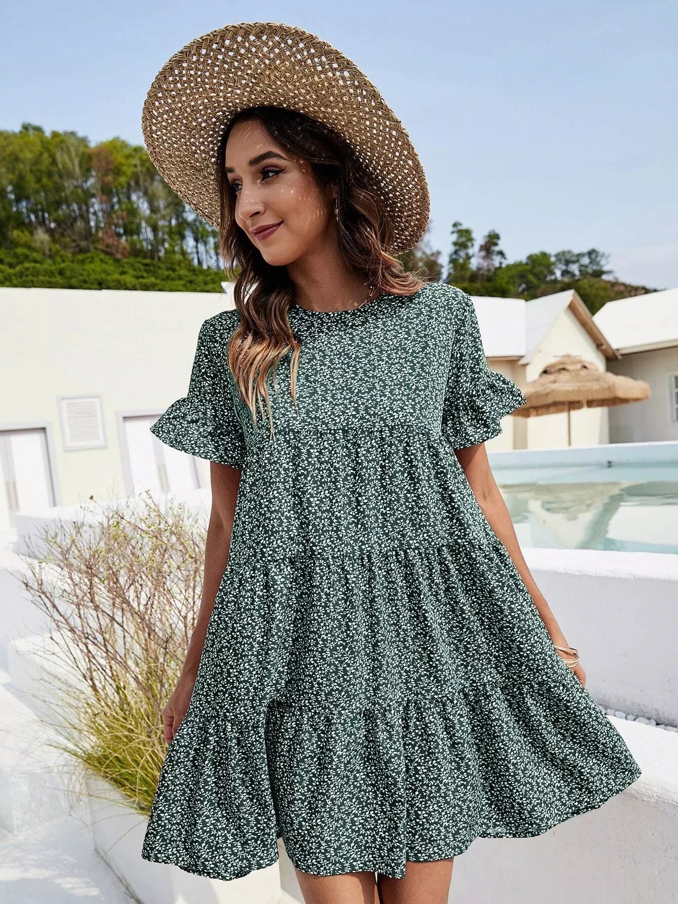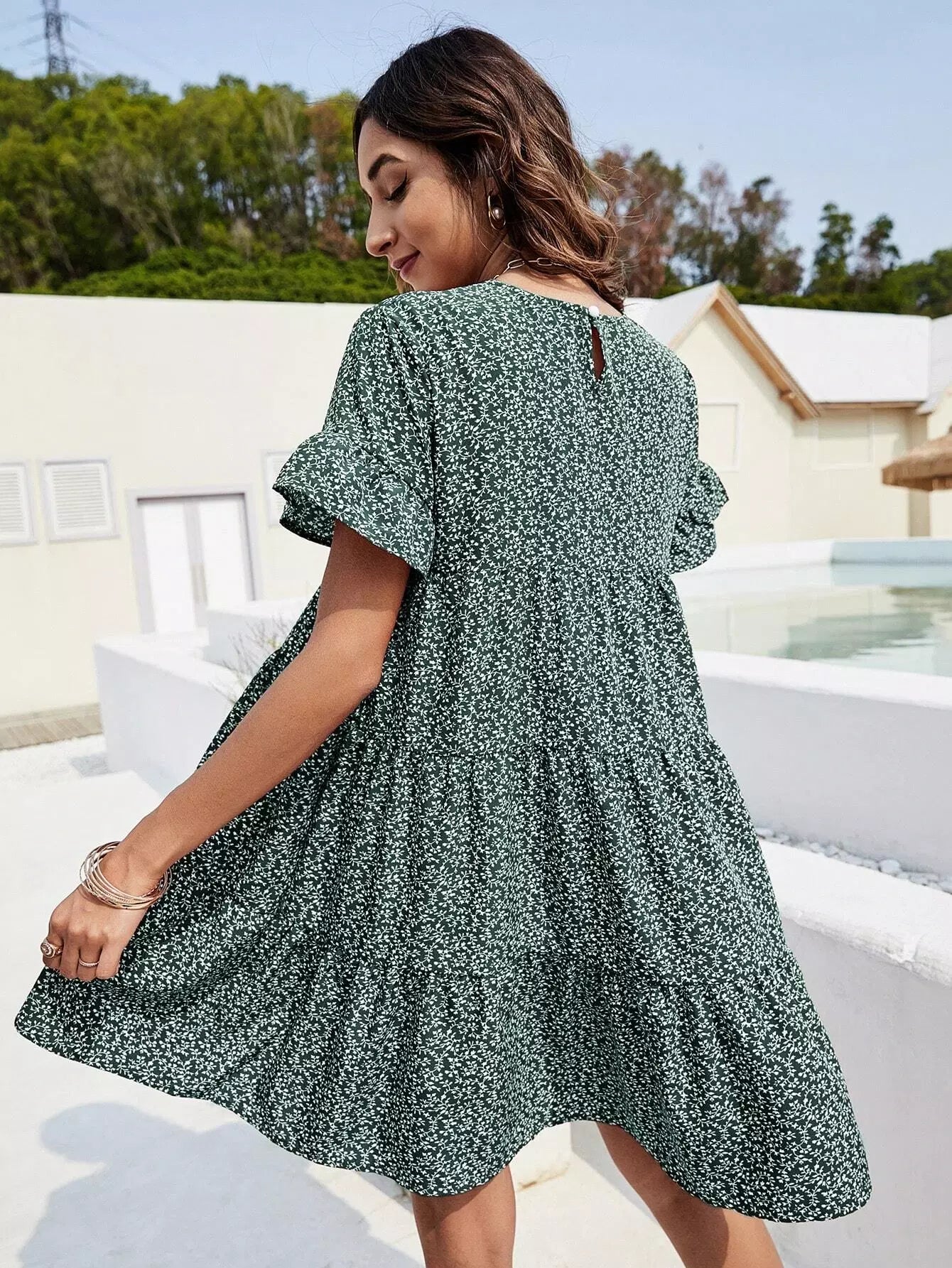Women - Allover Leaf Flounce Sleeve Smock Dress