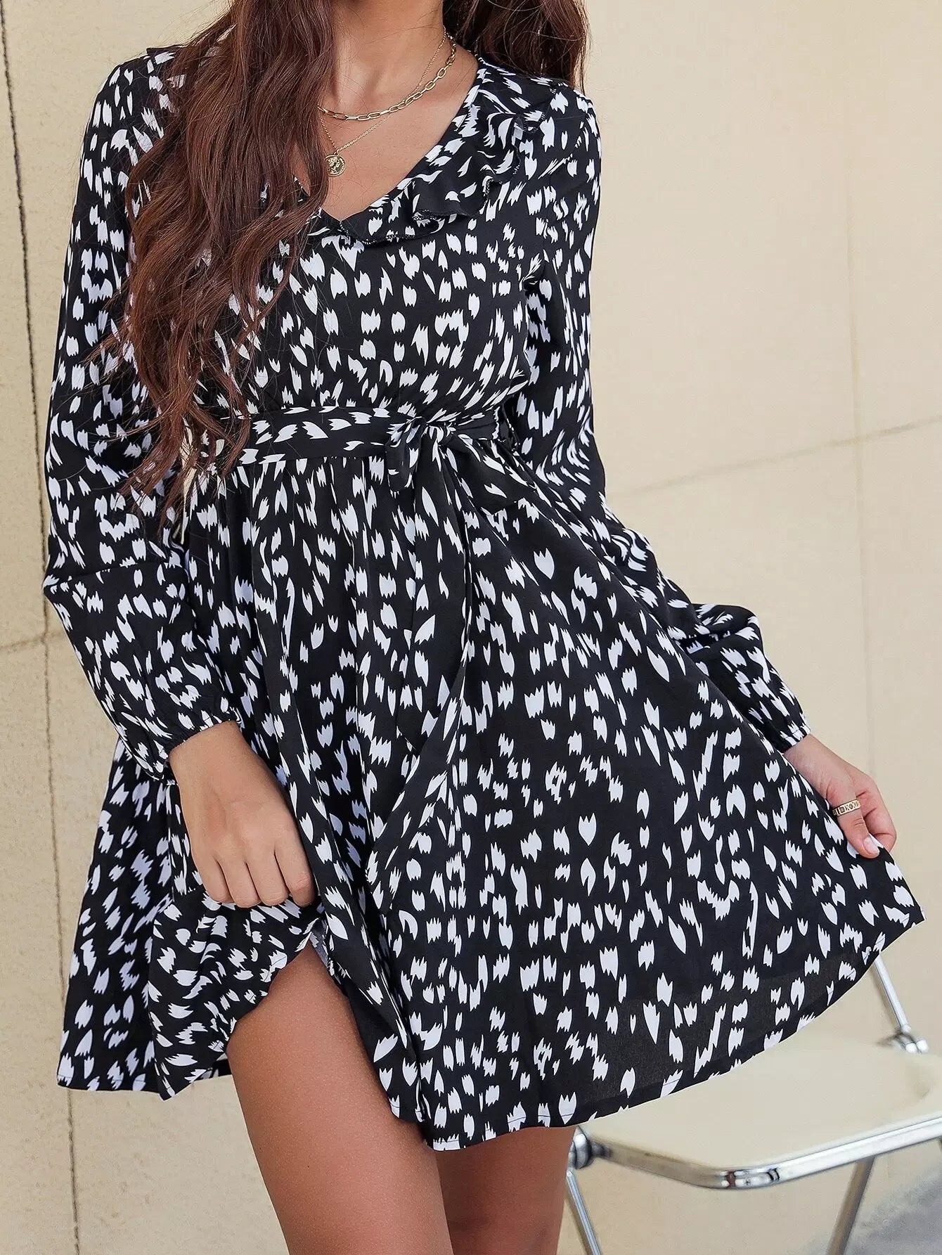 Allover Print Ruffle Trim Lantern Sleeve Dress Without Belt