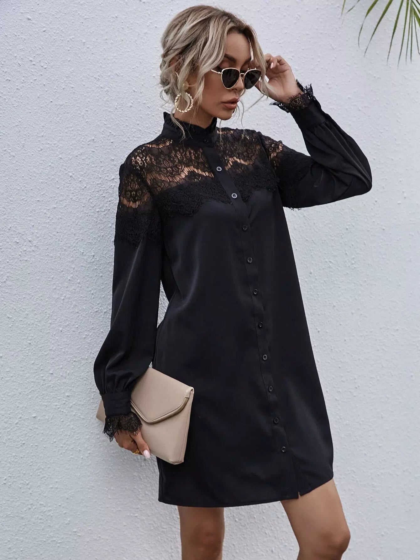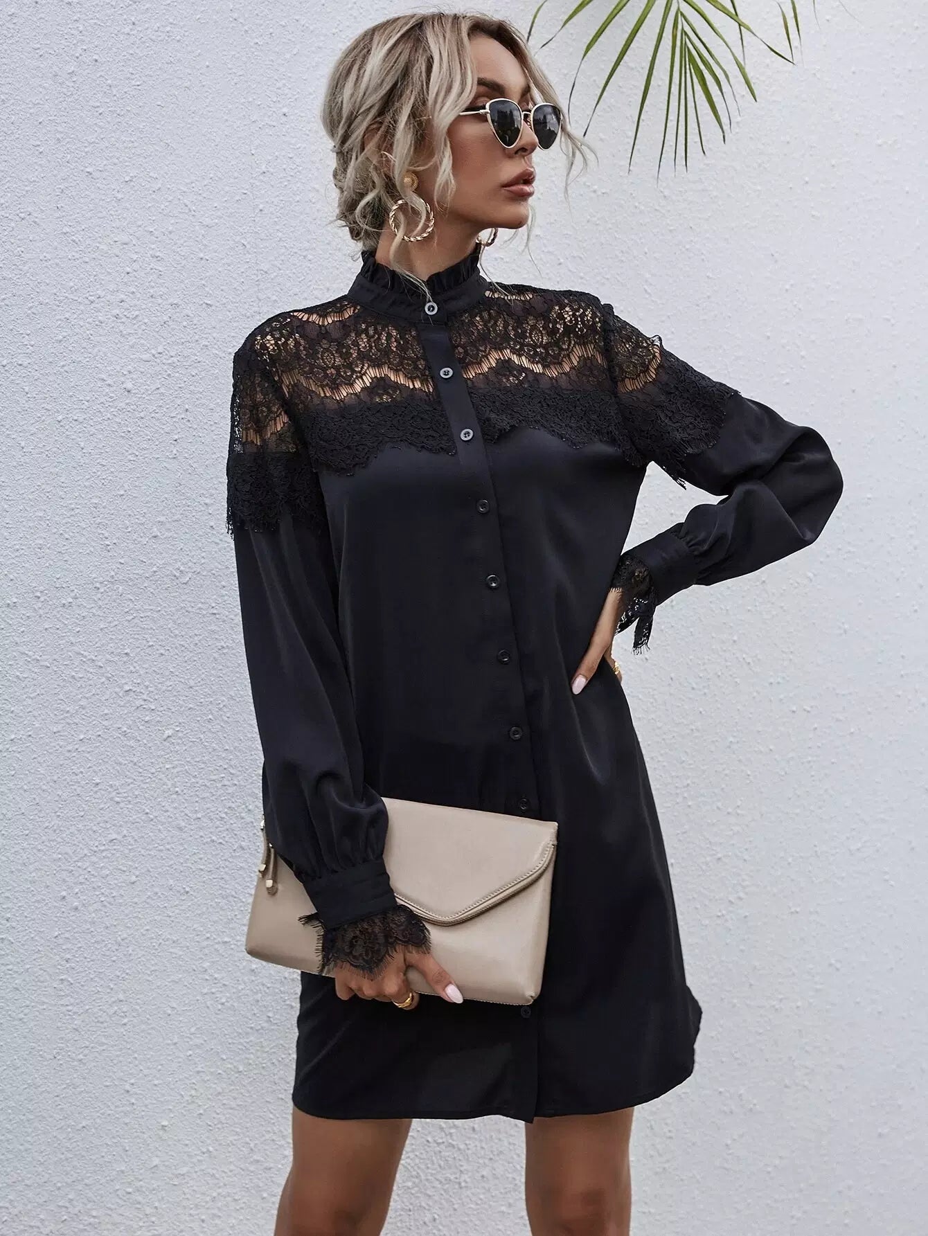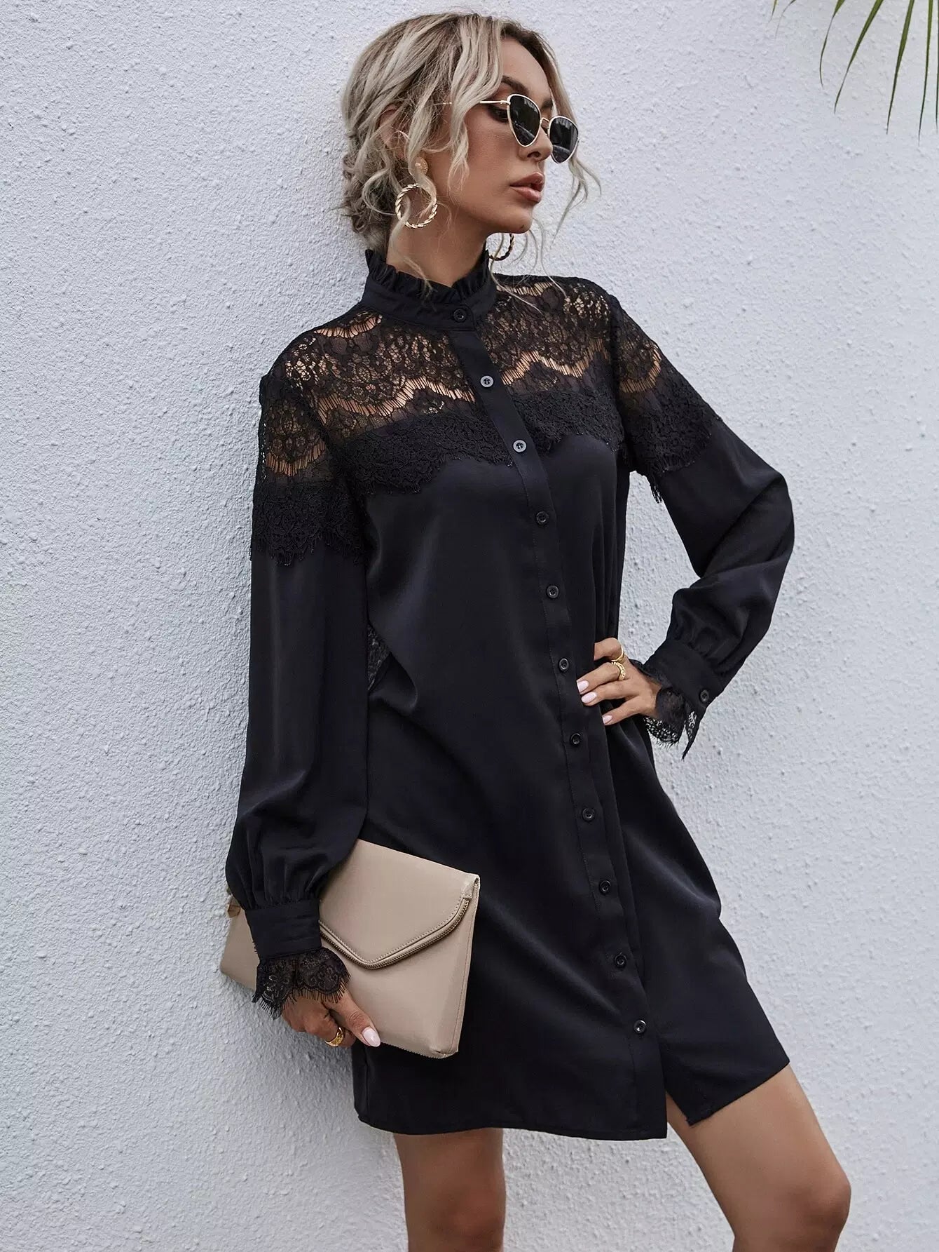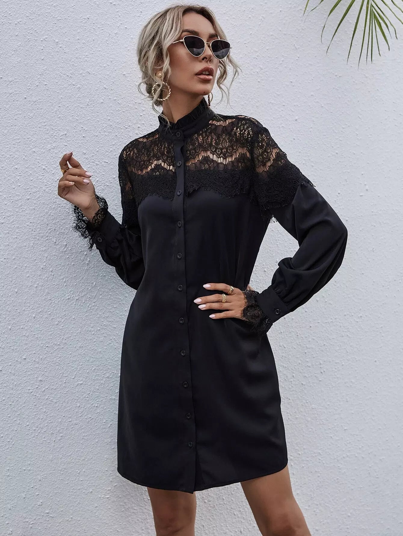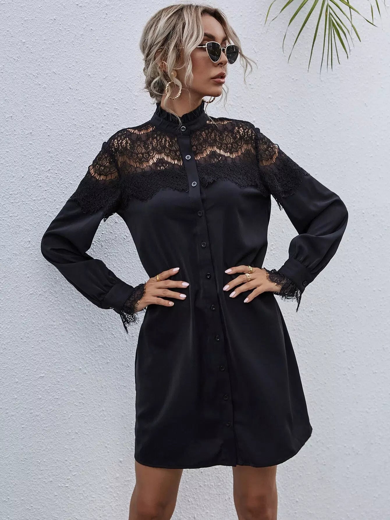 Contrast Lace Frill Trim Shirt Dress