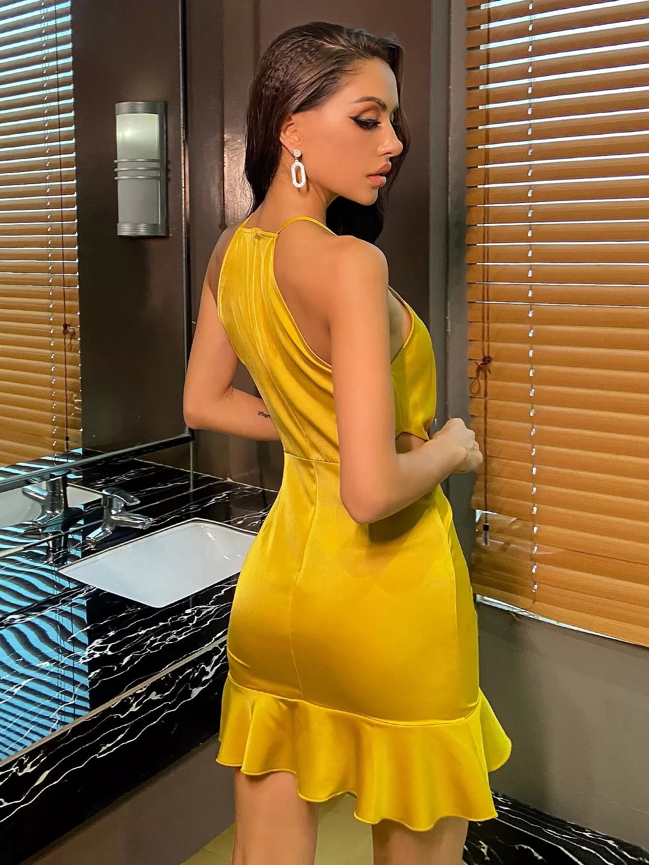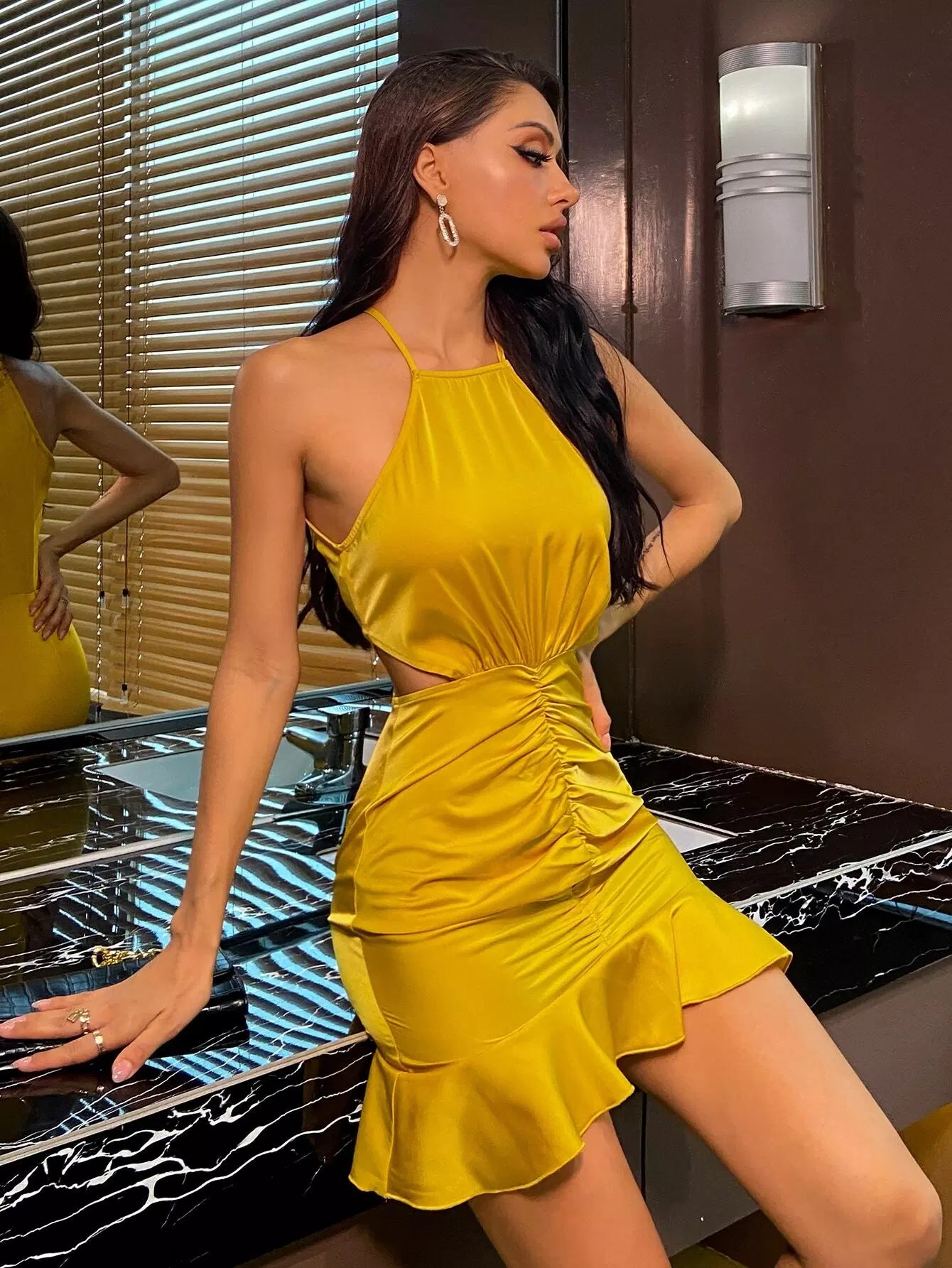 Women - Cut Out Ruffle Hem Ruched Satin Dress