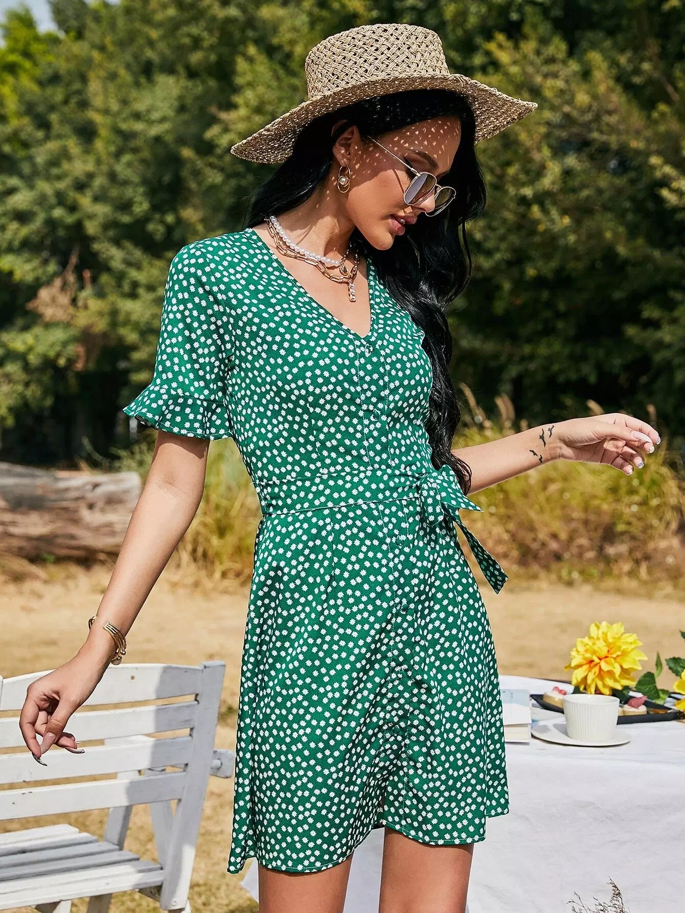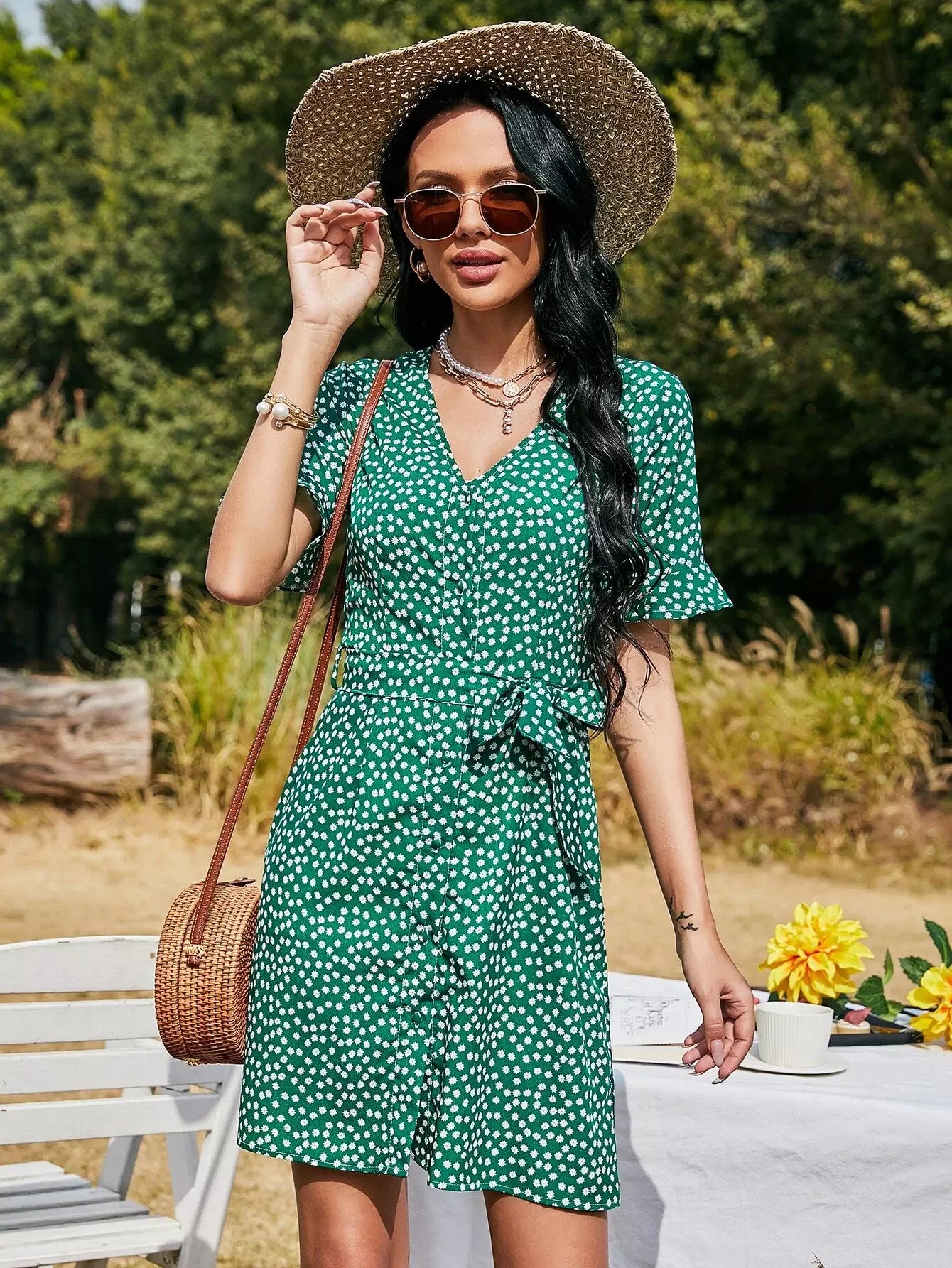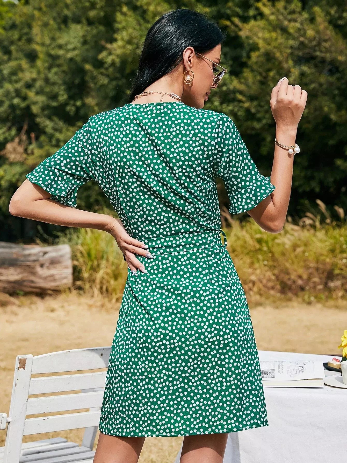 Ditsy Floral Self Tie Flounce Sleeve Dress