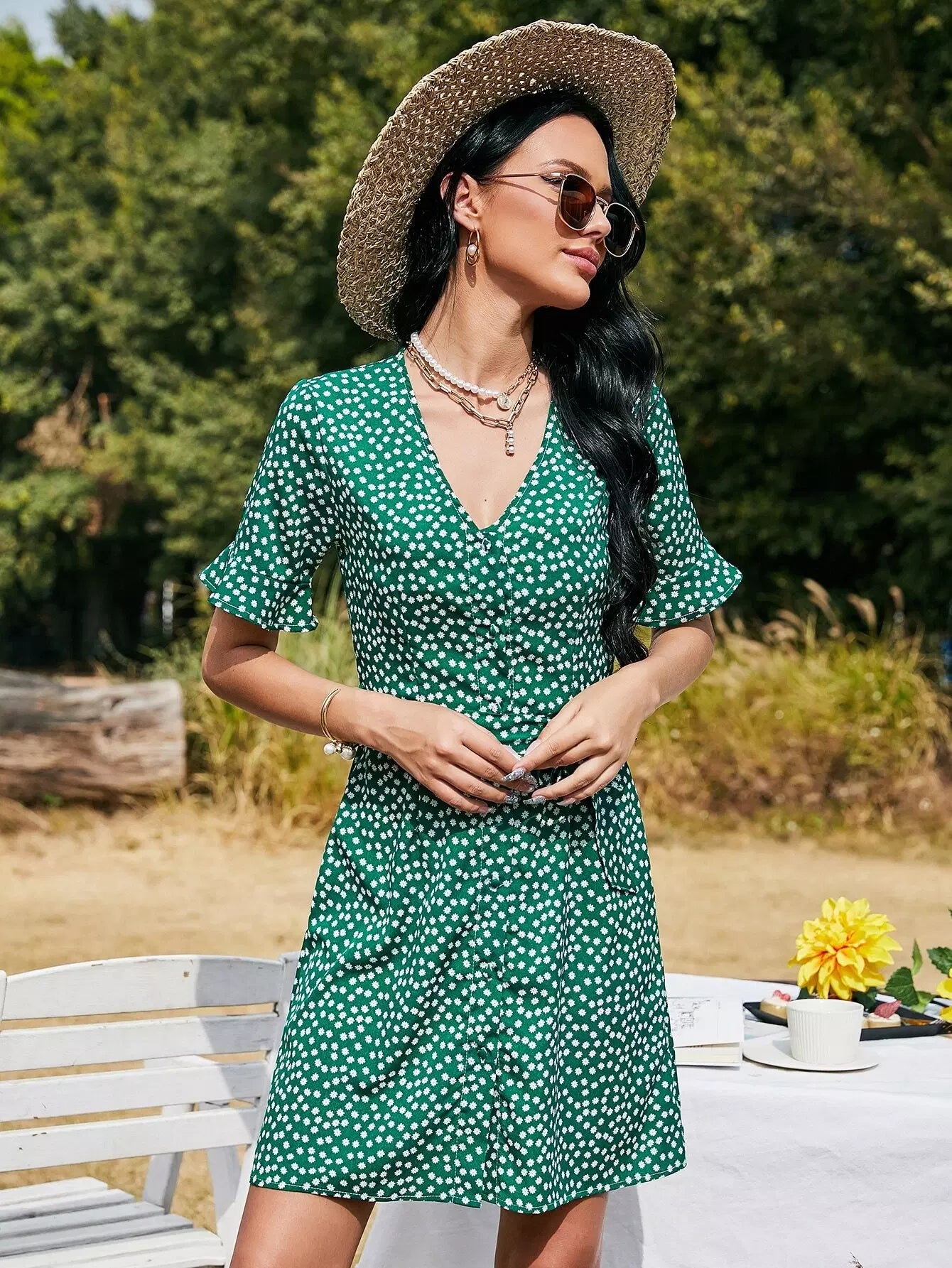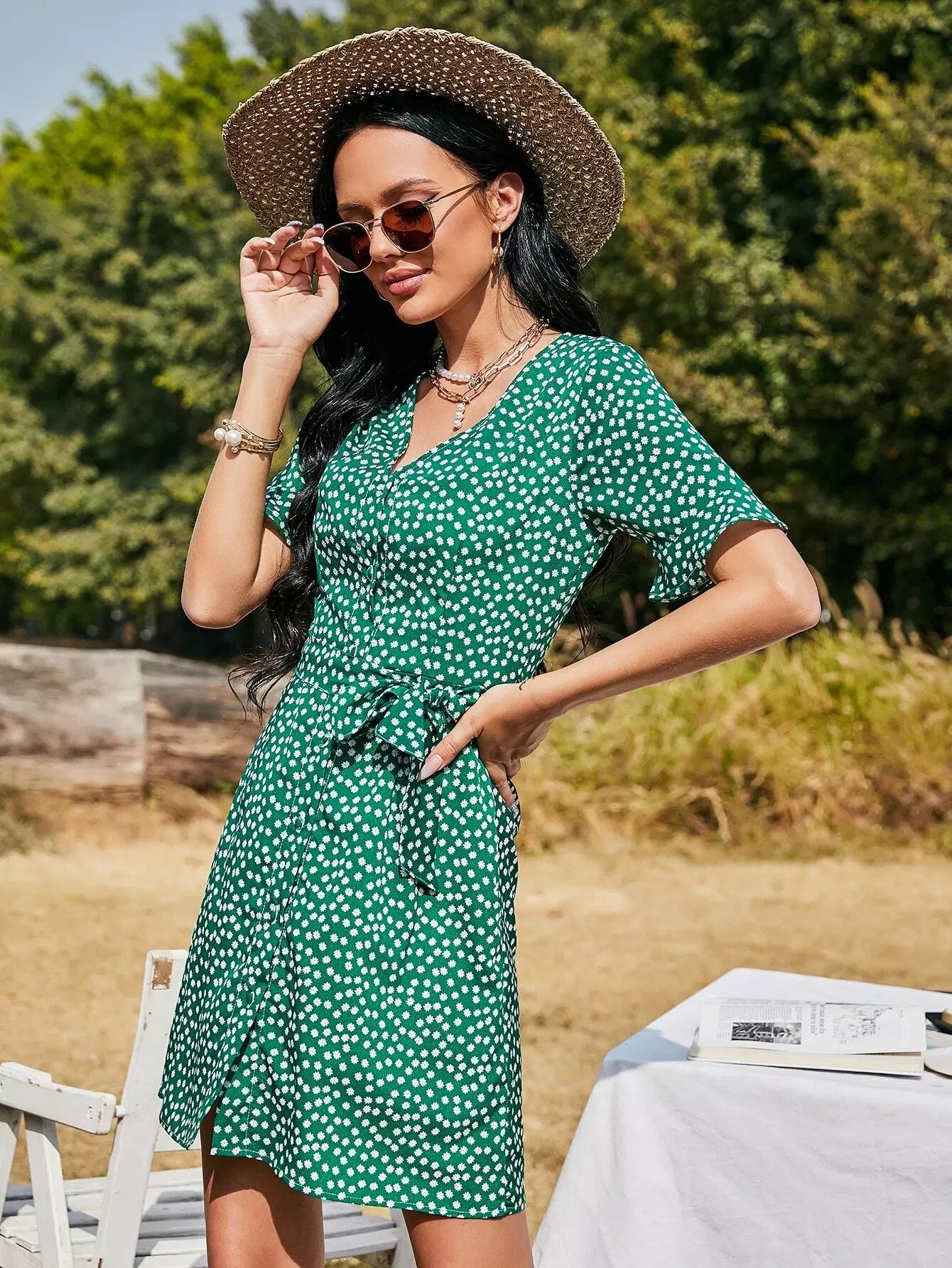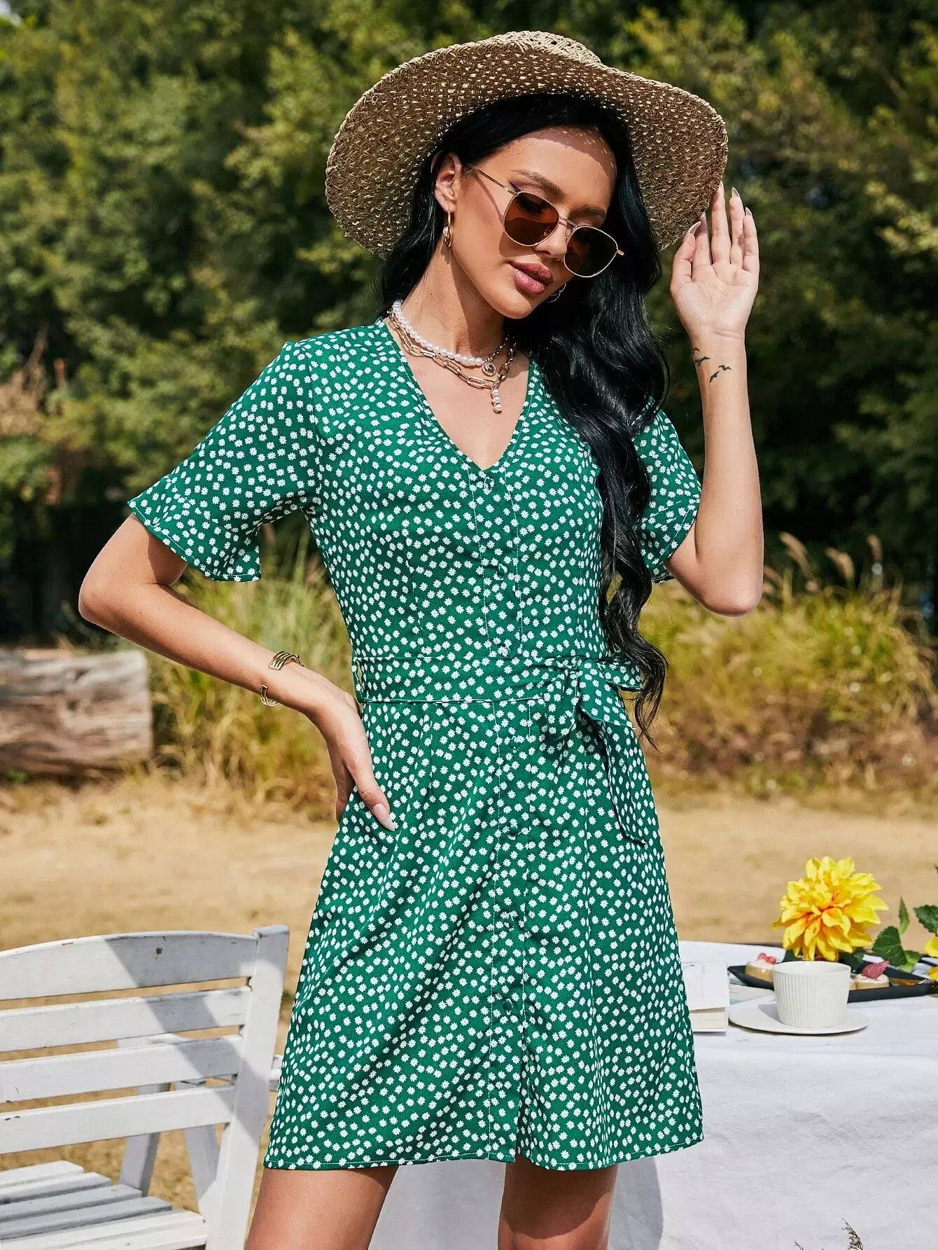 Ditsy Floral Self Tie Flounce Sleeve Dress