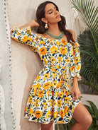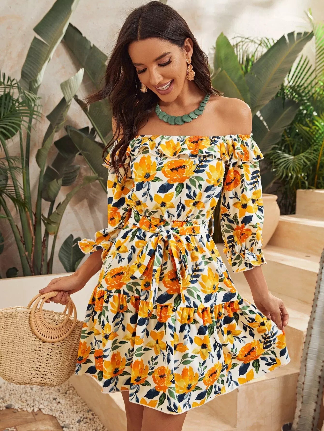 Women - Floral Off Shoulder Belted Ruffle Hem Dress