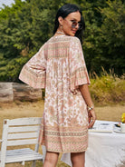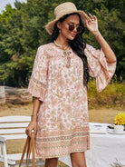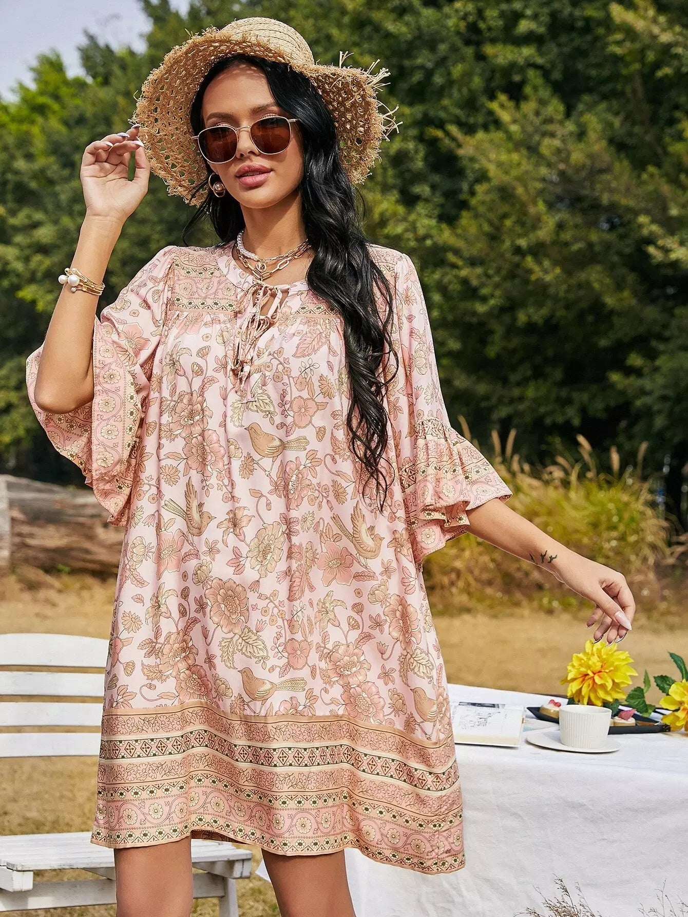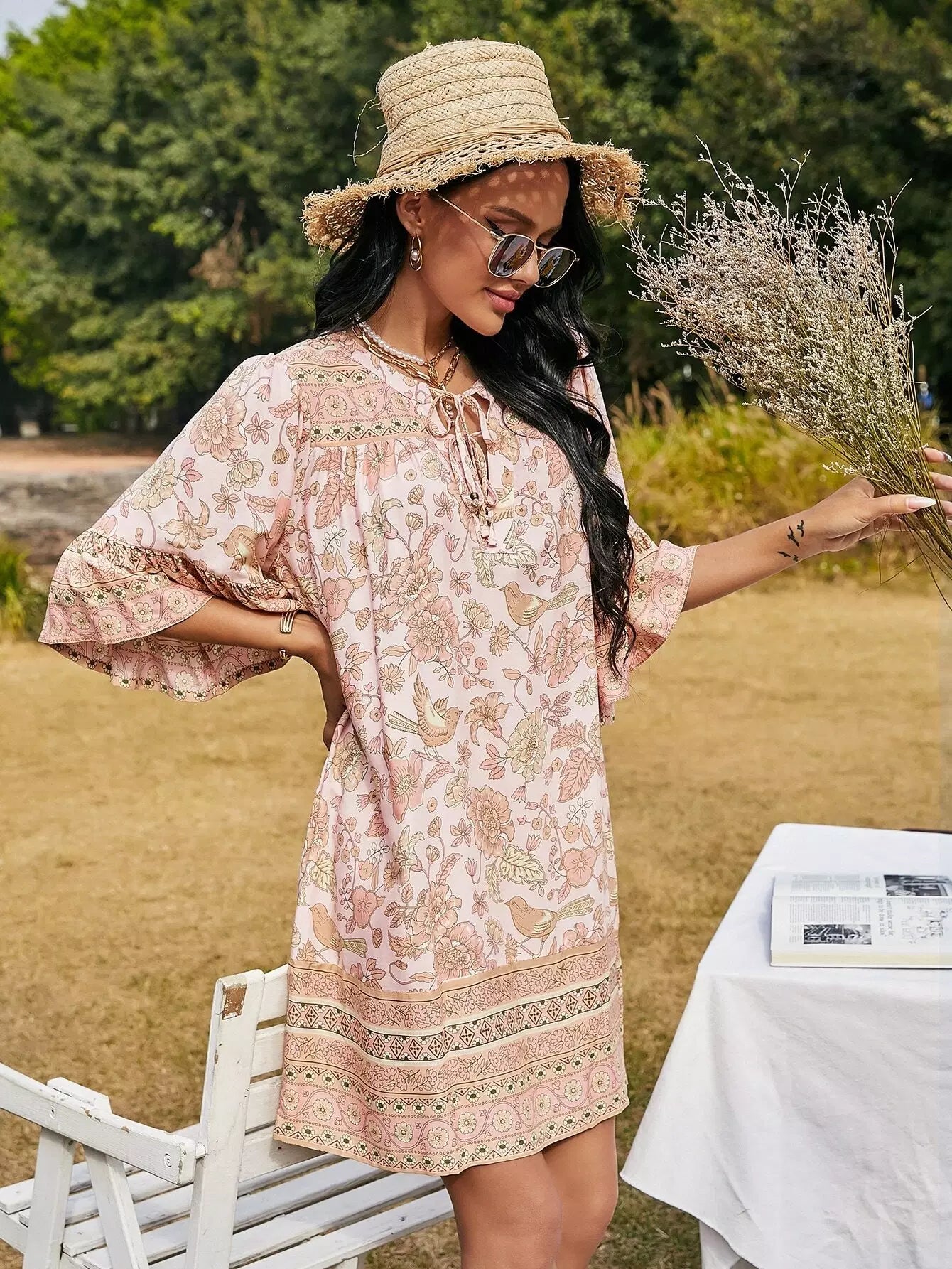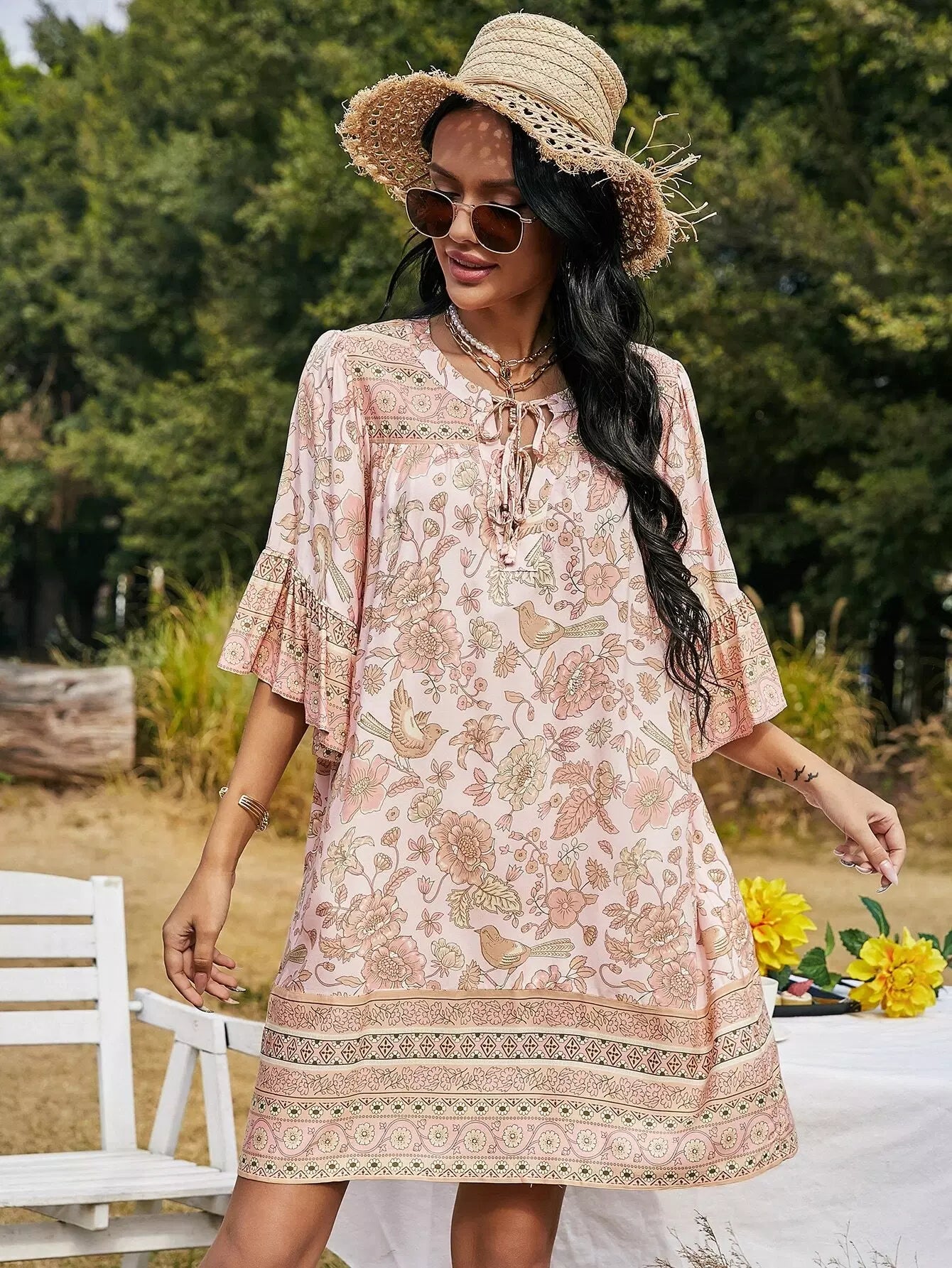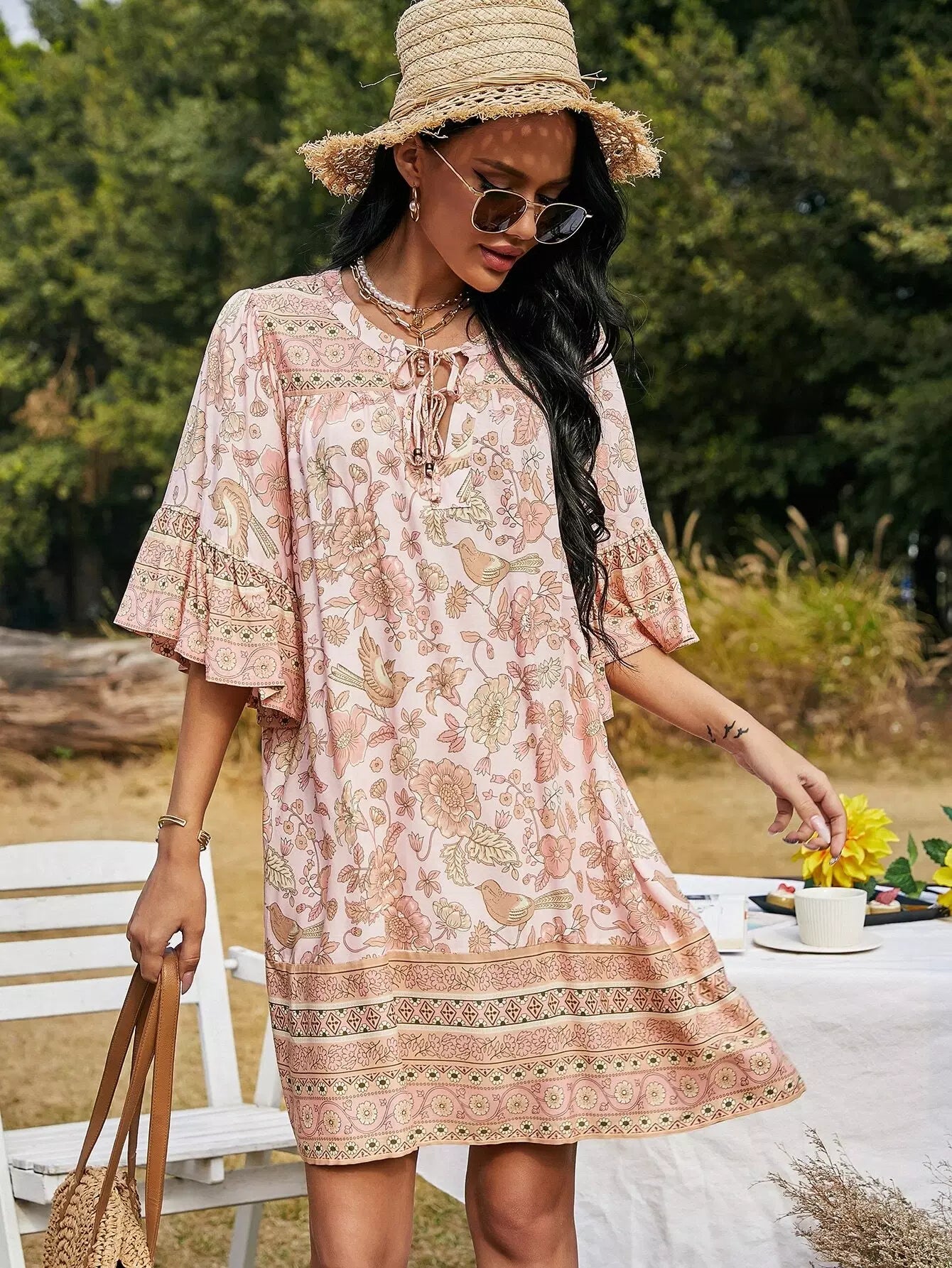 Floral Tie Neck Flounce Sleeve Tunic Dress