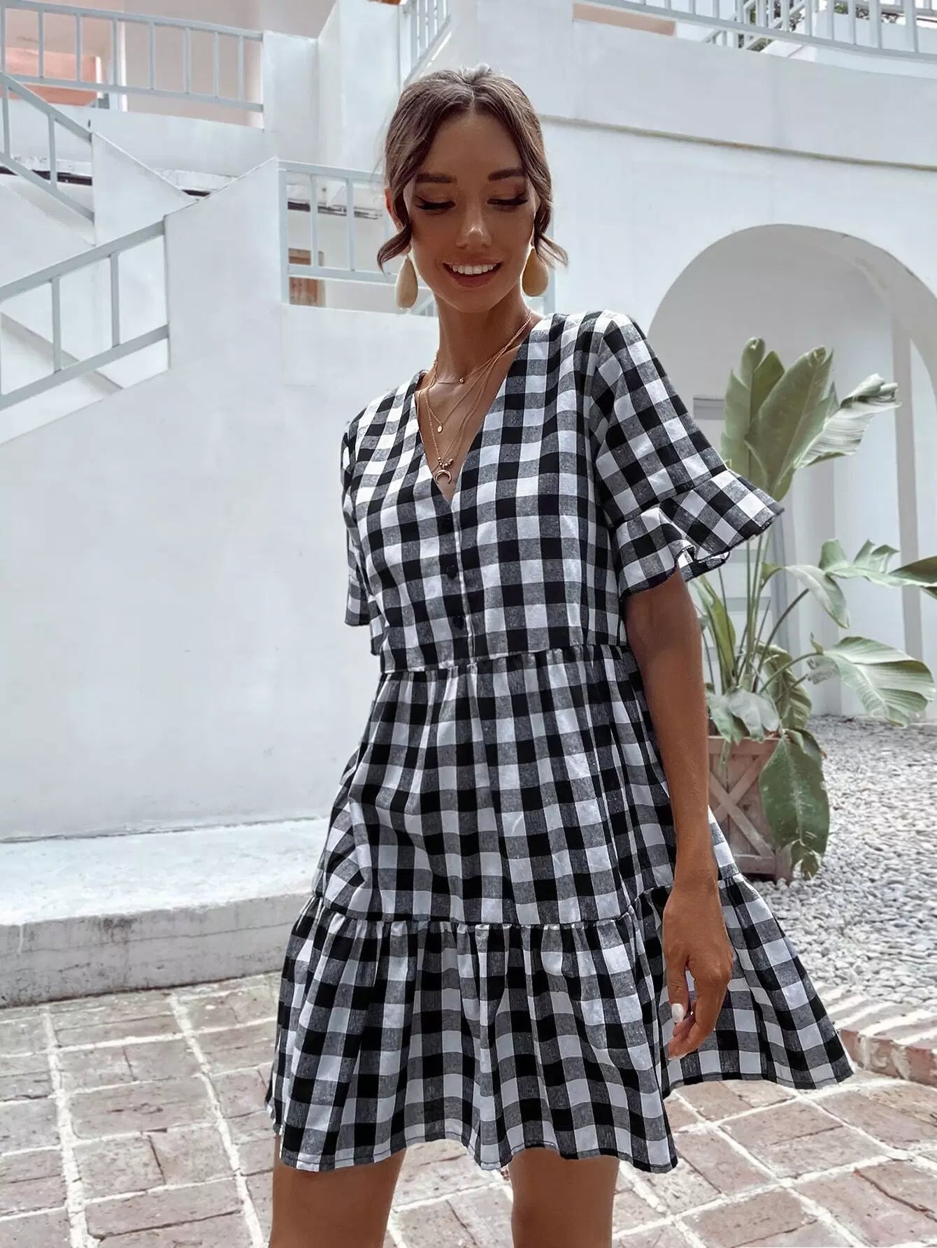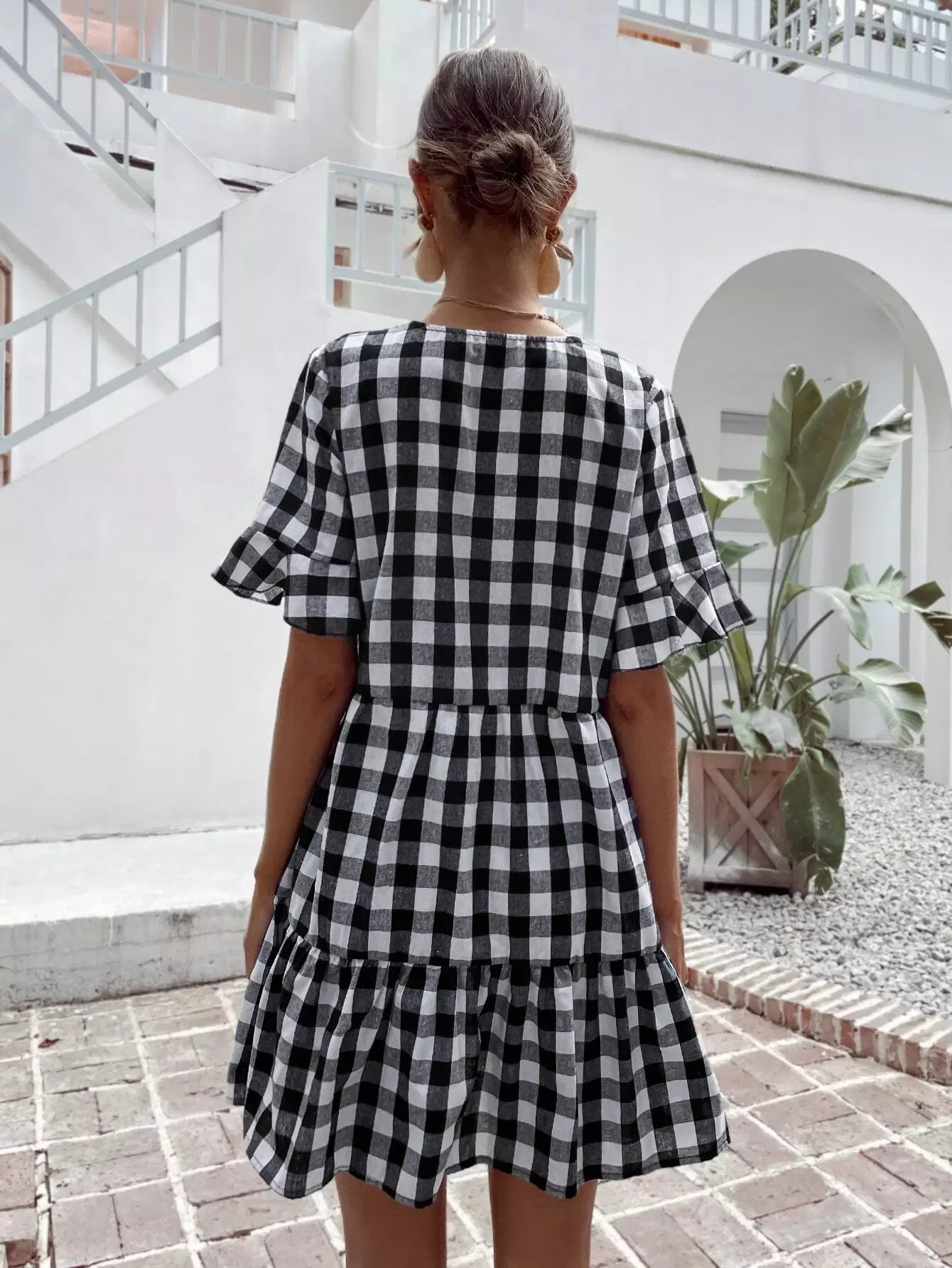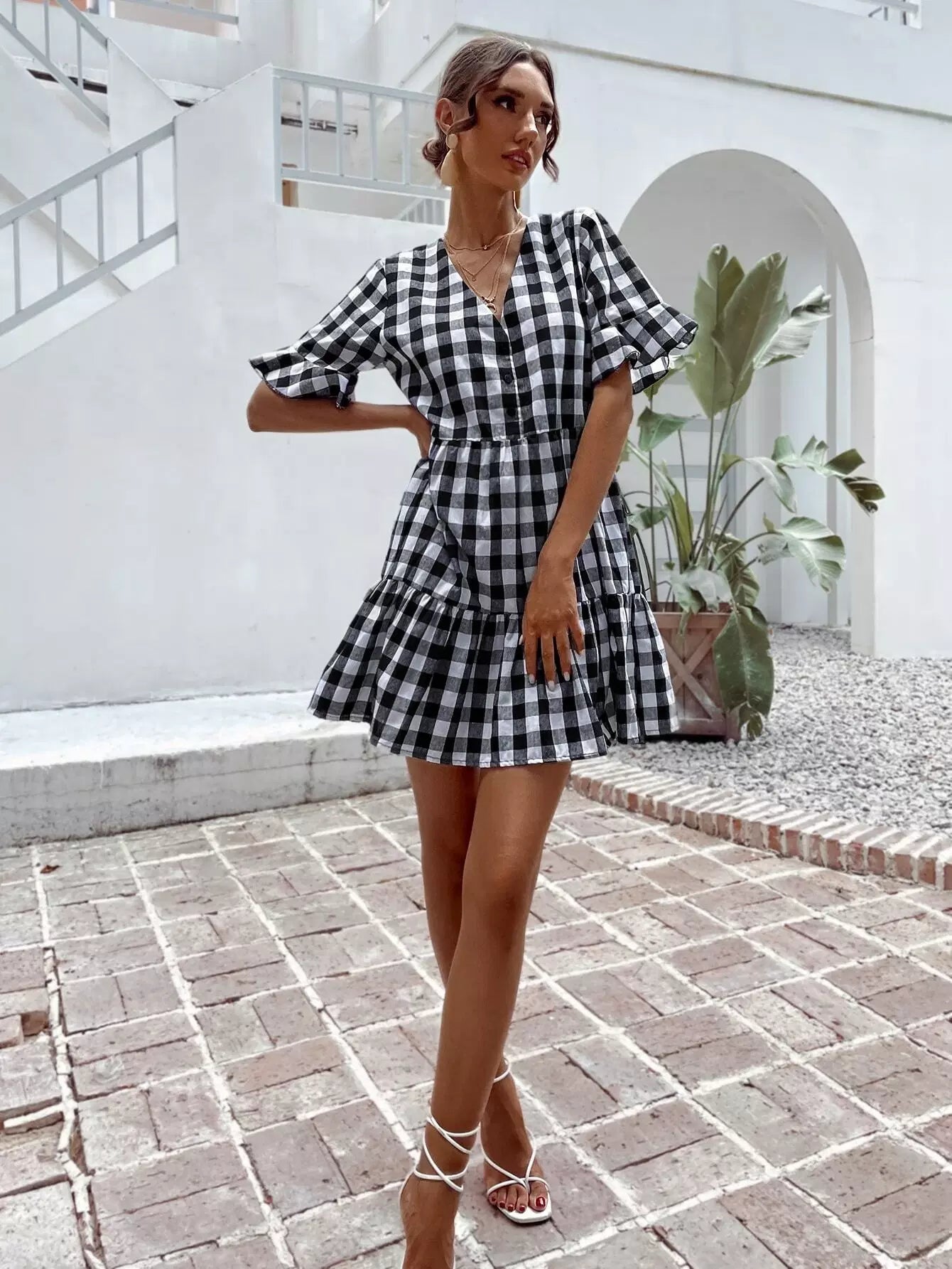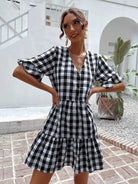 Gingham Print Flounce Sleeve Smock Dress