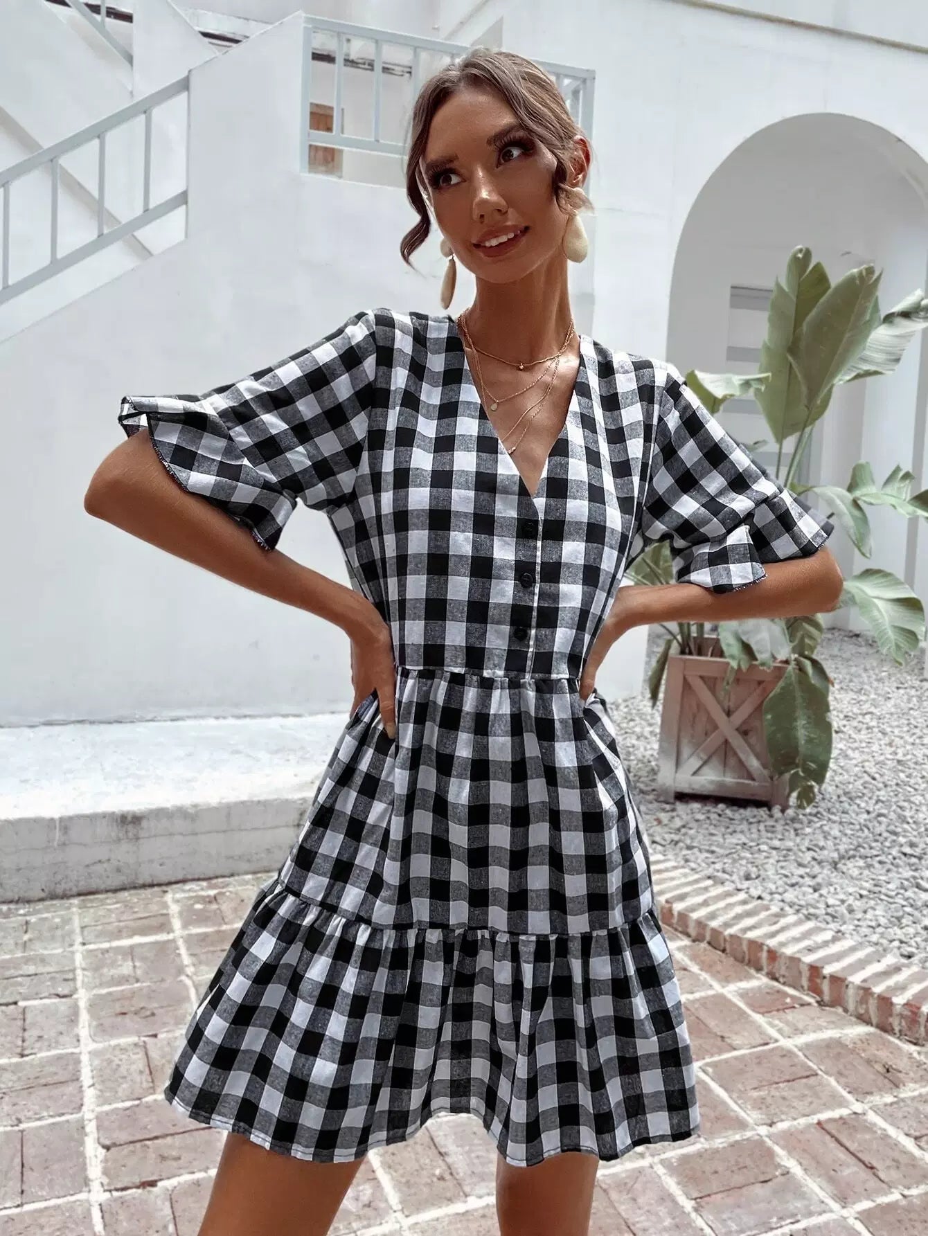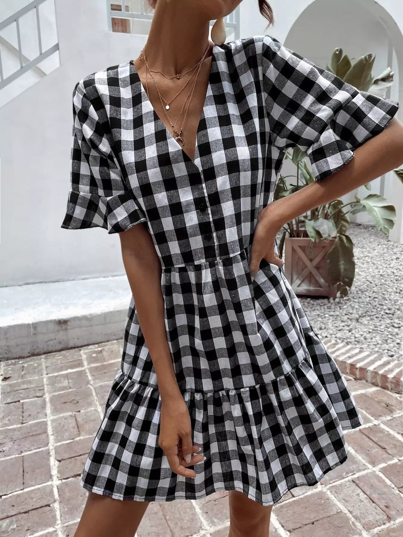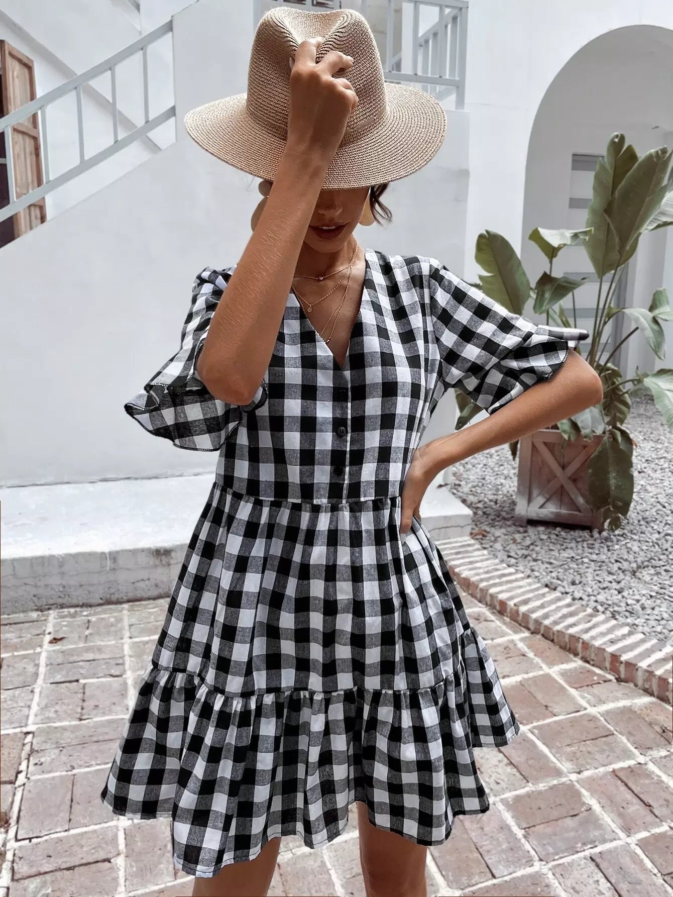 Gingham Print Flounce Sleeve Smock Dress