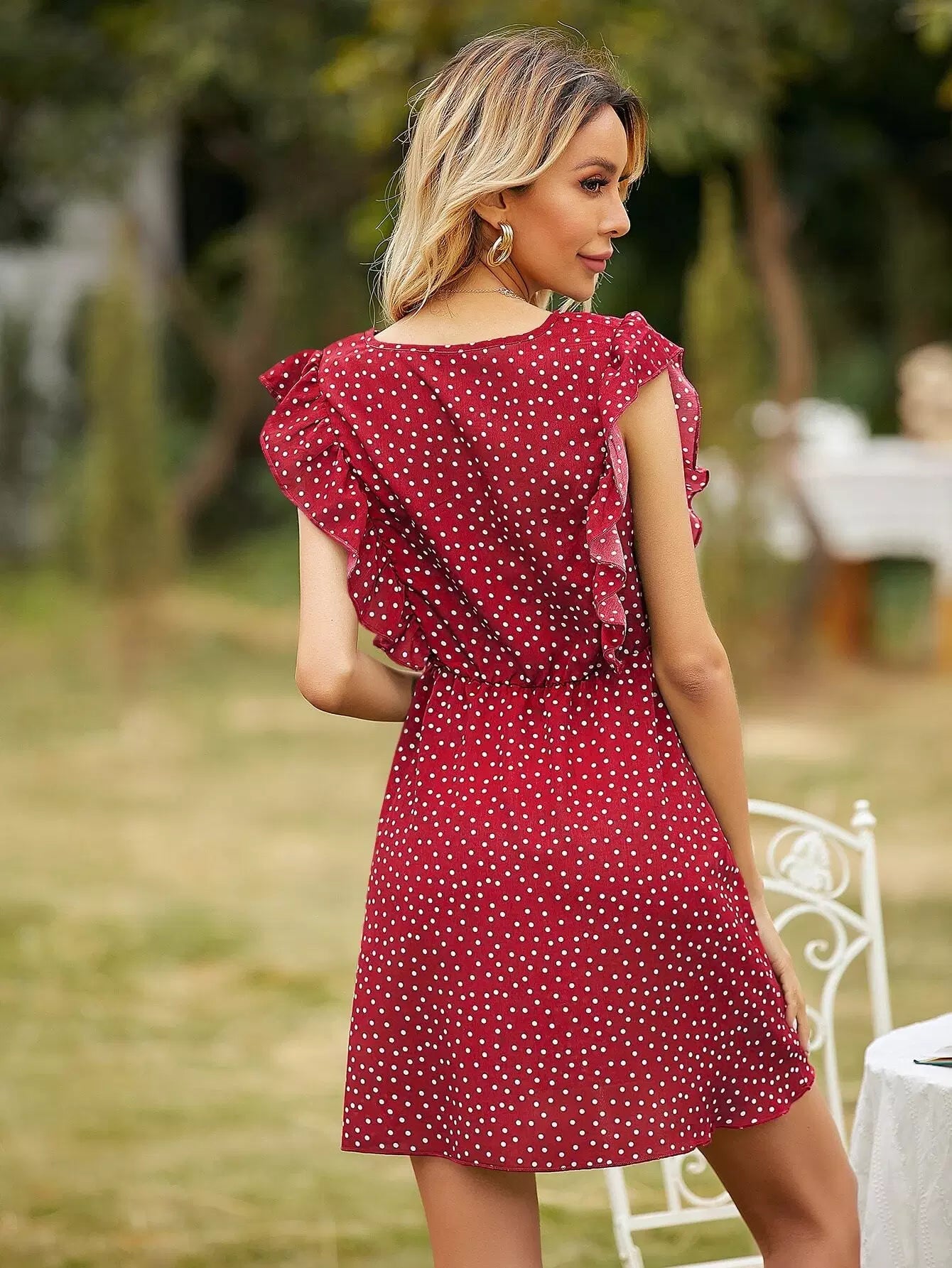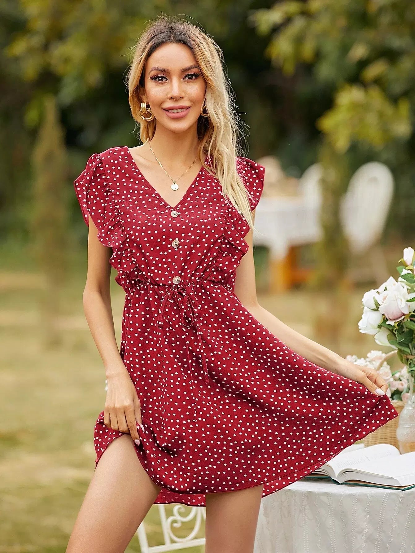 Half Button Polka Dot Ruffle Trim Dress