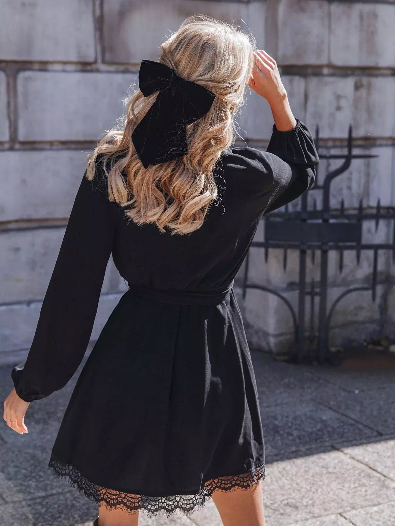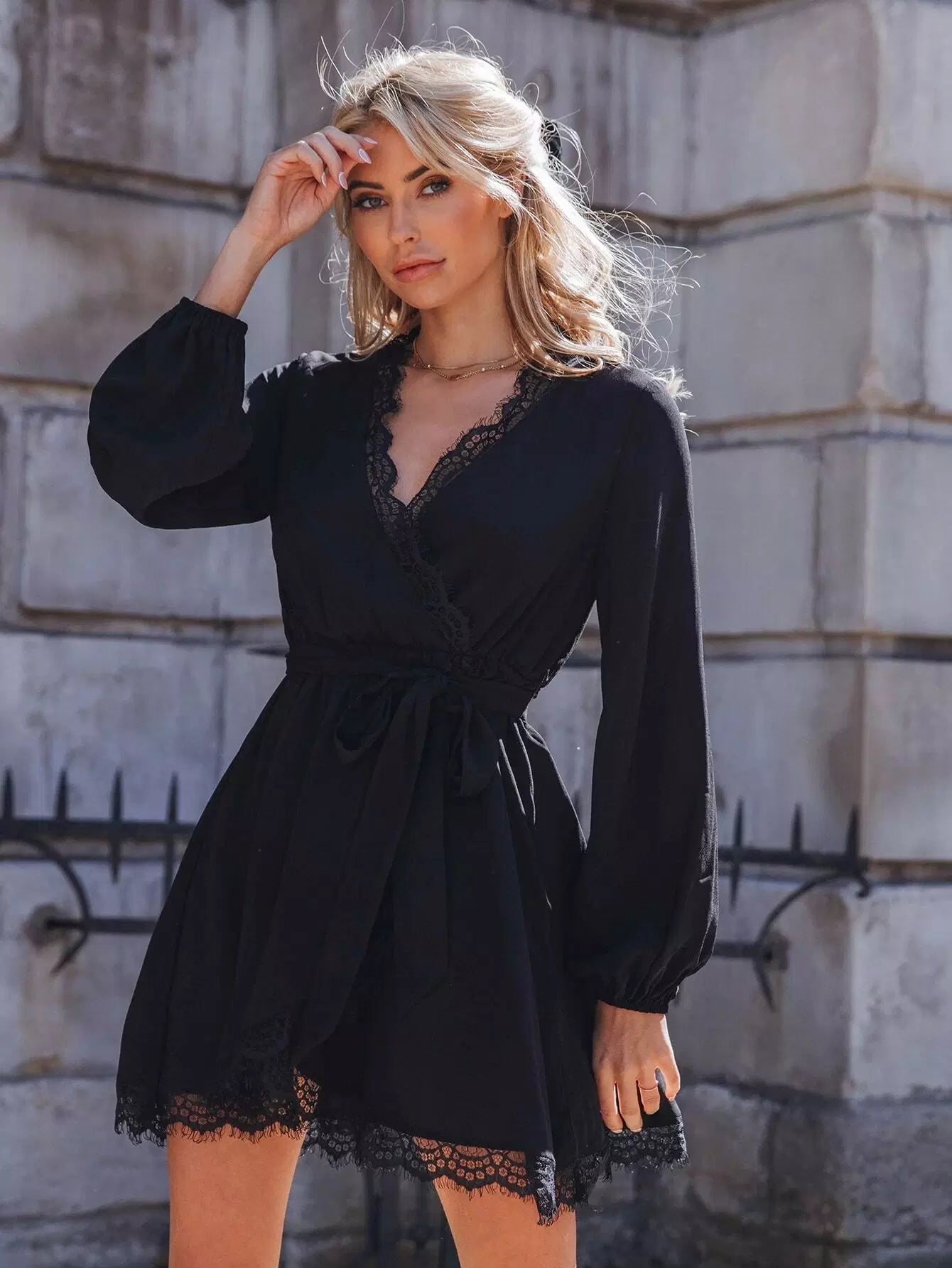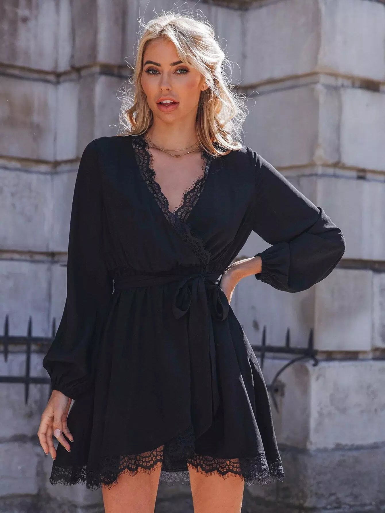 Lantern Sleeve Eyelash Lace Trim Dress Without Belt