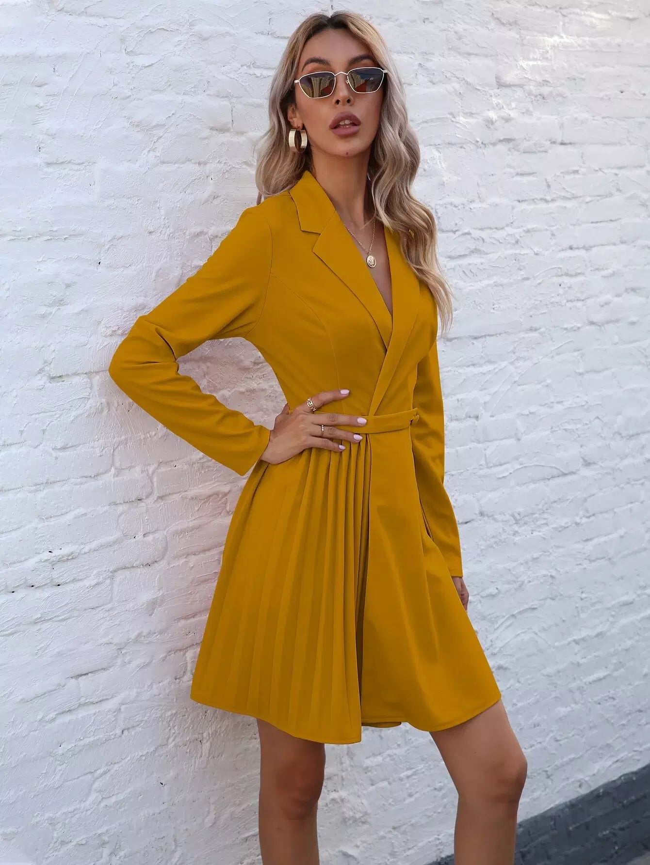 Lapel Neck Pleated Detail Dress