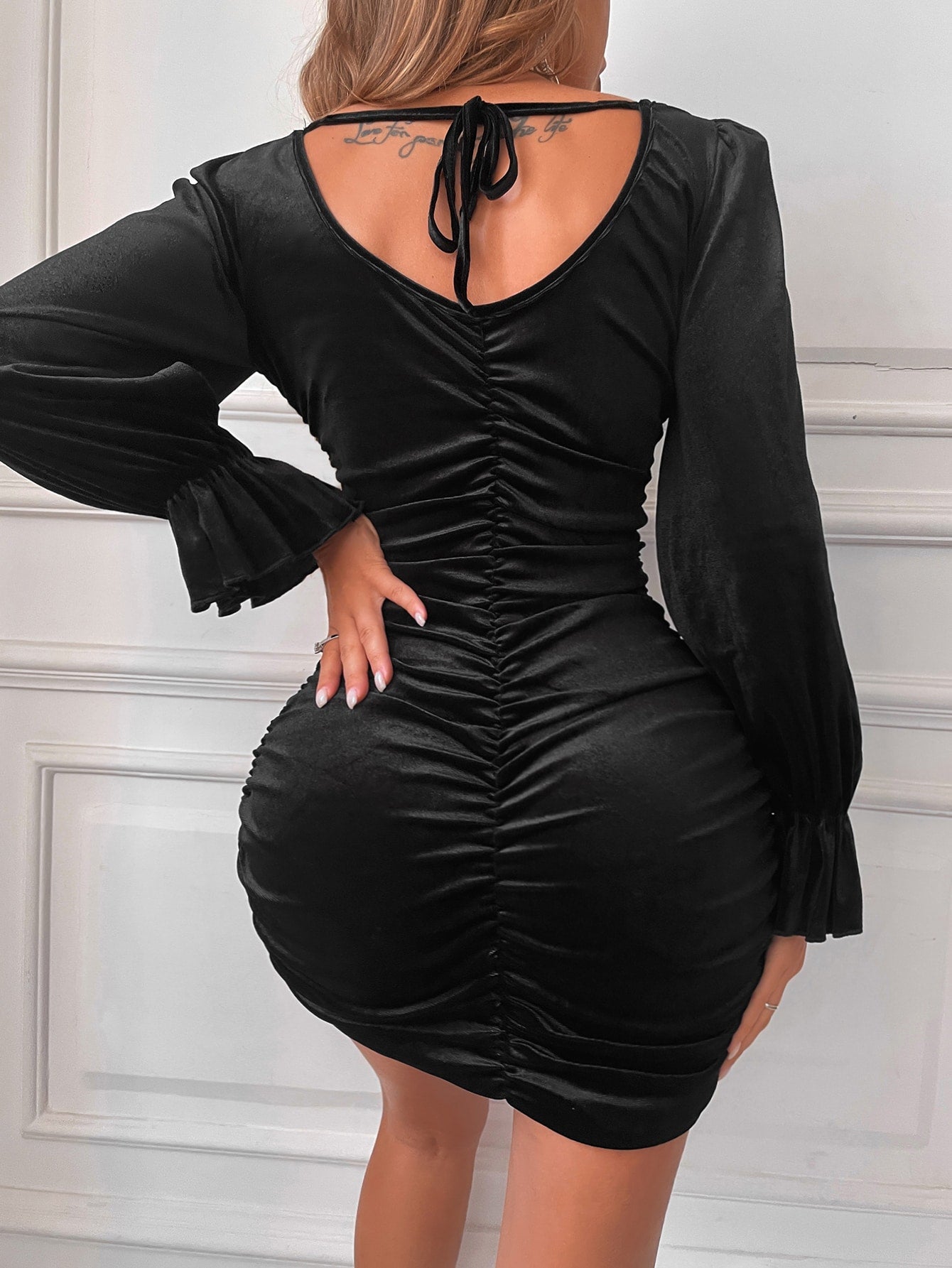 Flounce Sleeve Square Neck Ruched Tie Back Velvet Bodycon Dress