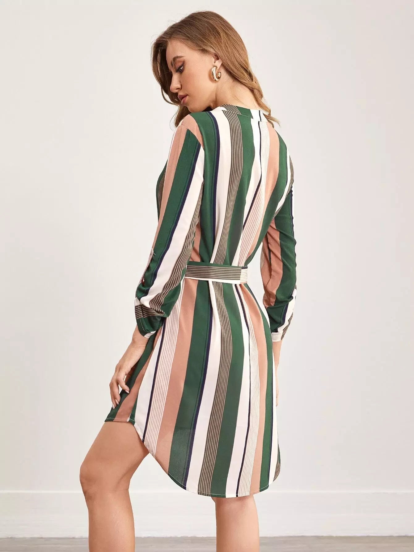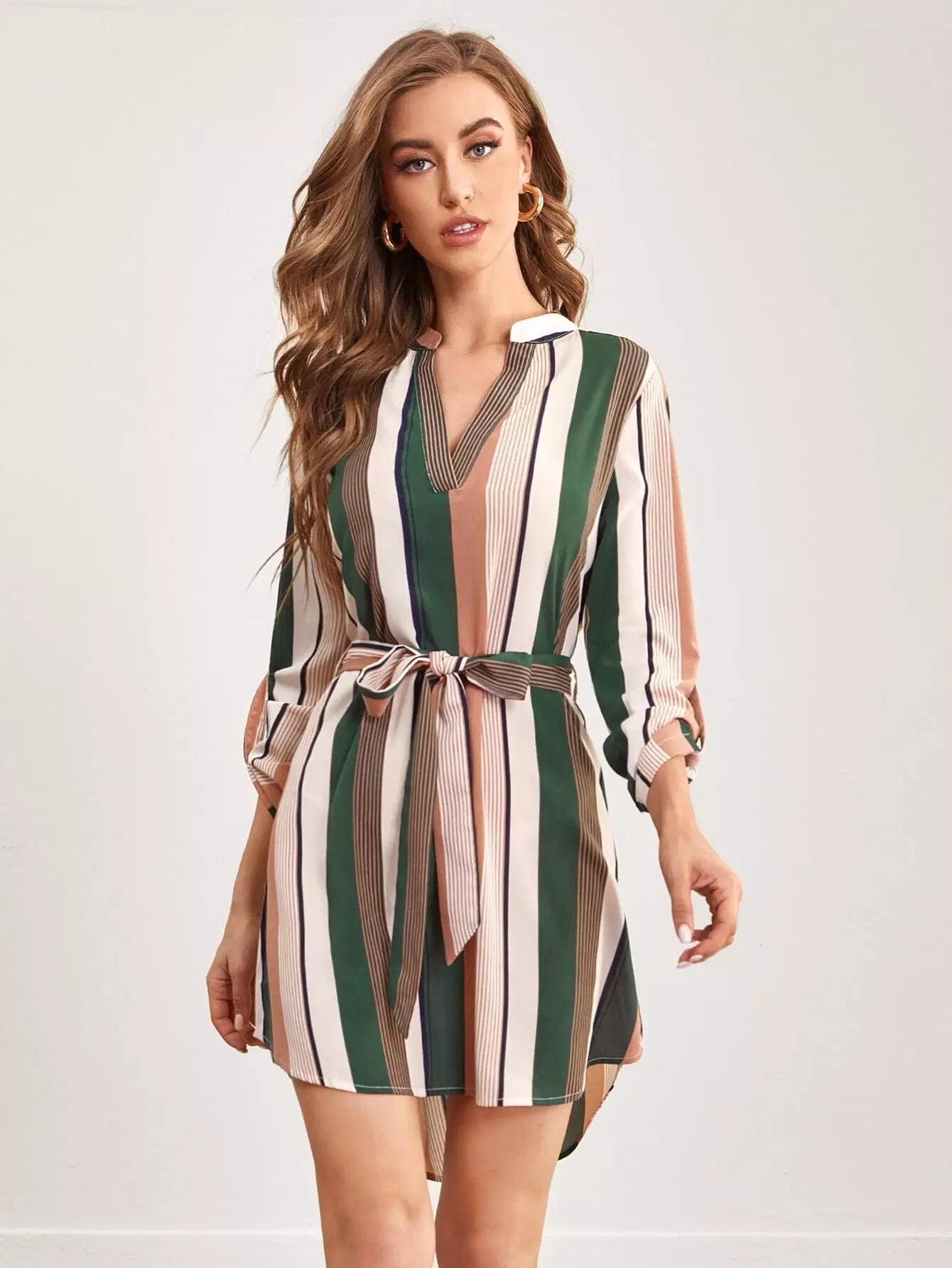 Notch Neck Rolled Tab Sleeve Dip Hem Dress