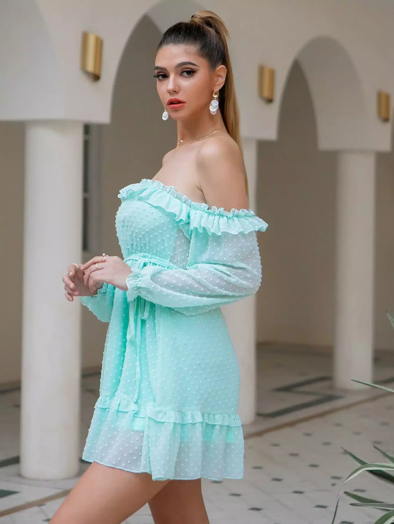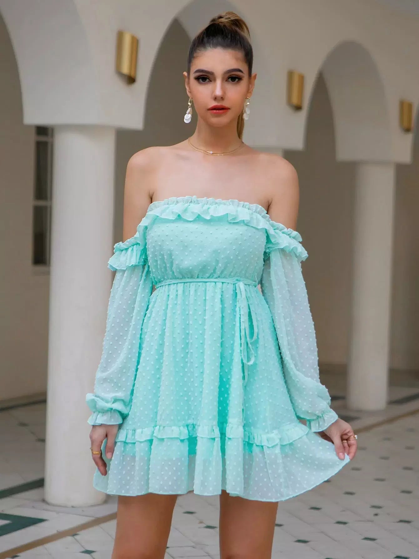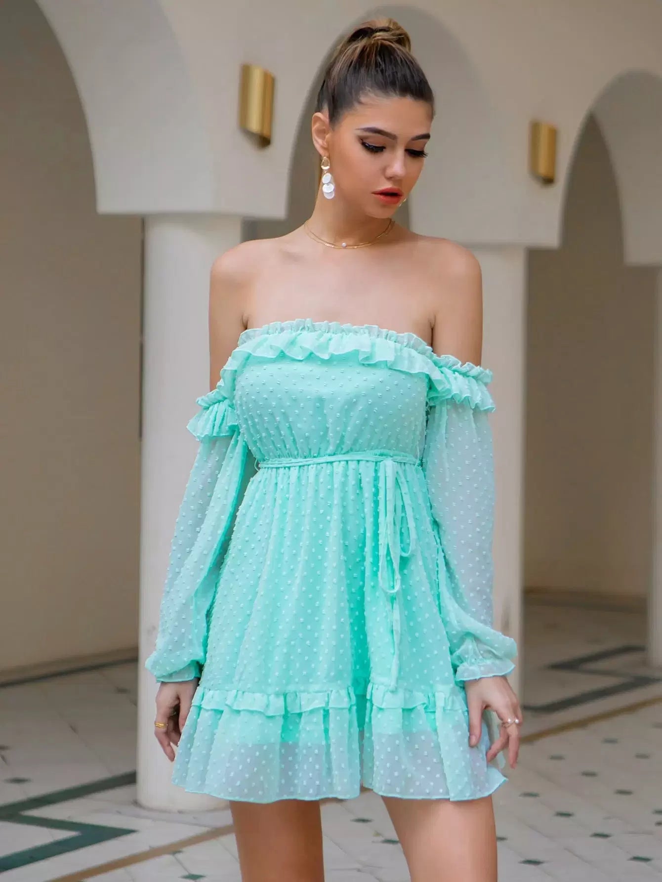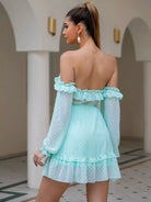 Off Shoulder Frill Trim Swiss Dot Chiffon Dress