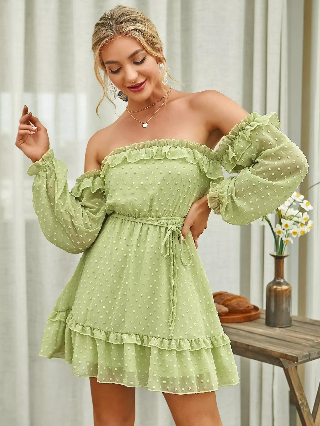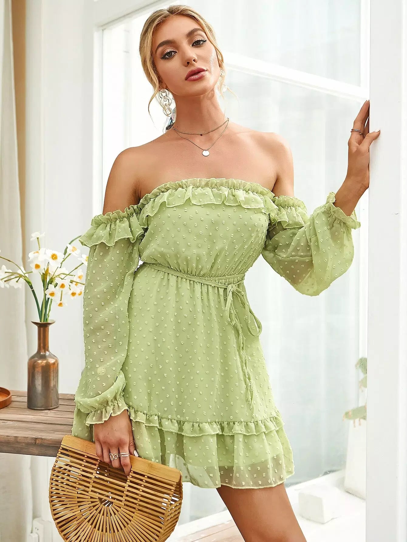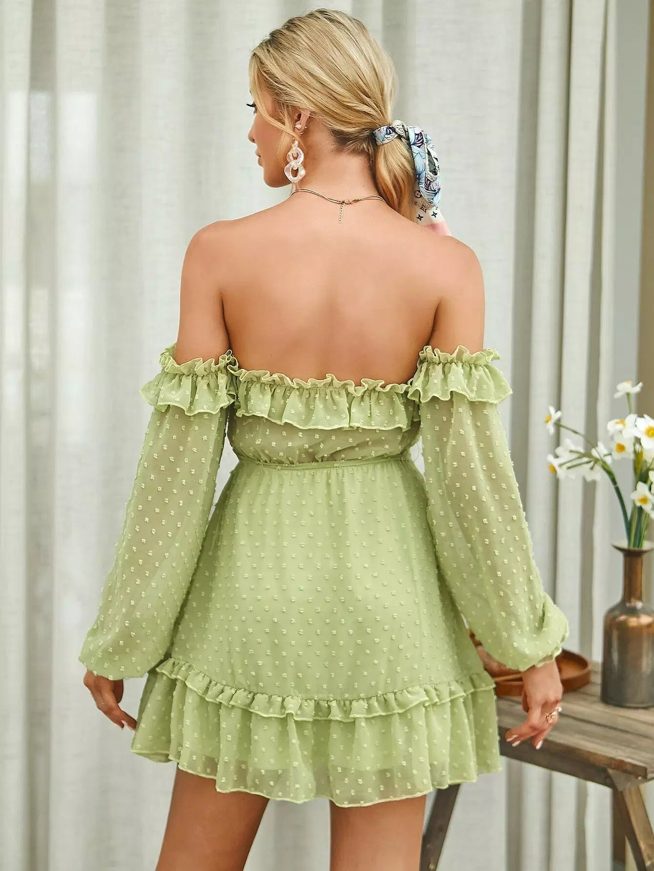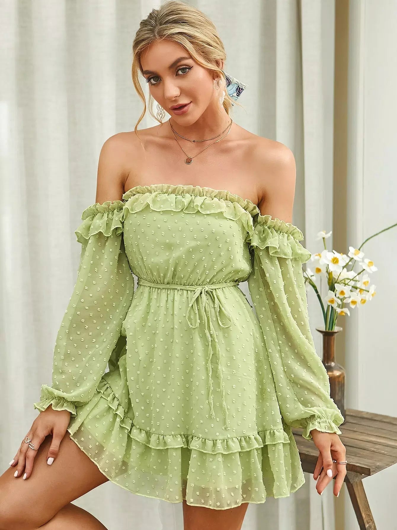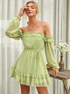 Off Shoulder Frill Trim Swiss Dot Chiffon Dress