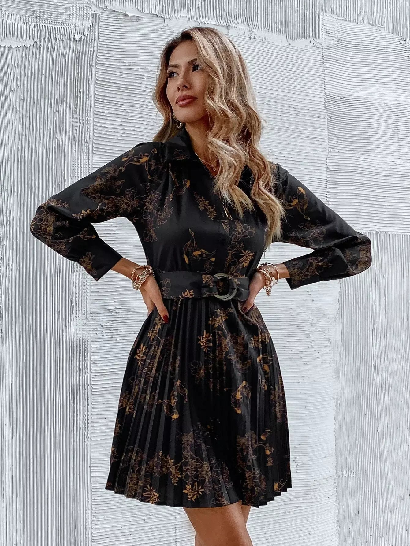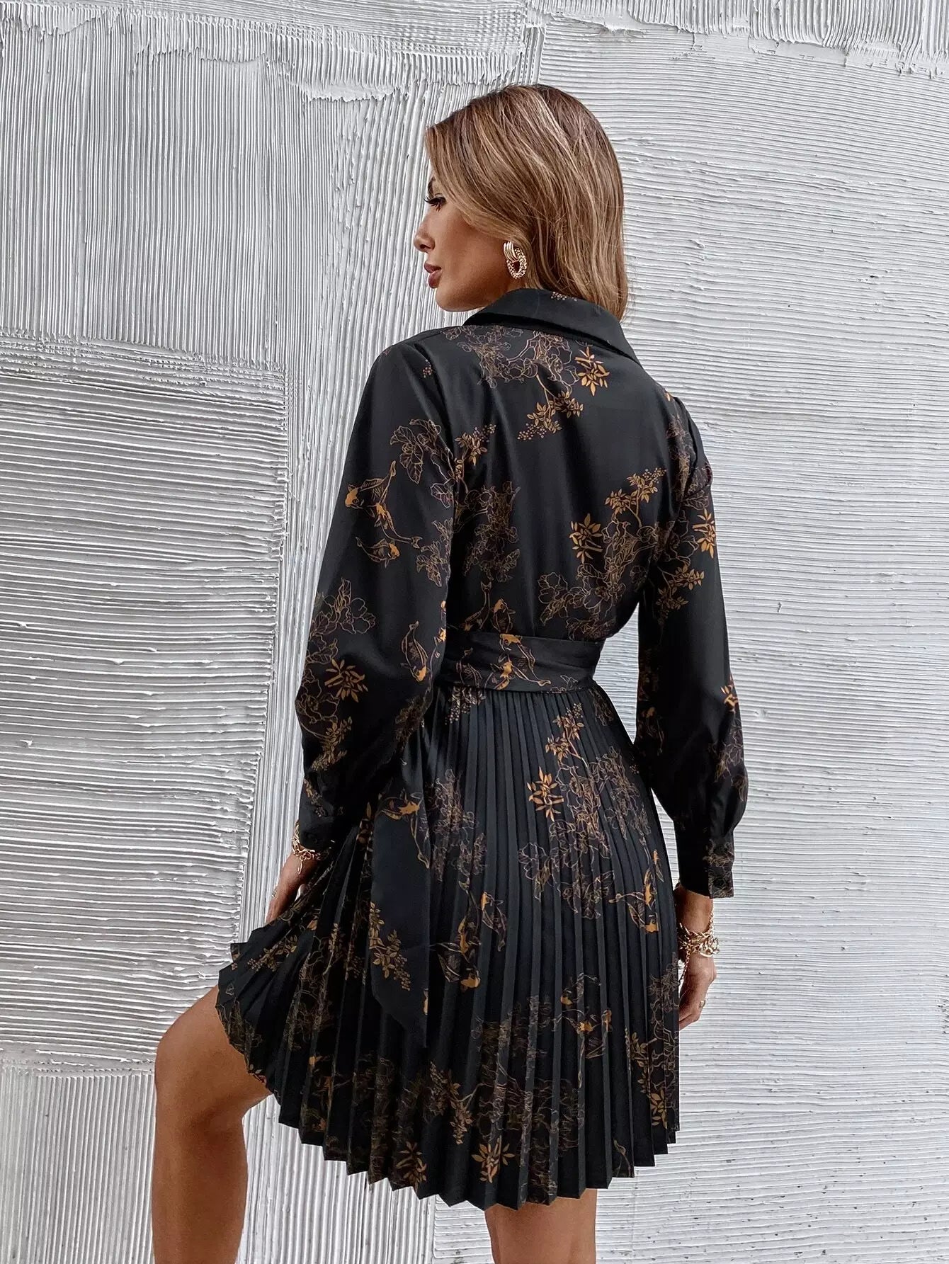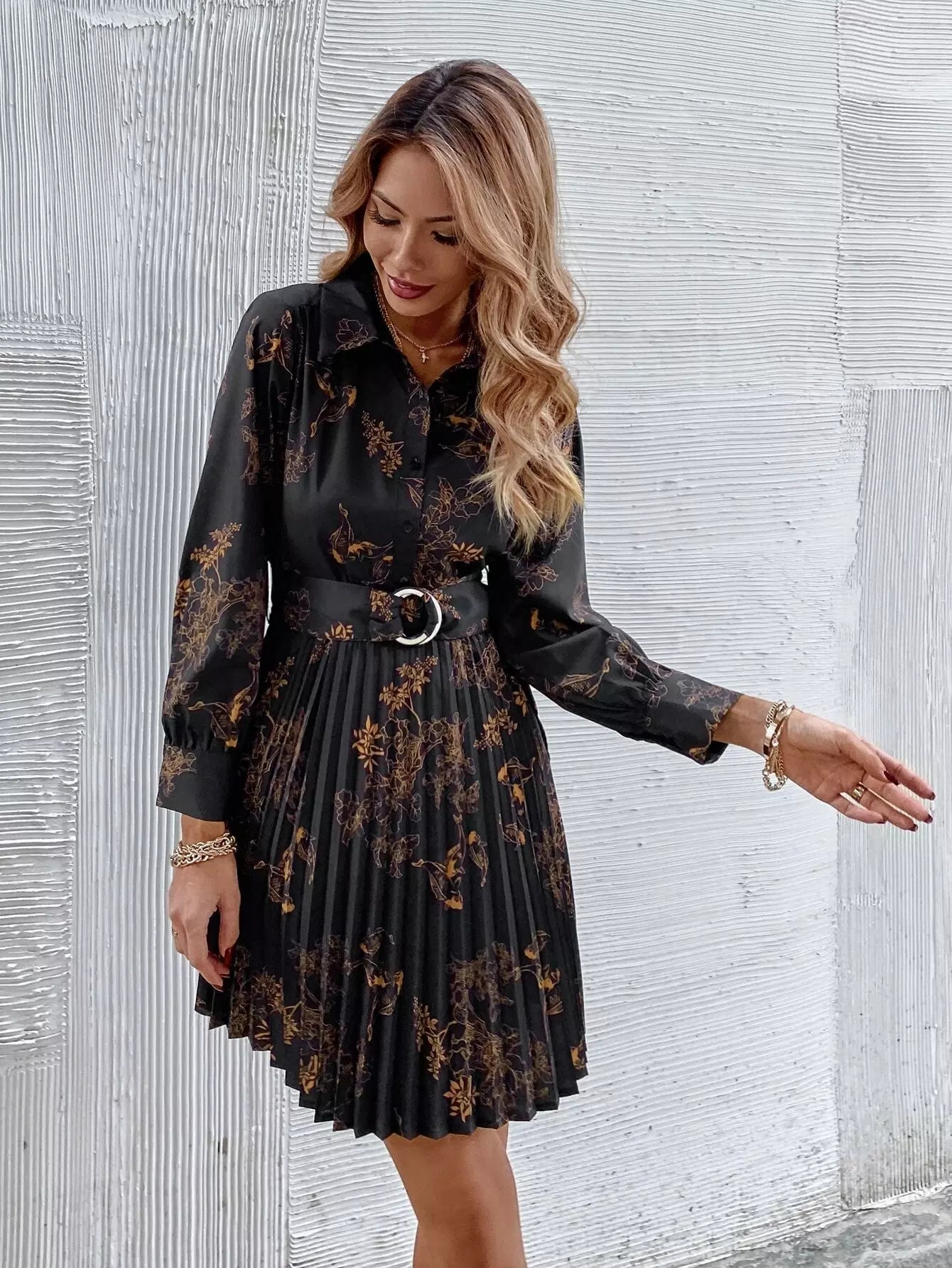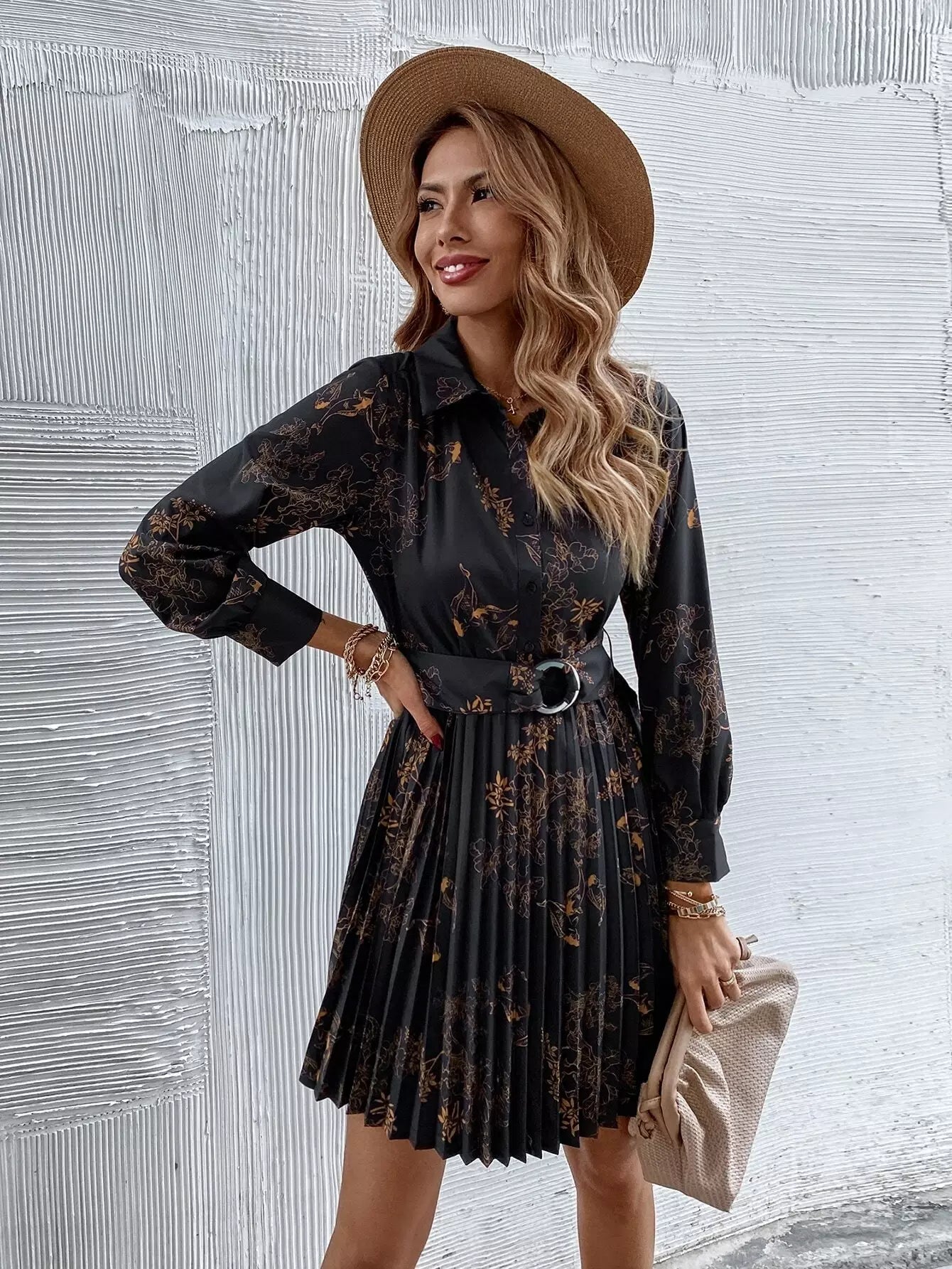 Plants Print Pleated Hem Shirt Dress Without Belt