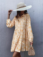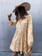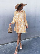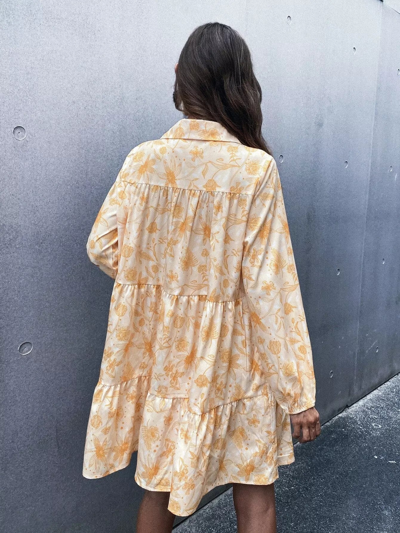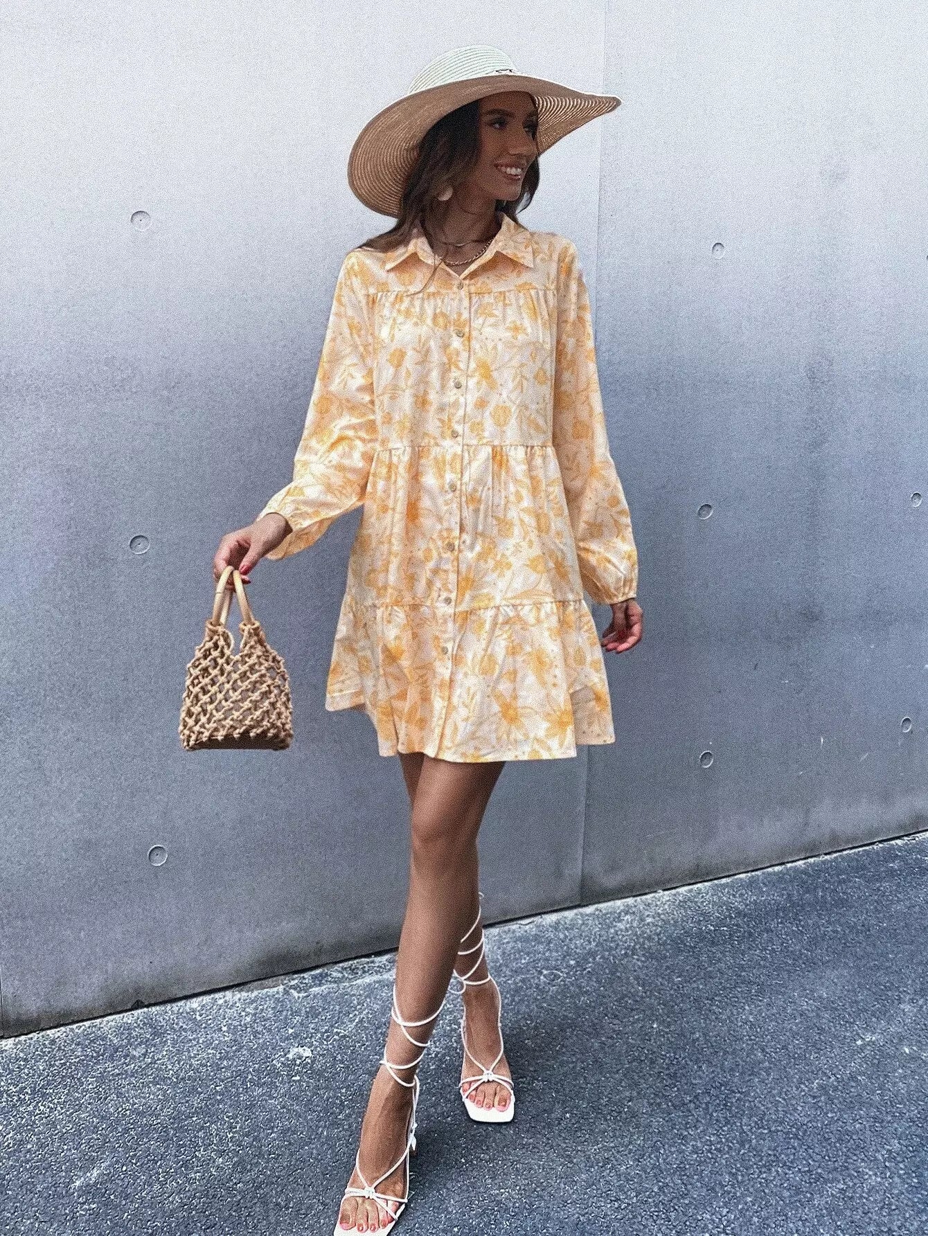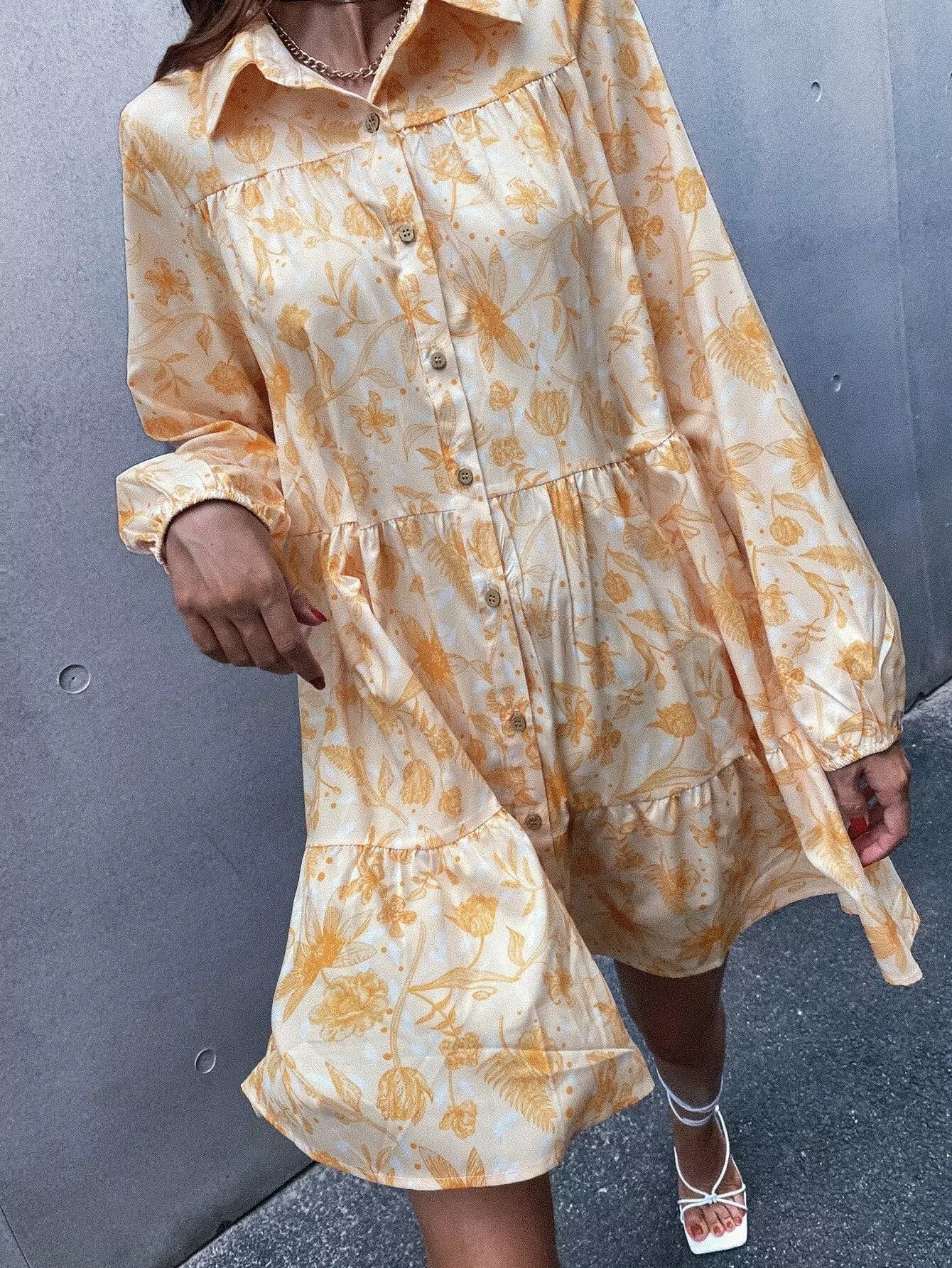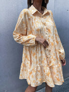 Plants Print Ruffle Hem Bishop Sleeve Shirt Dress