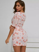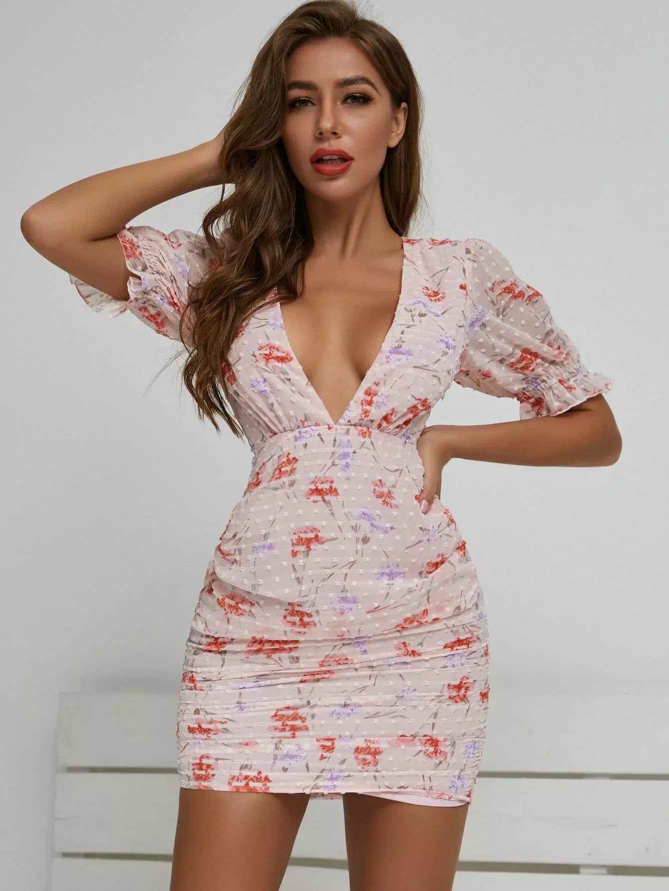 Plunging Neck Puff Sleeve Swiss Dot Floral Chiffon Dress