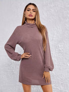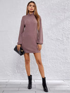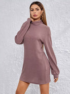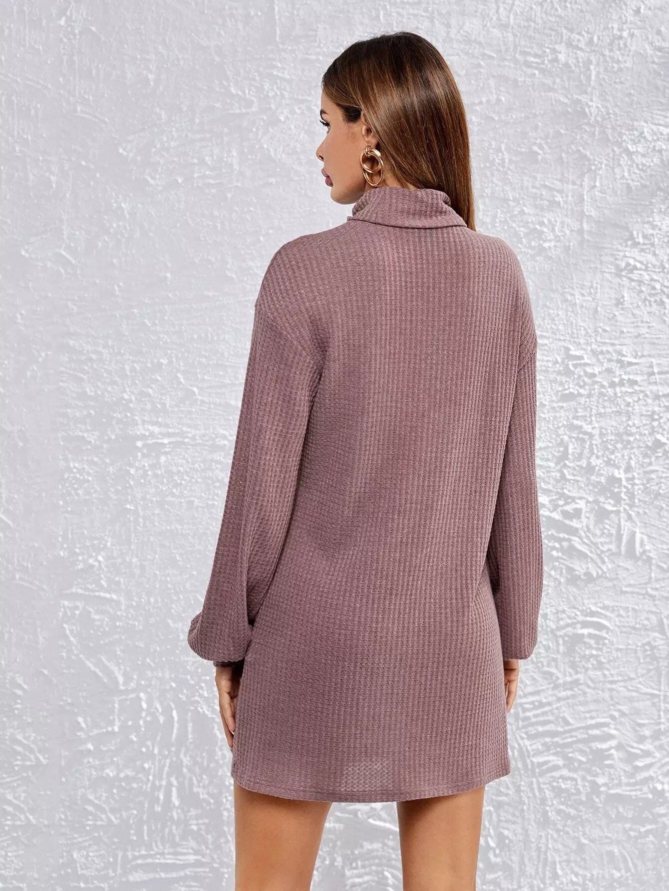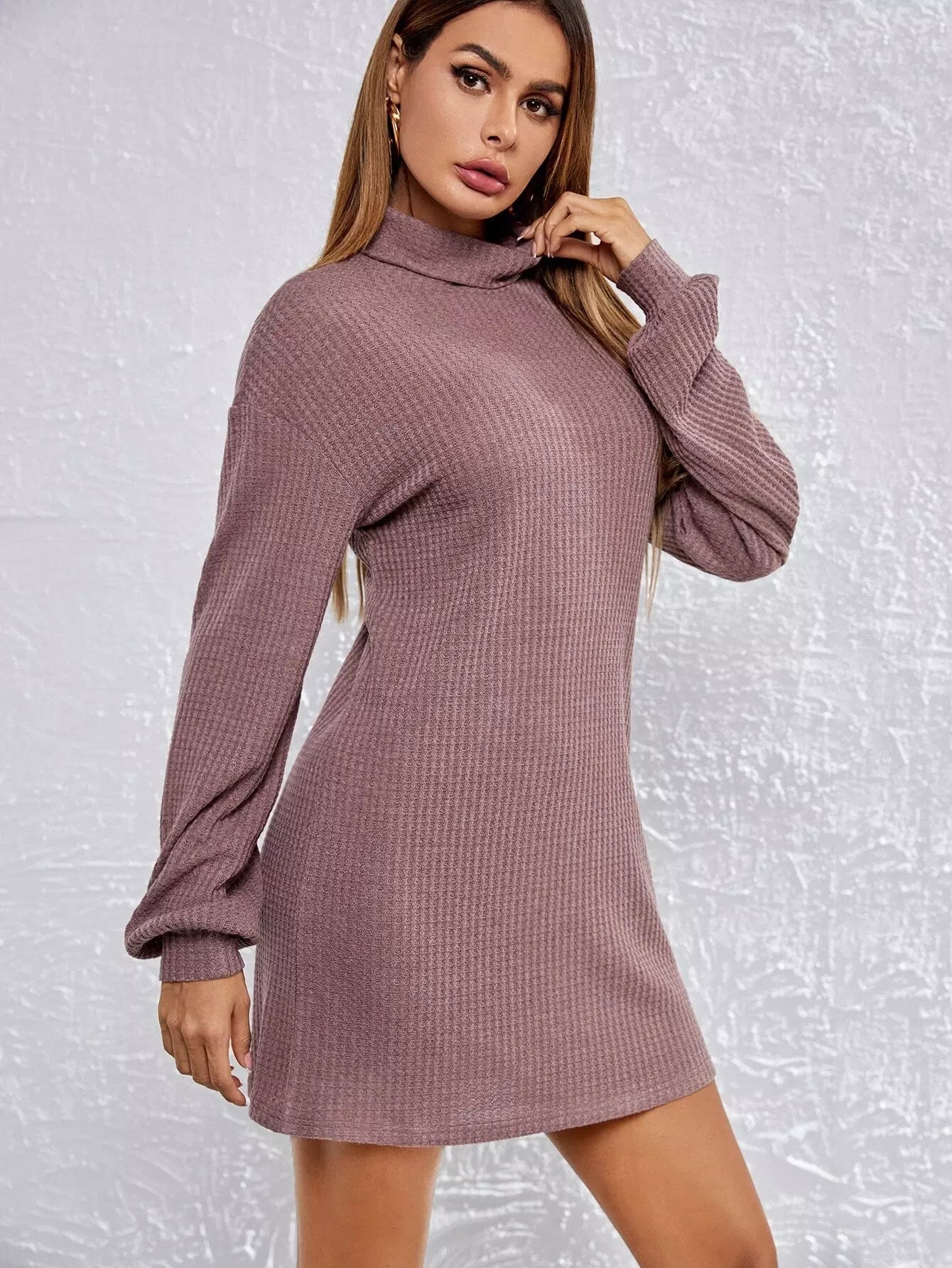 Rolled Neck Lantern Sleeve Waffle Knit Tee Dress