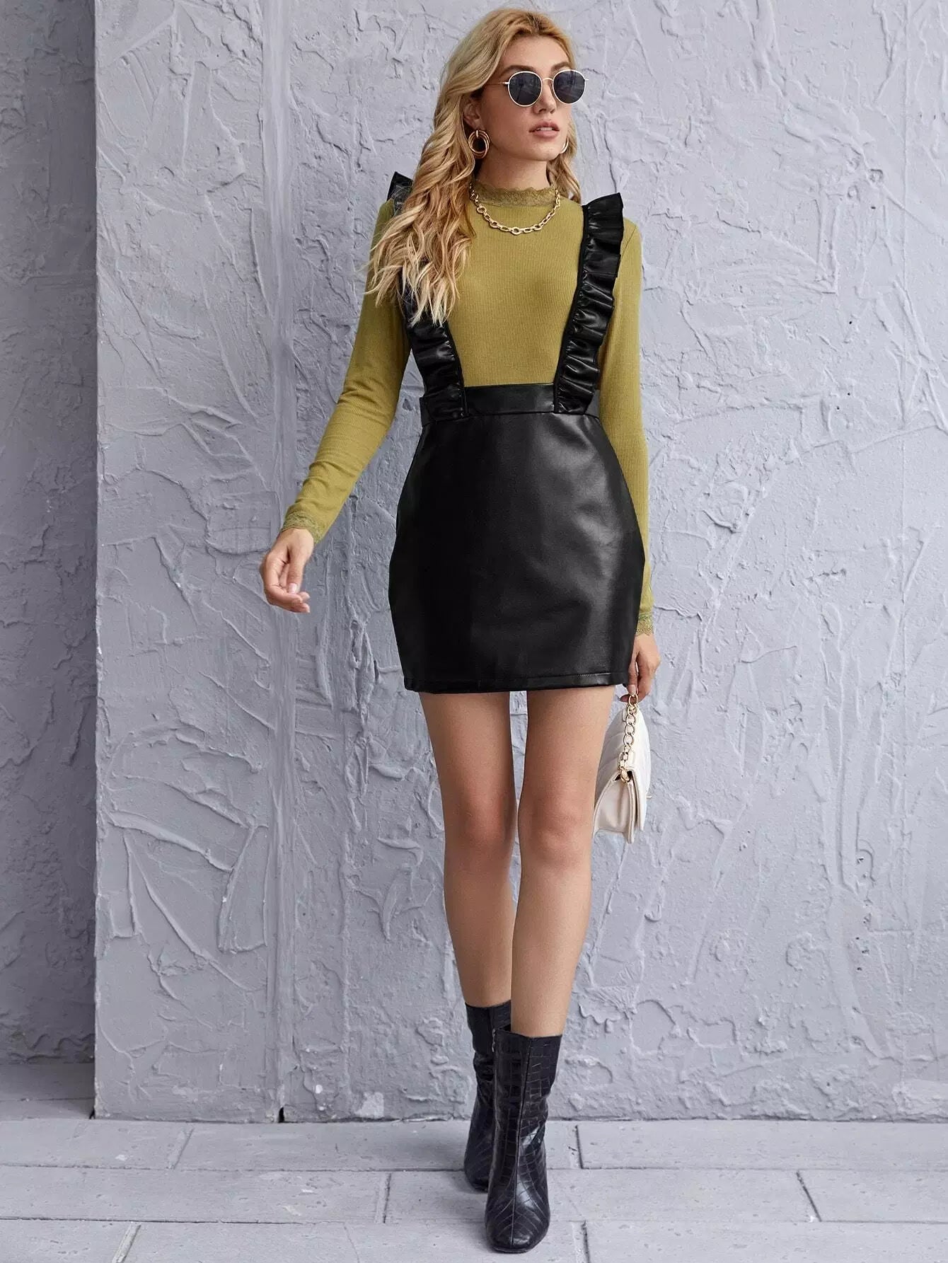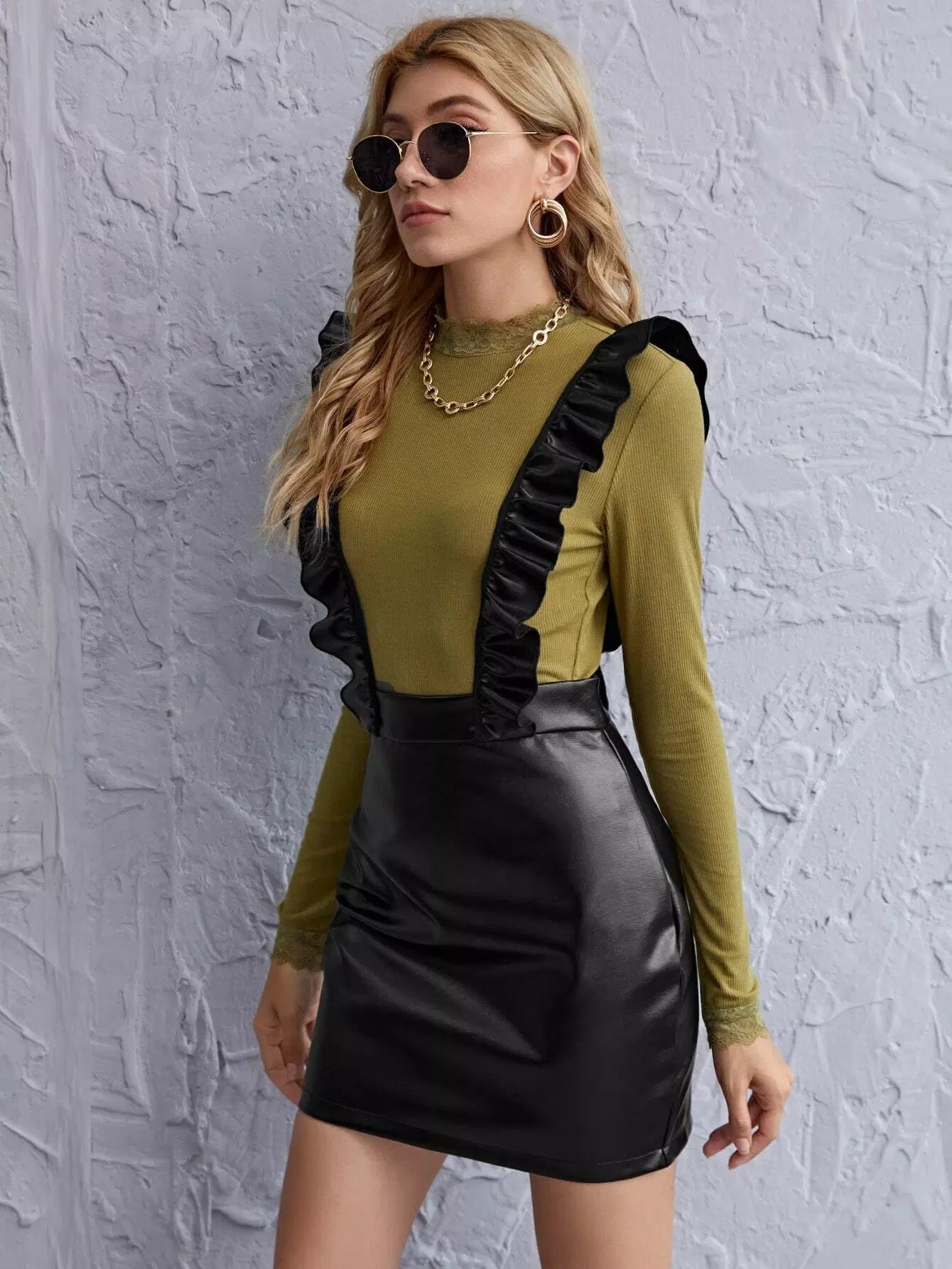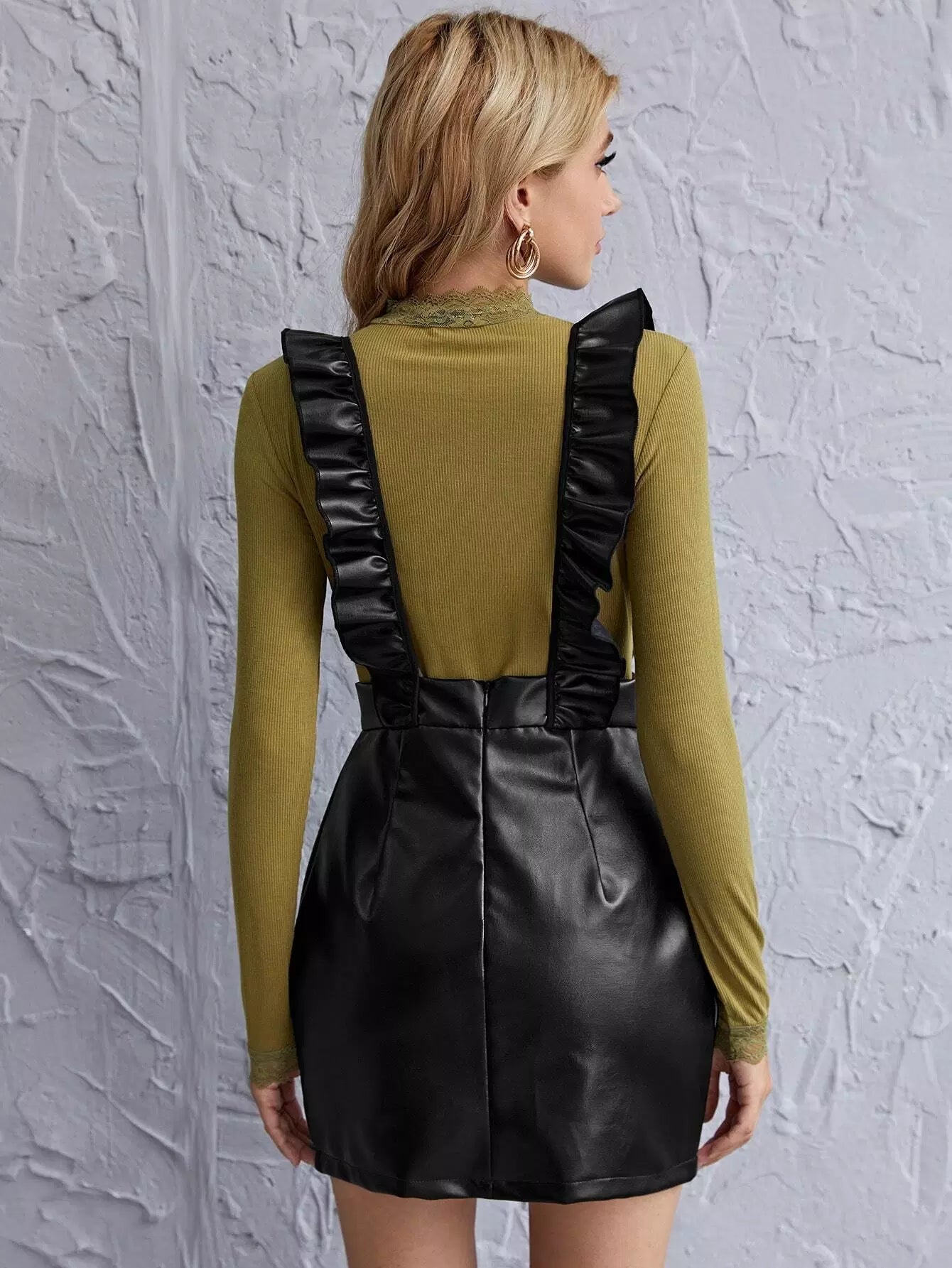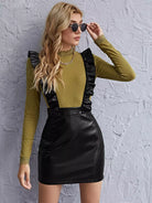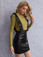 Ruffle Trim Leather Look Suspender Dress