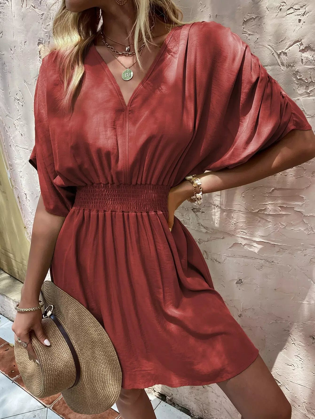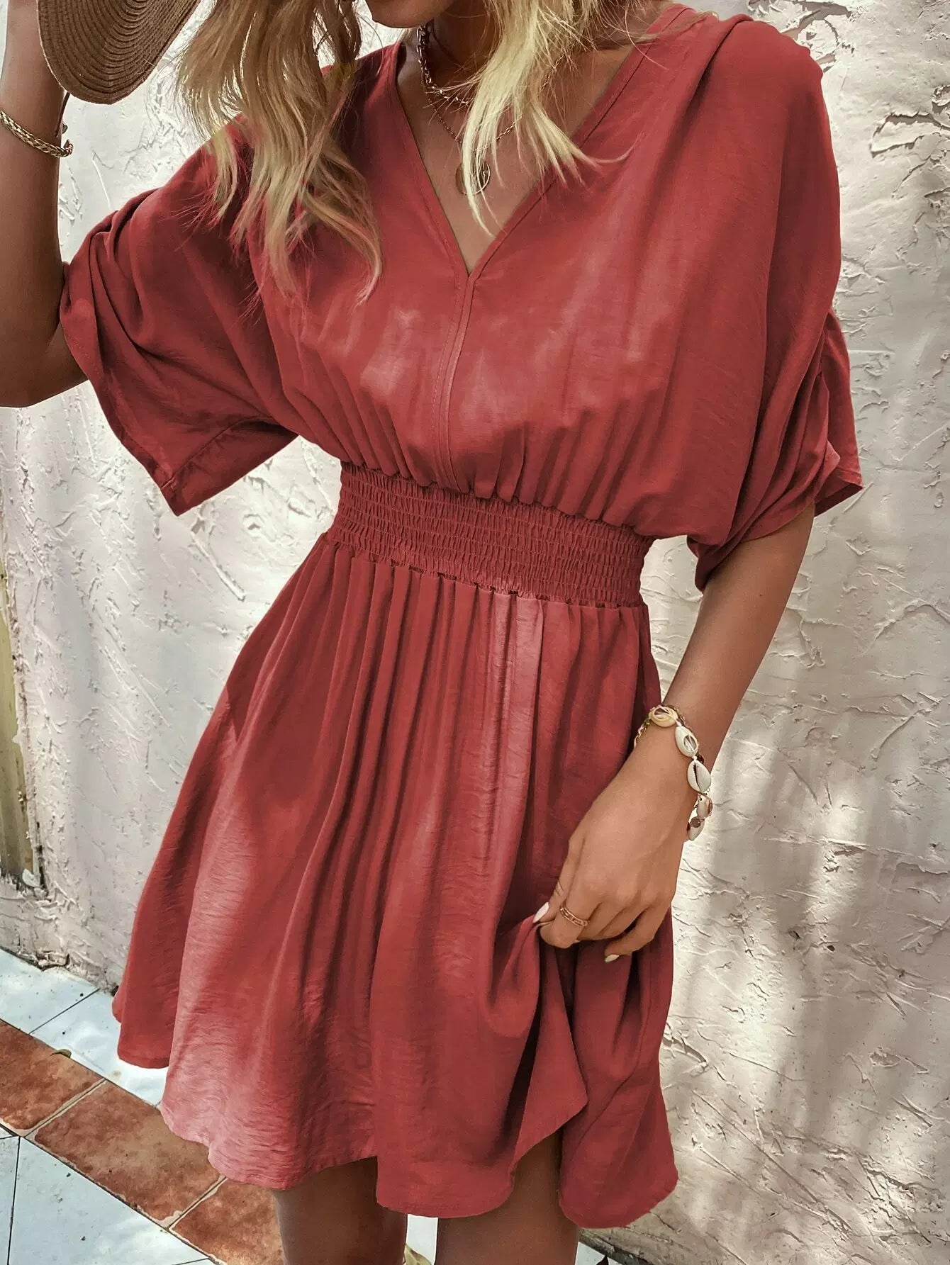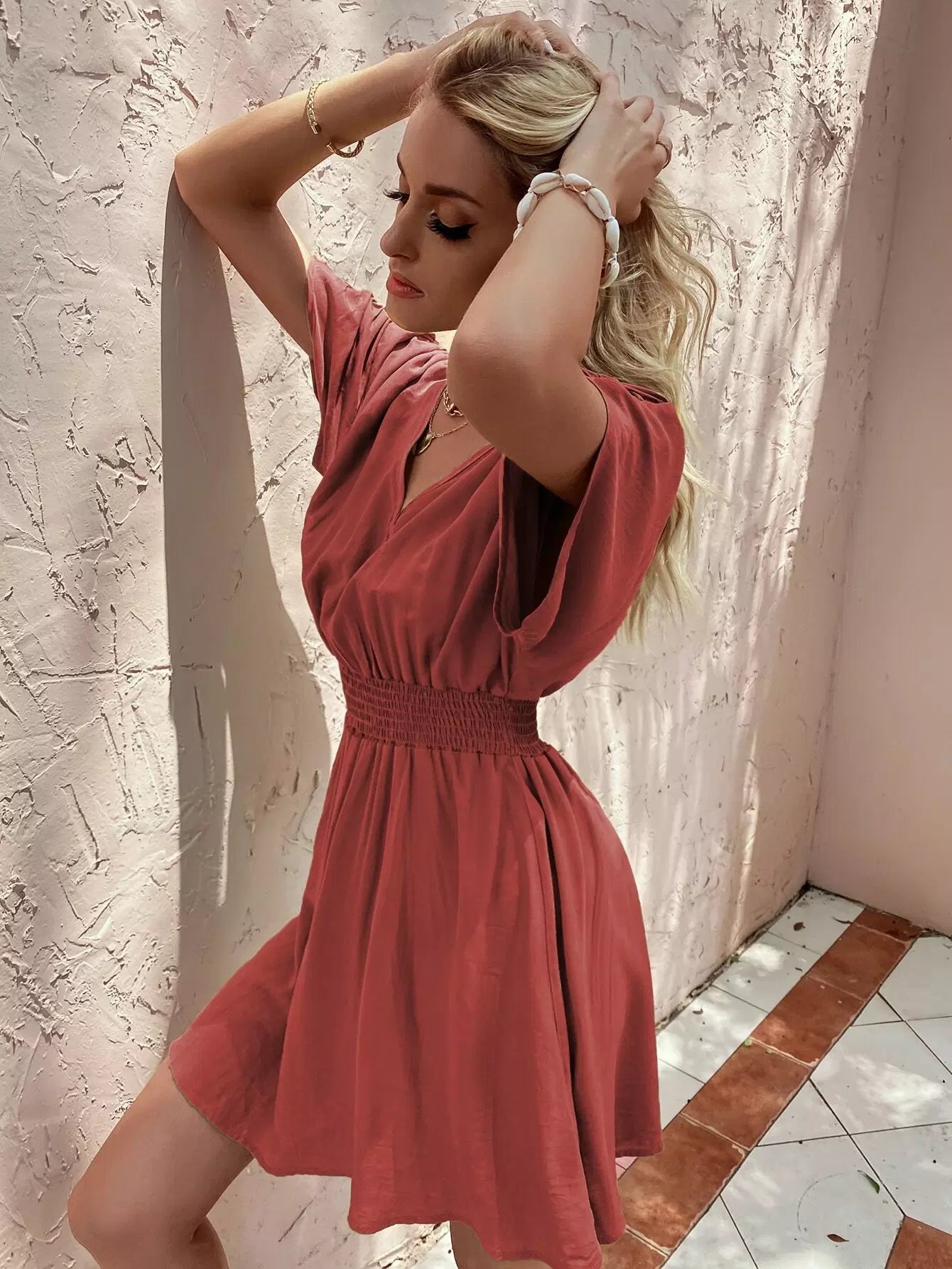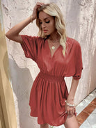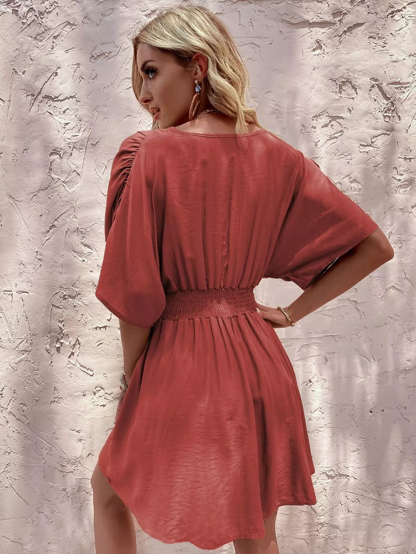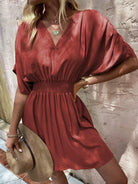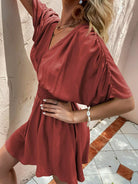 Solid Shirred Waist Ruched Sleeve Dress