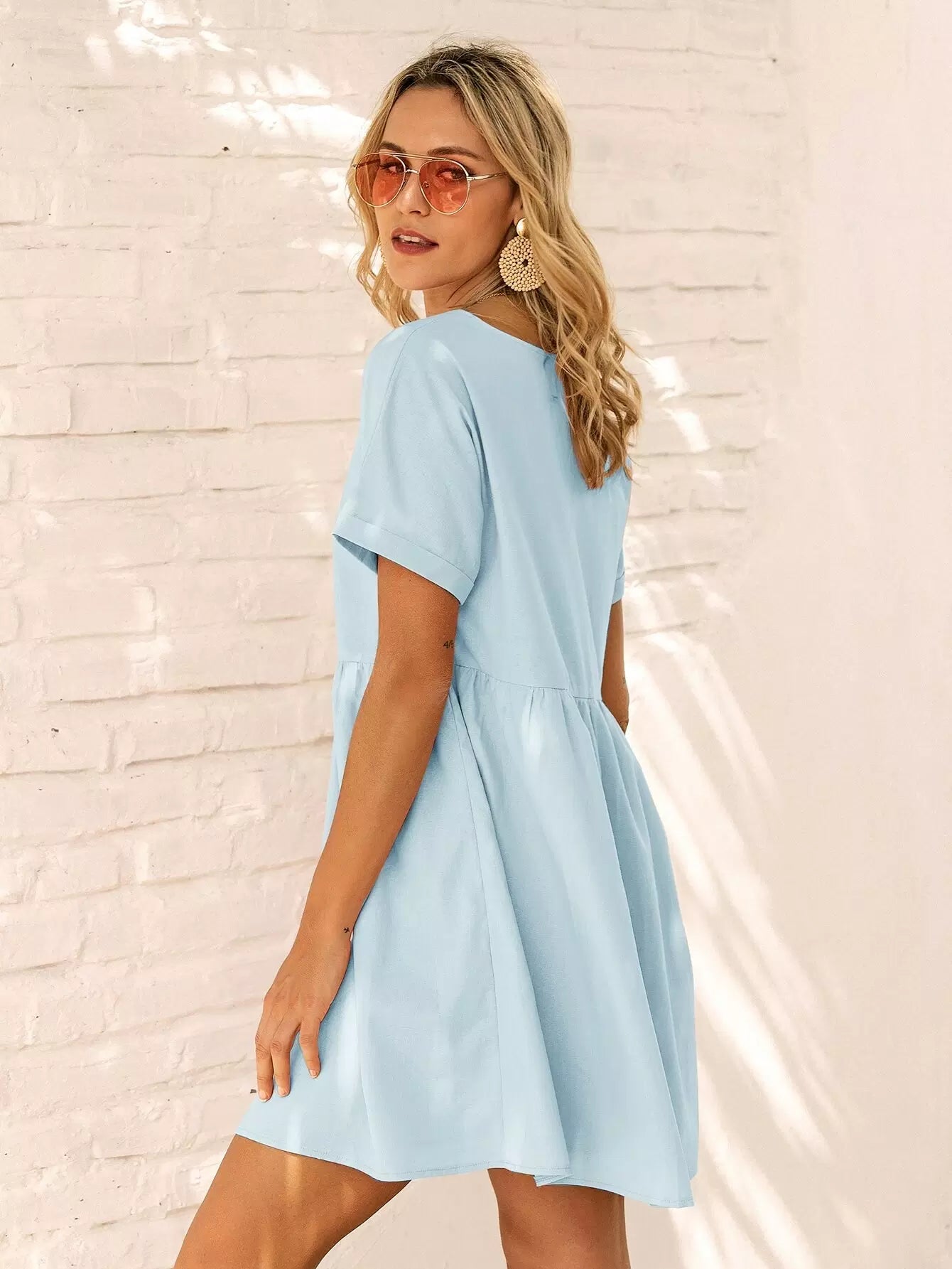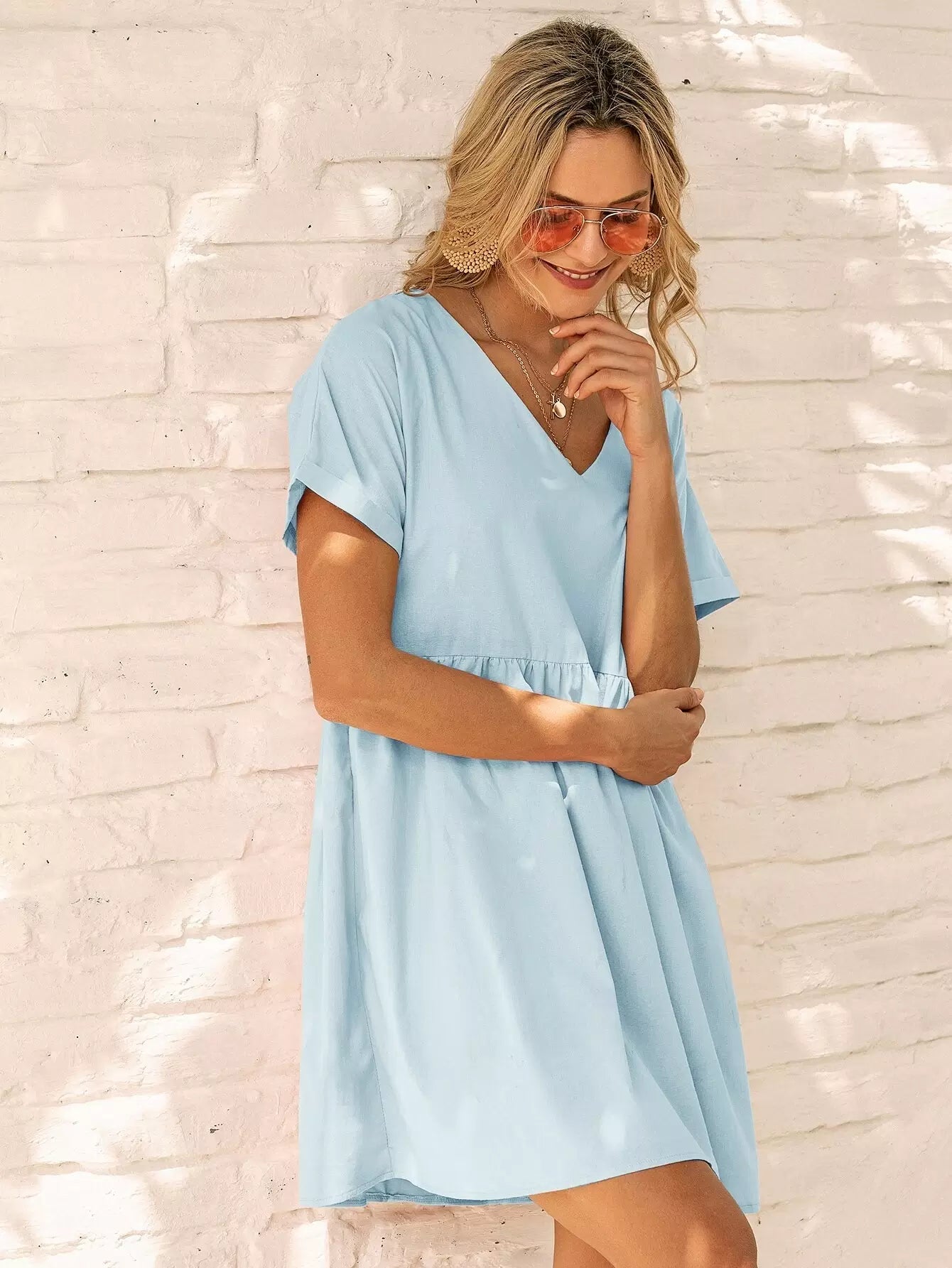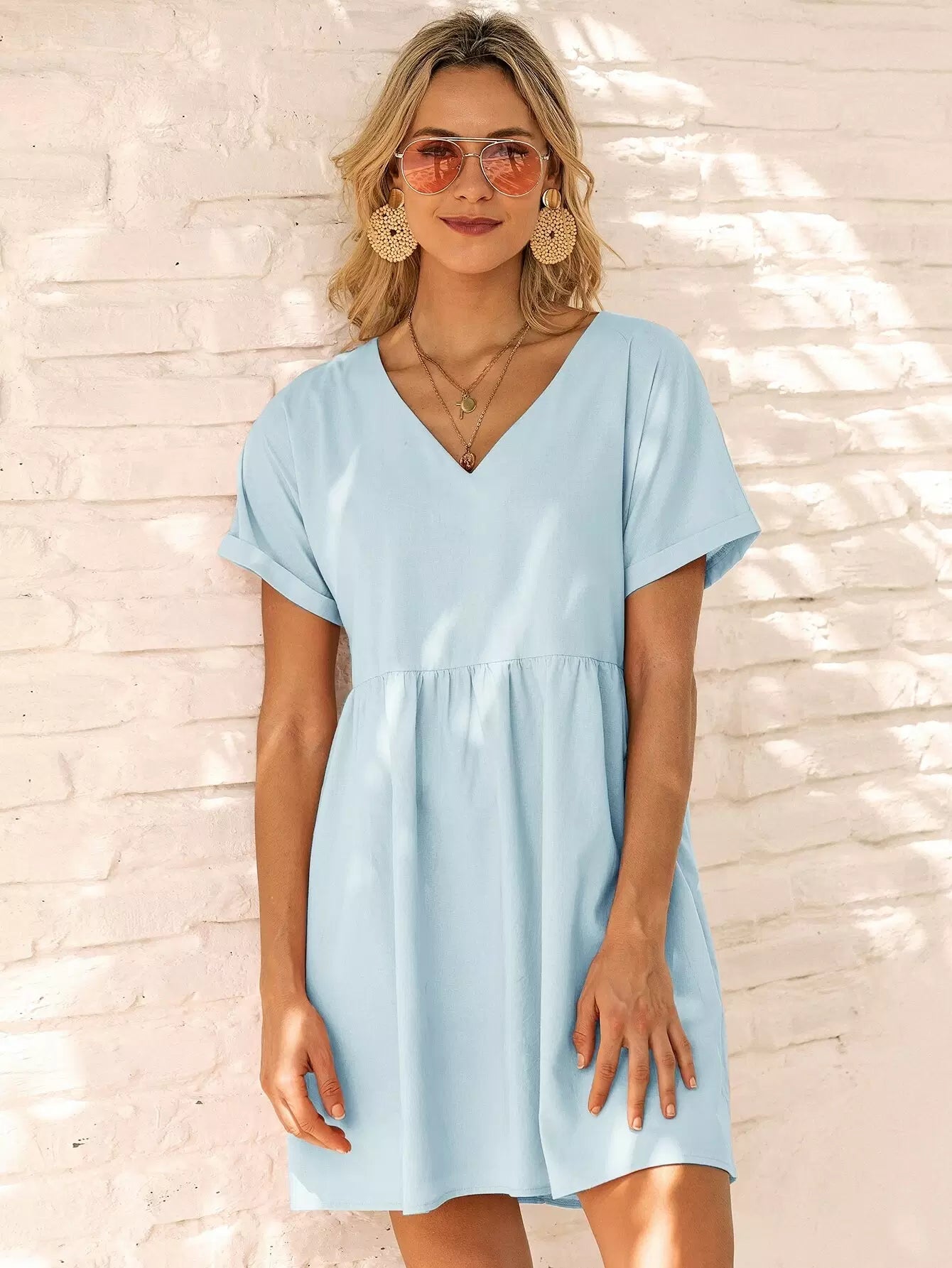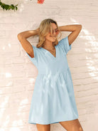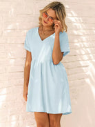Solid V-neck Rolled Cuff Smock Dress