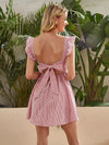 Square Neck Ruffle Trim Tied Backless Striped Dress