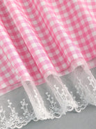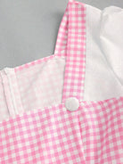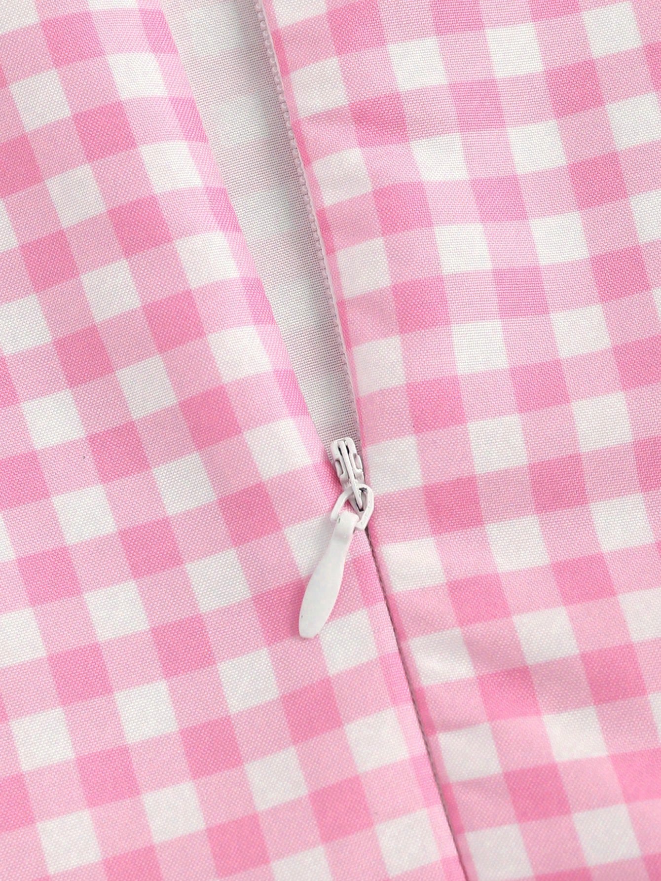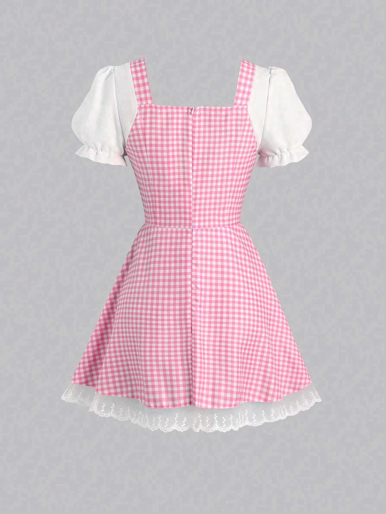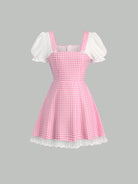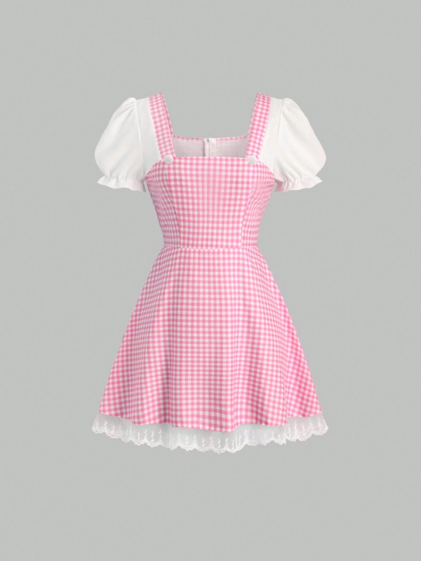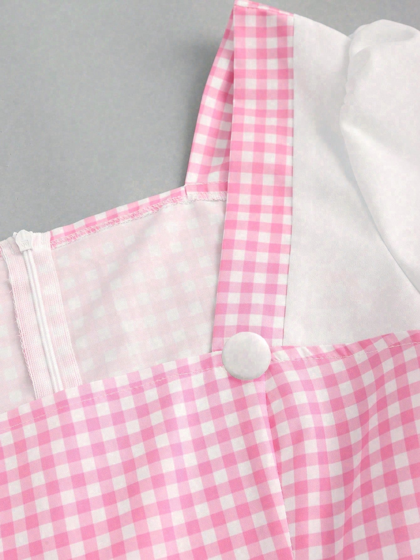 Sweetra Summer Sweet Contrast Plaid Puff Sleeve Square Neck Midi Dress
