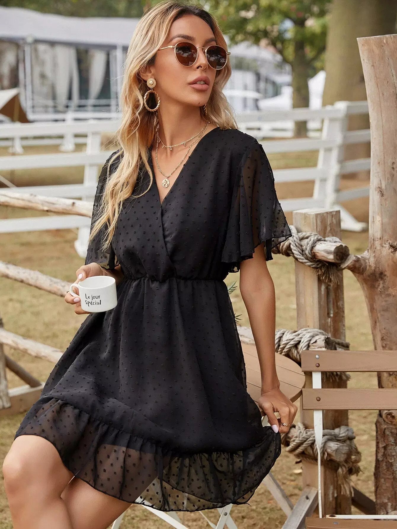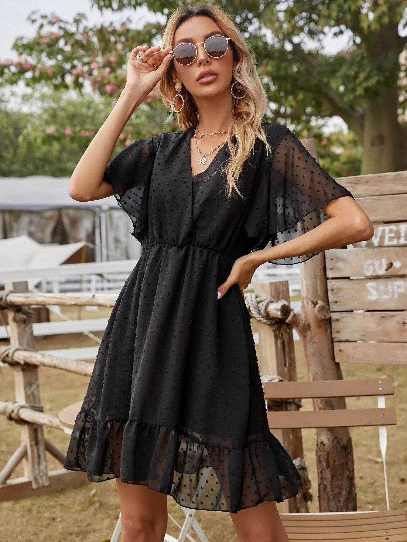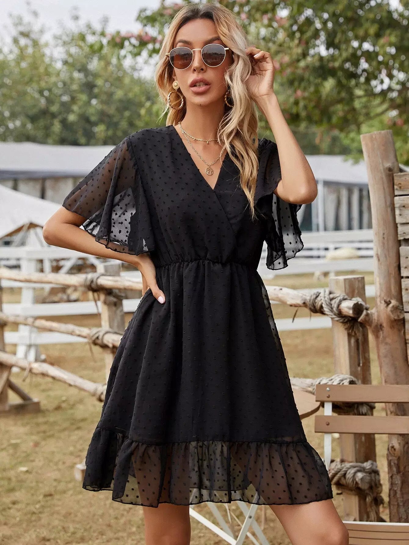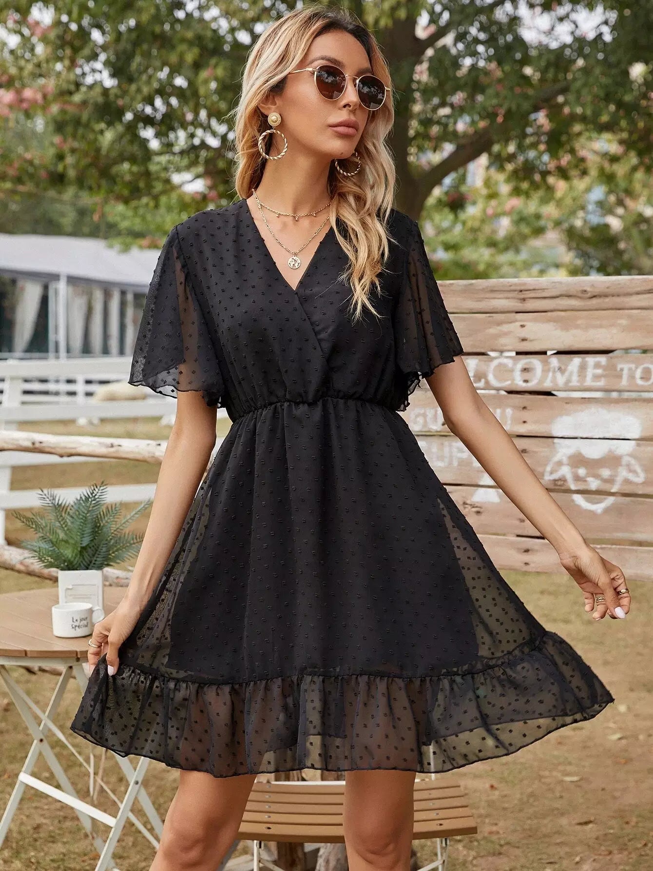 Swiss Dot Surplice Front Ruffle Hem Dress