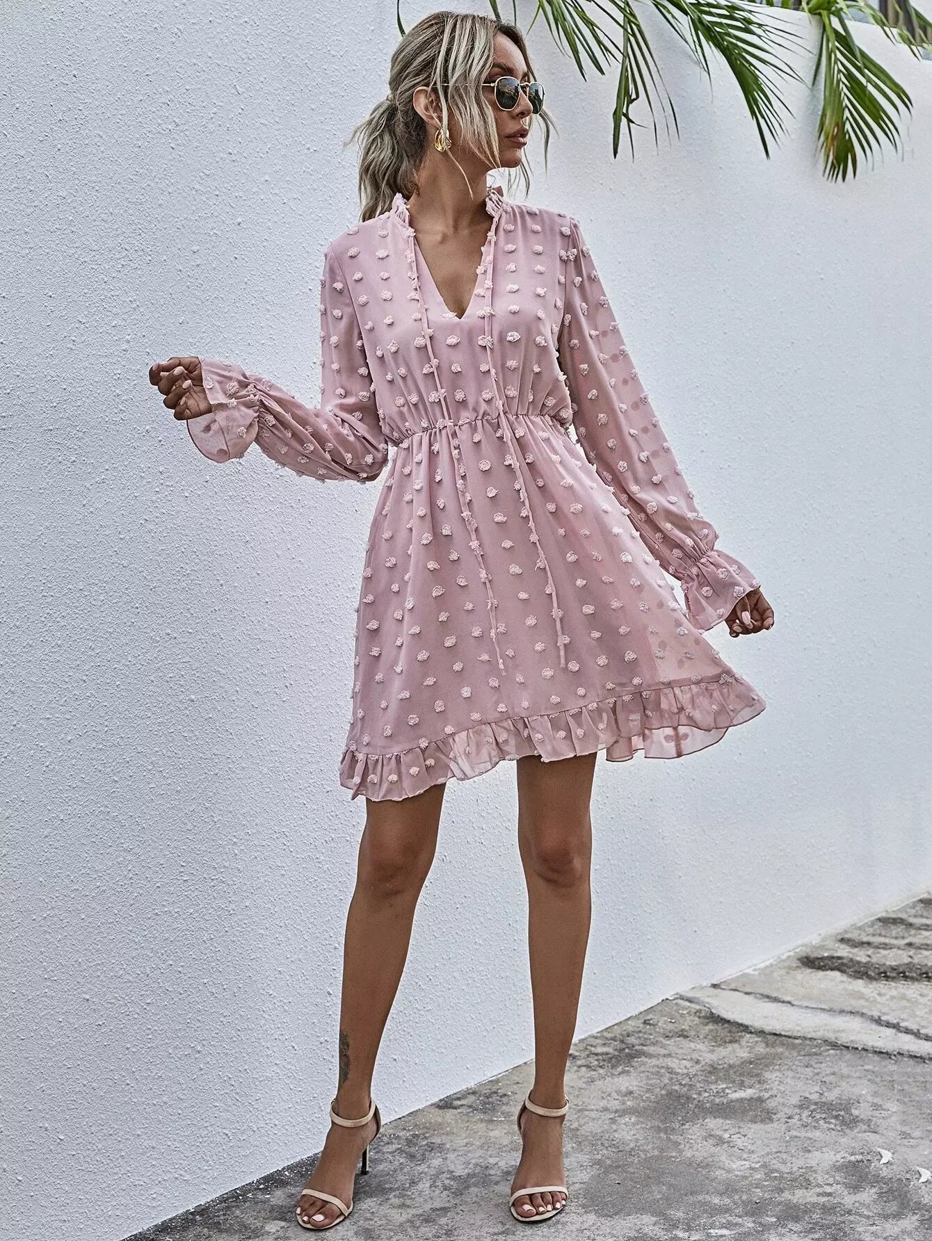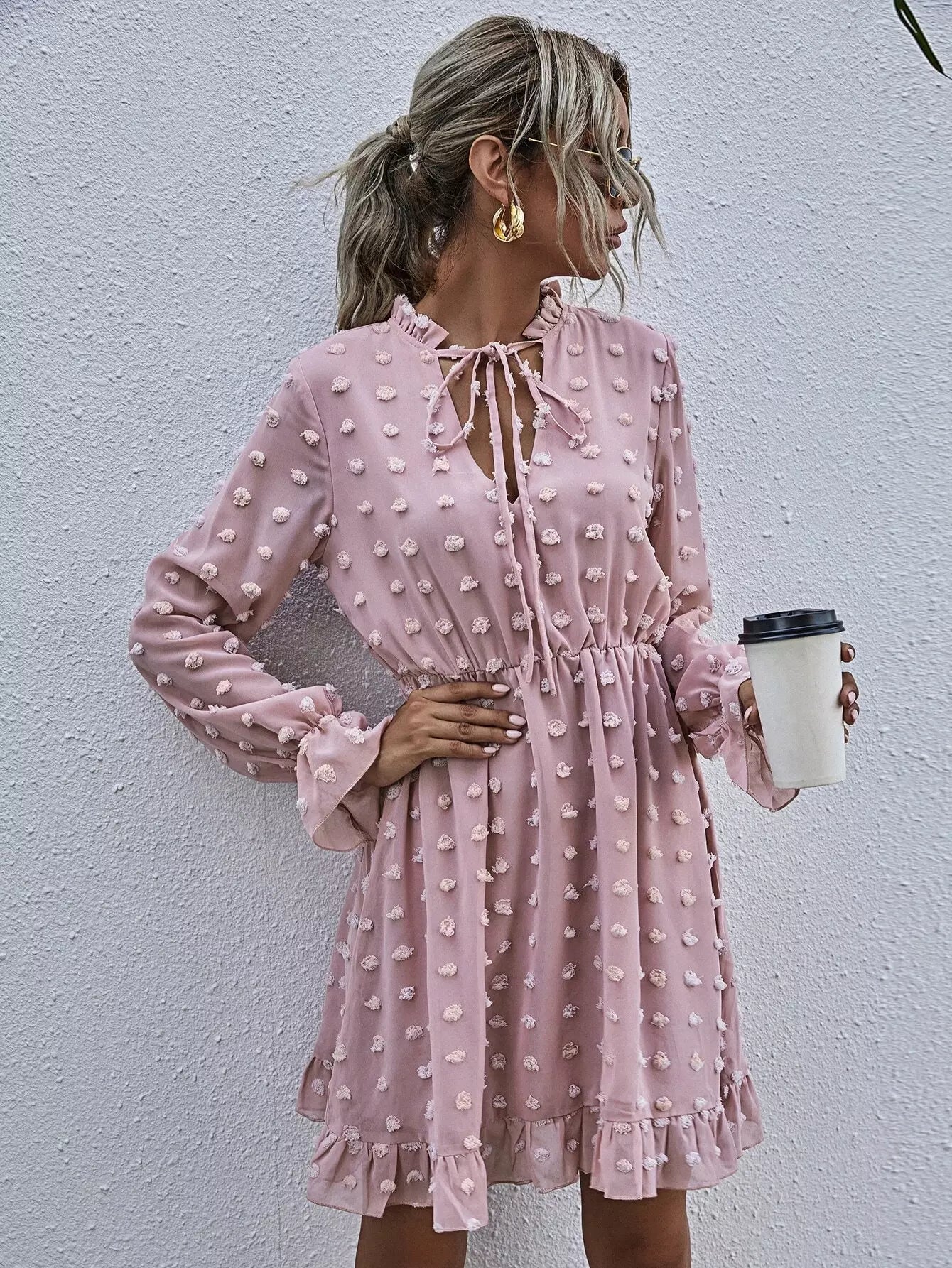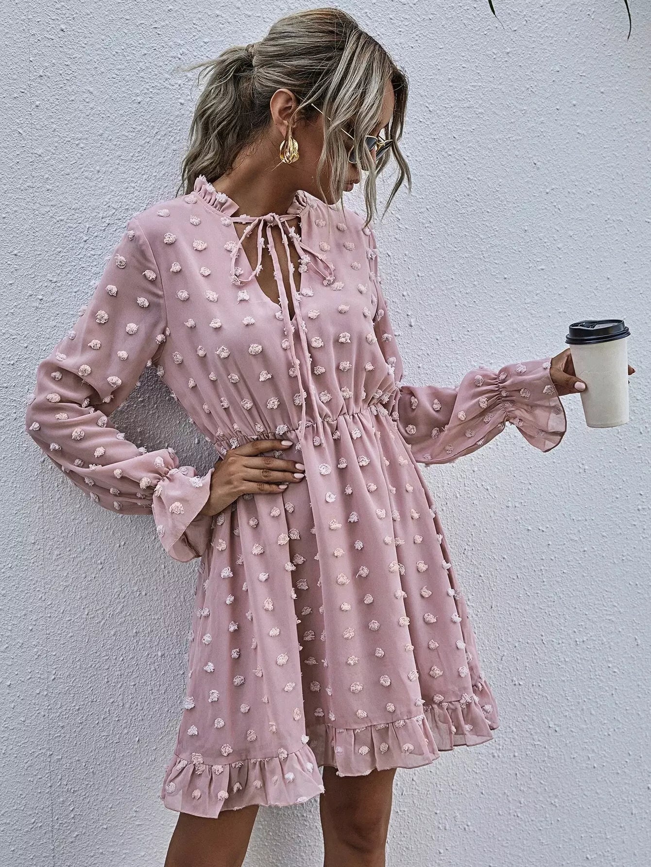 Swiss Dot Tie Neck Ruffle Hem Dress