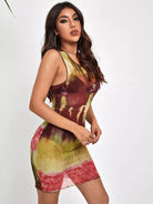 Tie Dye Lettuce Trim Sheer Mesh Dress Without Underwear