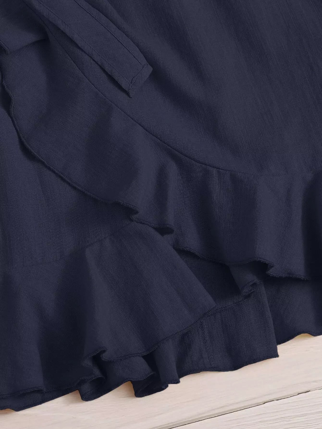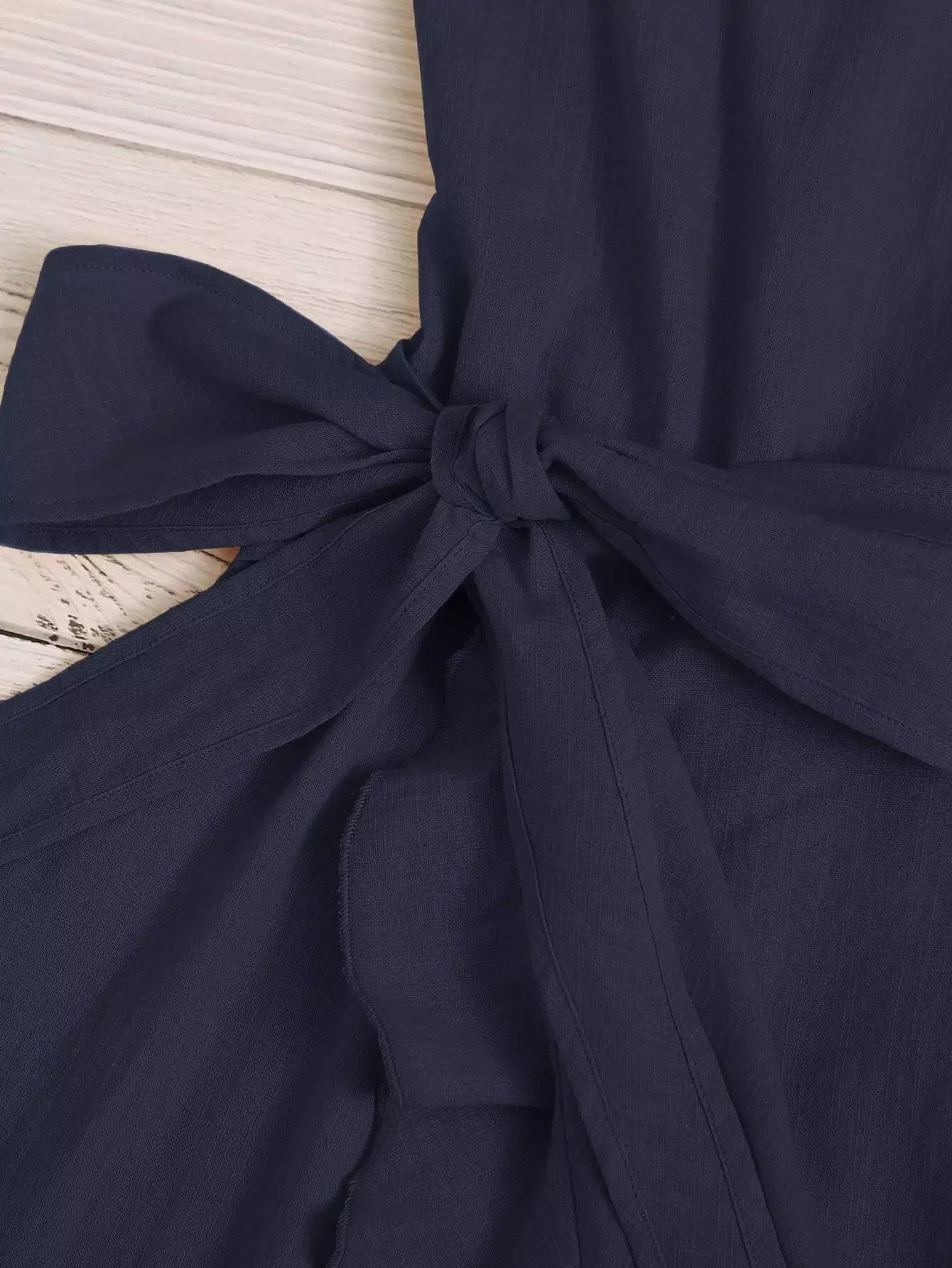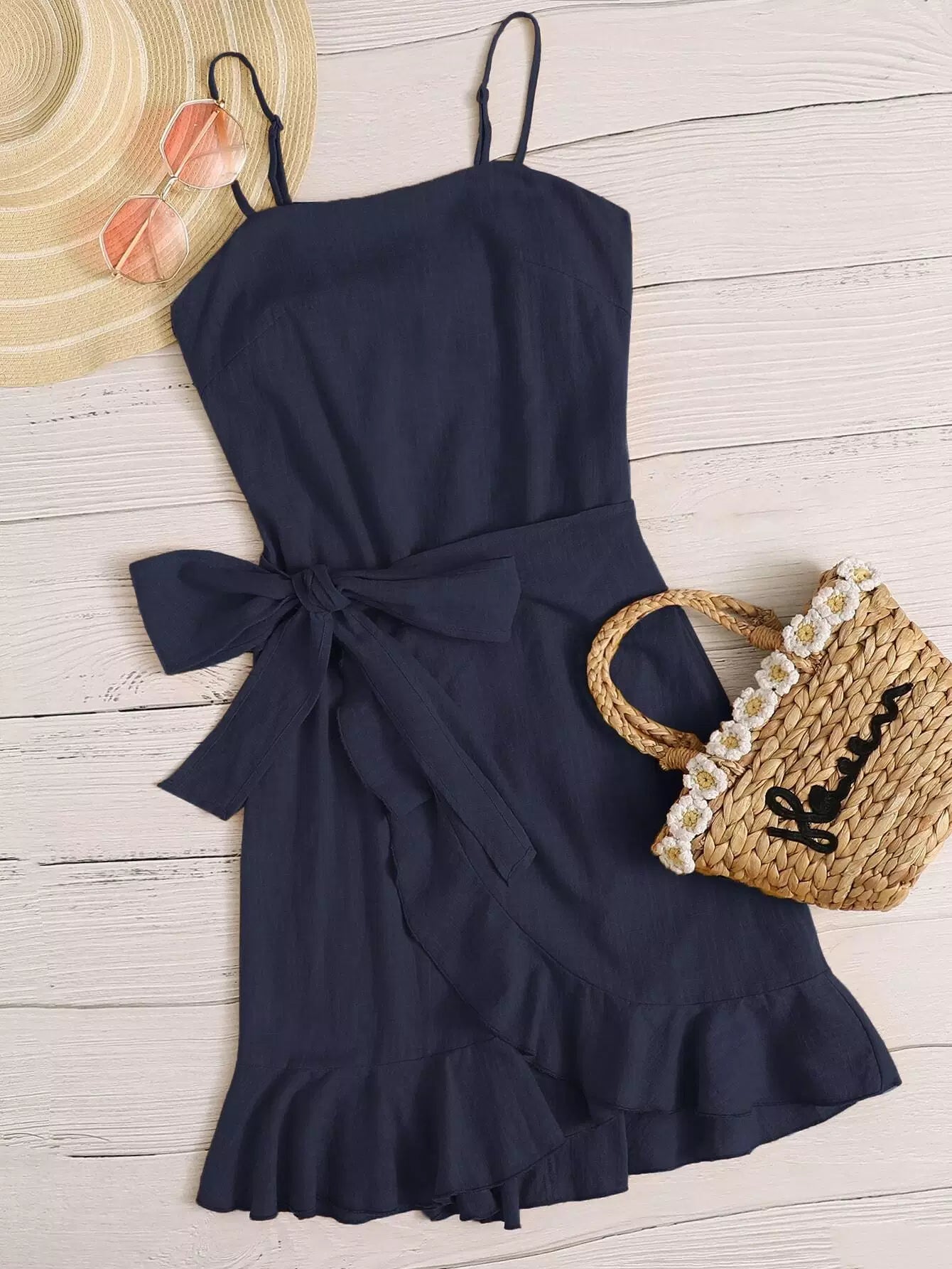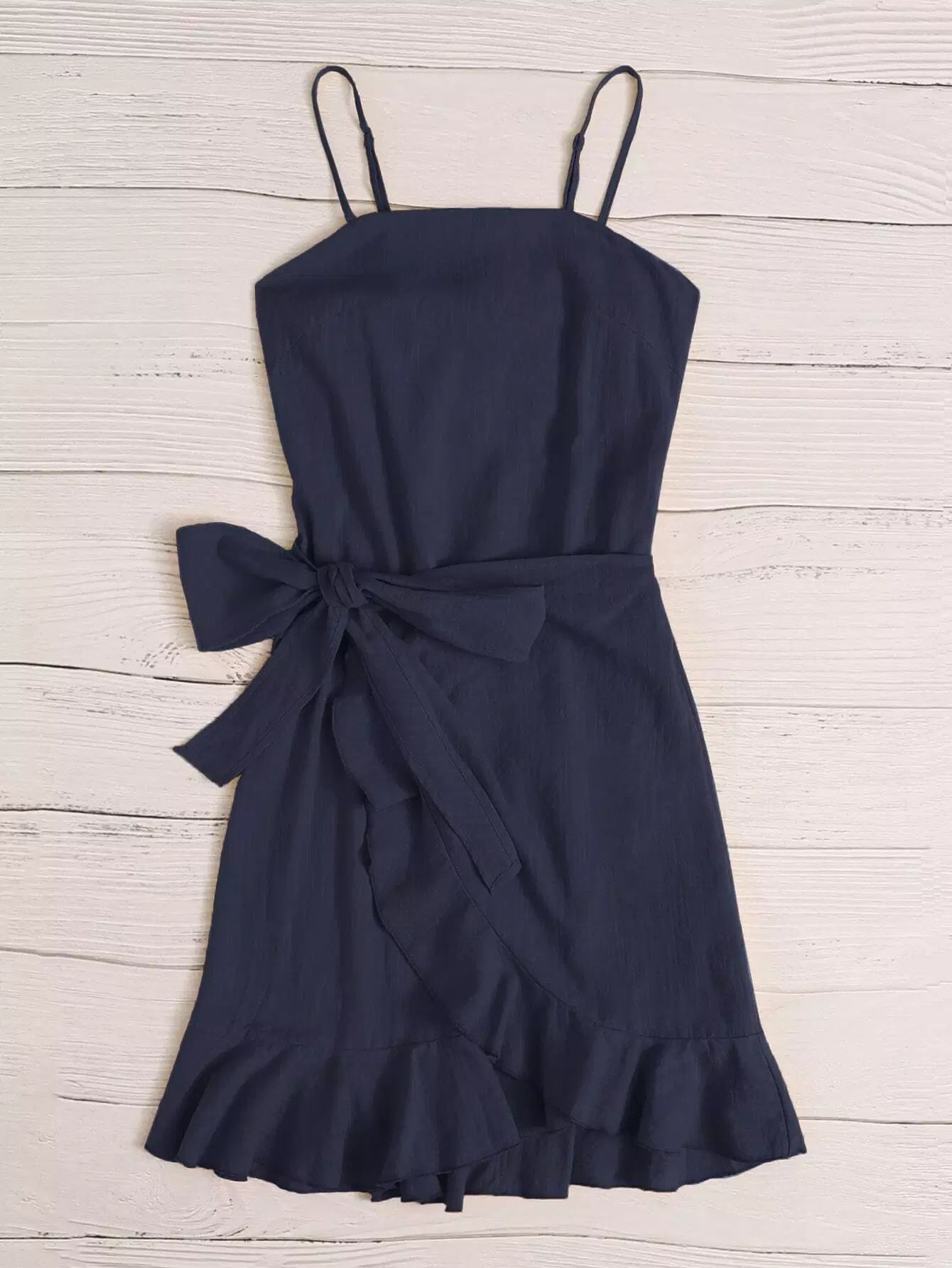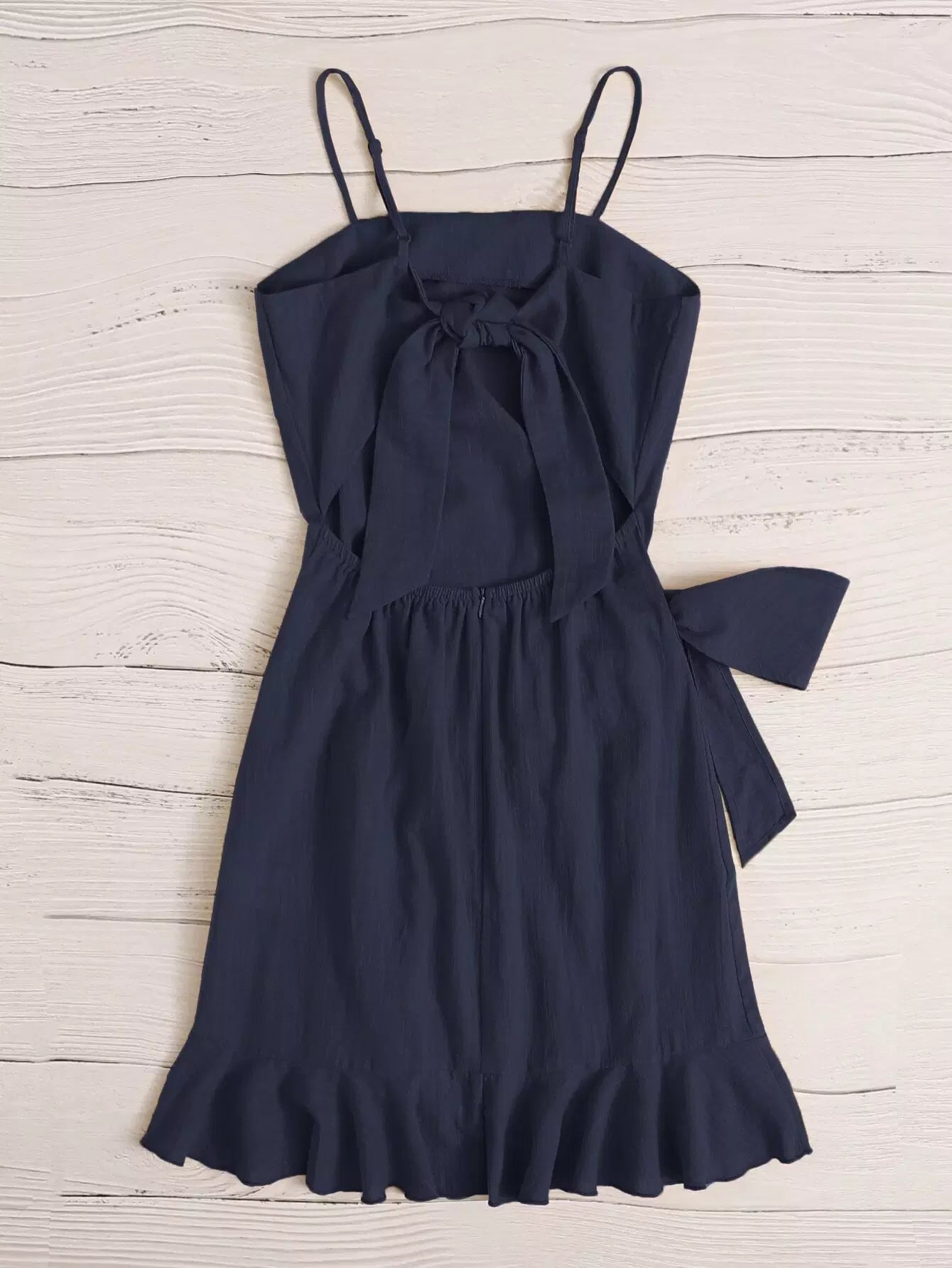 Tied Open Back Ruffle Trim Wrap Front Cami Dress