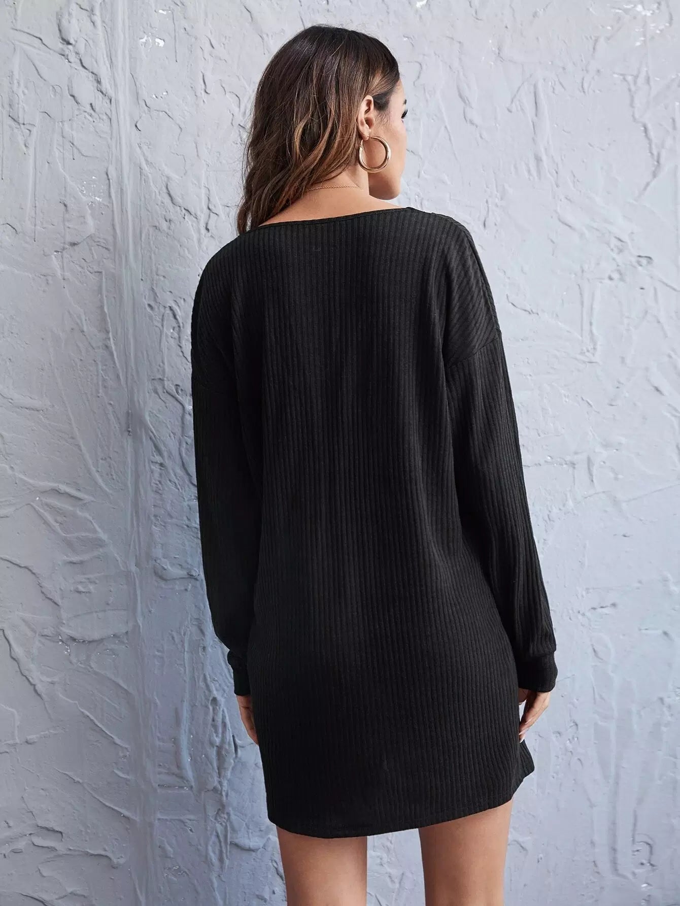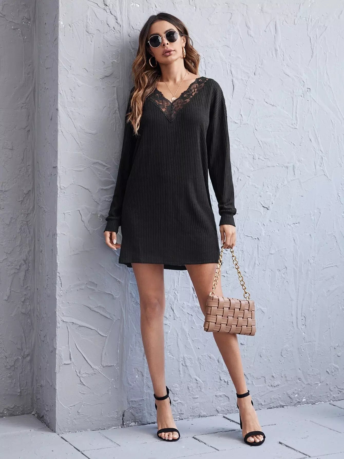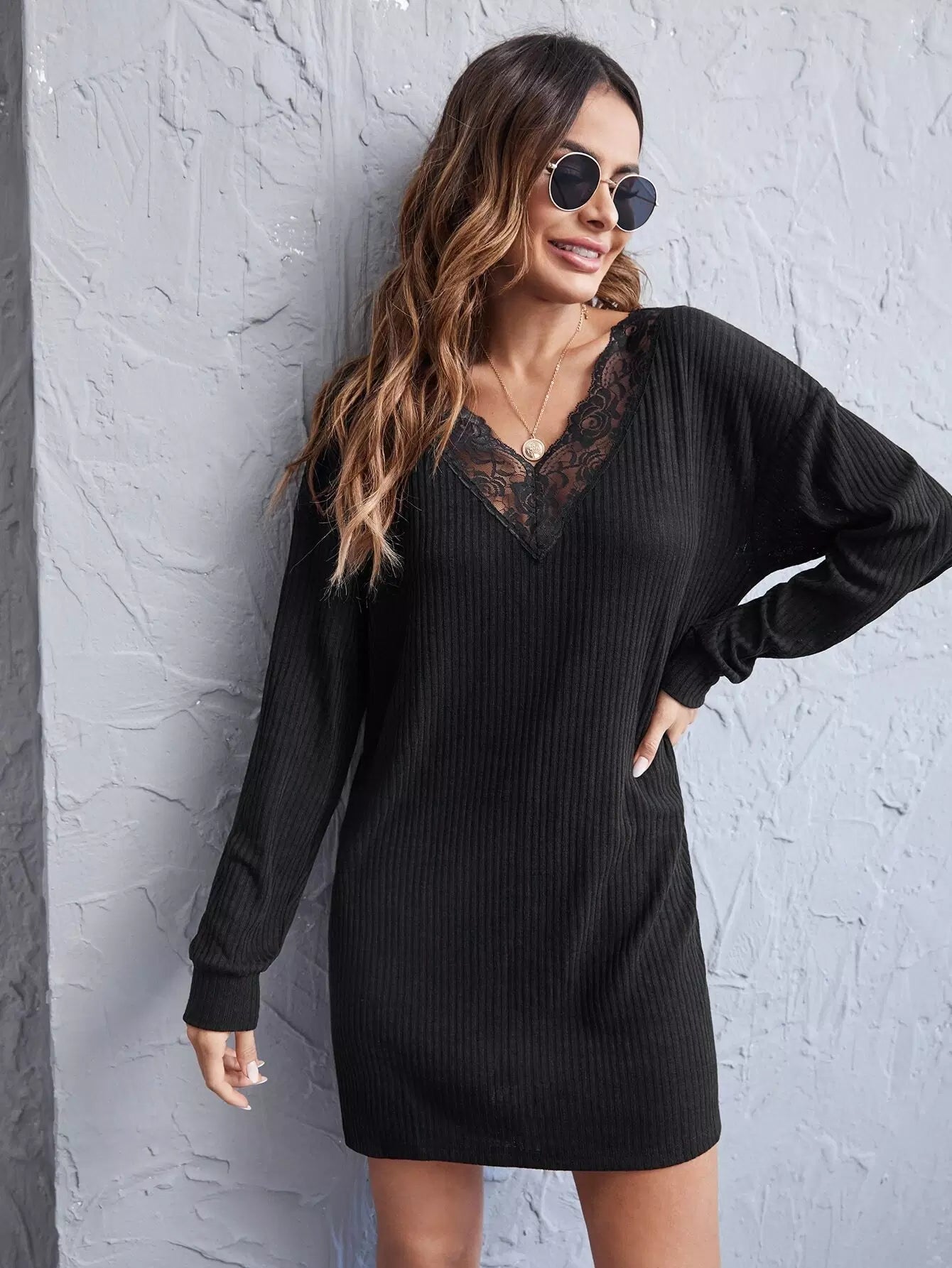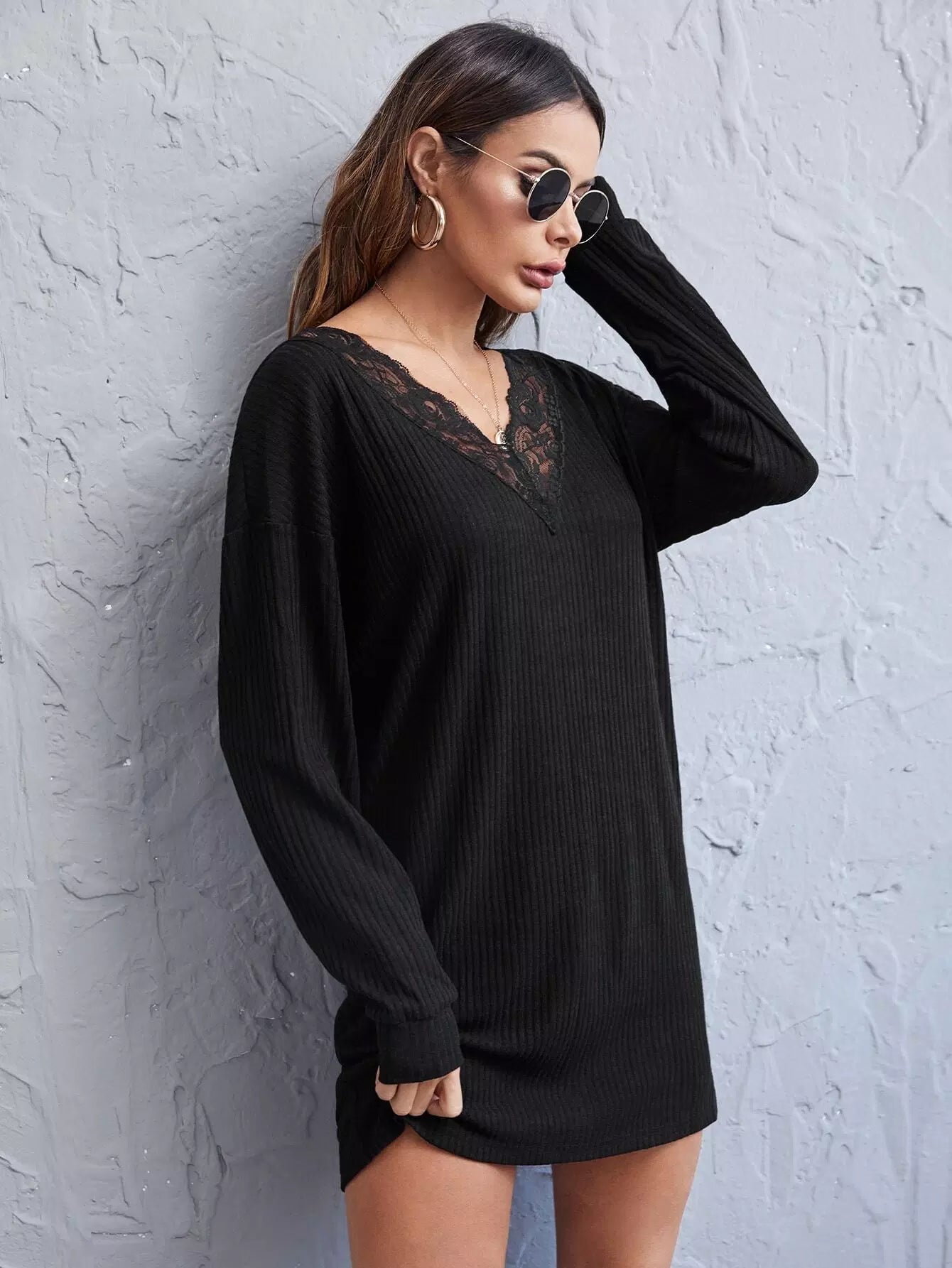 V Neck Lace Trim Drop Shoulder Tee Dress
