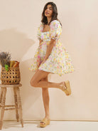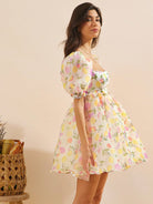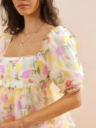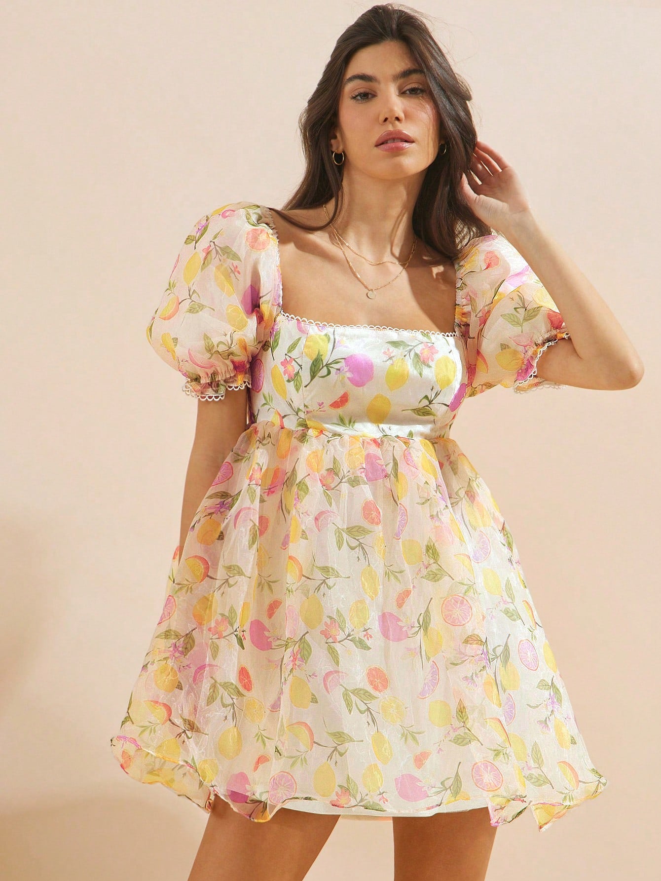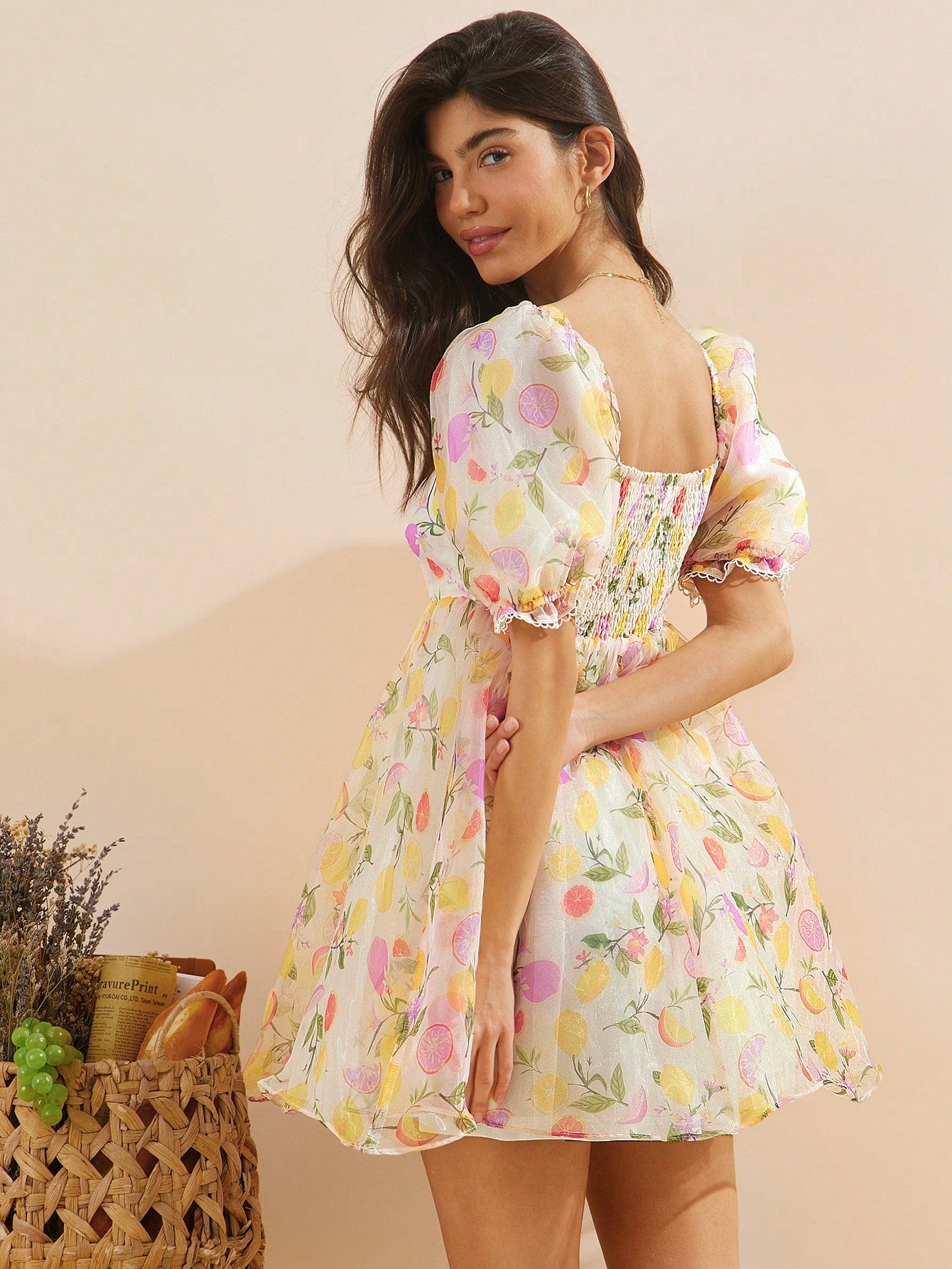 women WESTFADE Summer Fruits & Floral Printed Organza Square Neck Half Puff Sleeve Smocked Back Babydoll Dress For Spring Easter Break Vacation