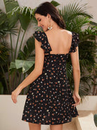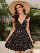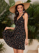 Allover Floral Print Knot Front Ruffle Trim Dress