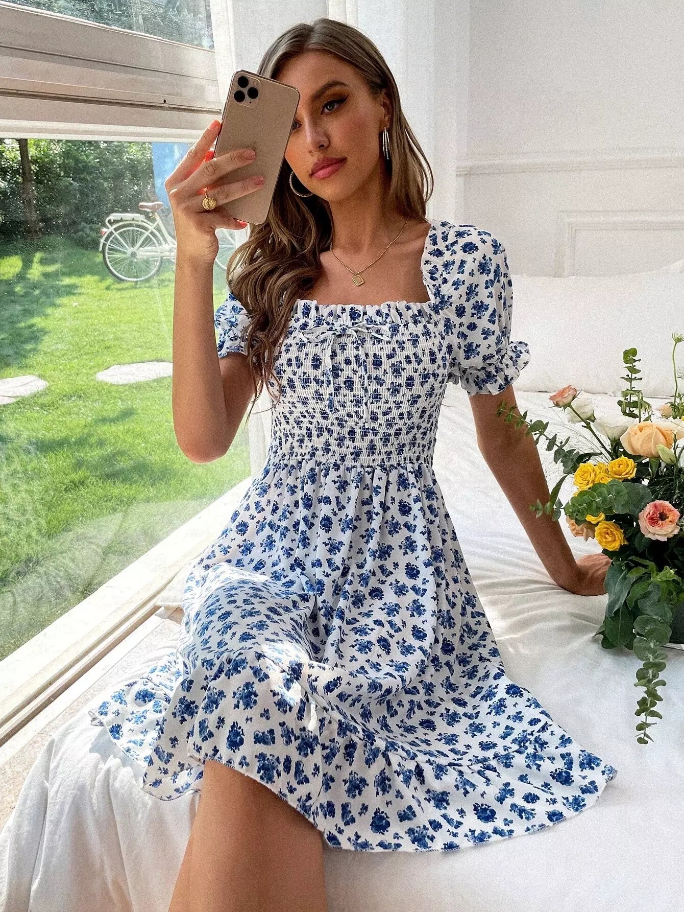 Allover Floral Print Shirred Ruffle Hem Milkmaid Dress