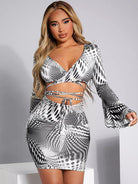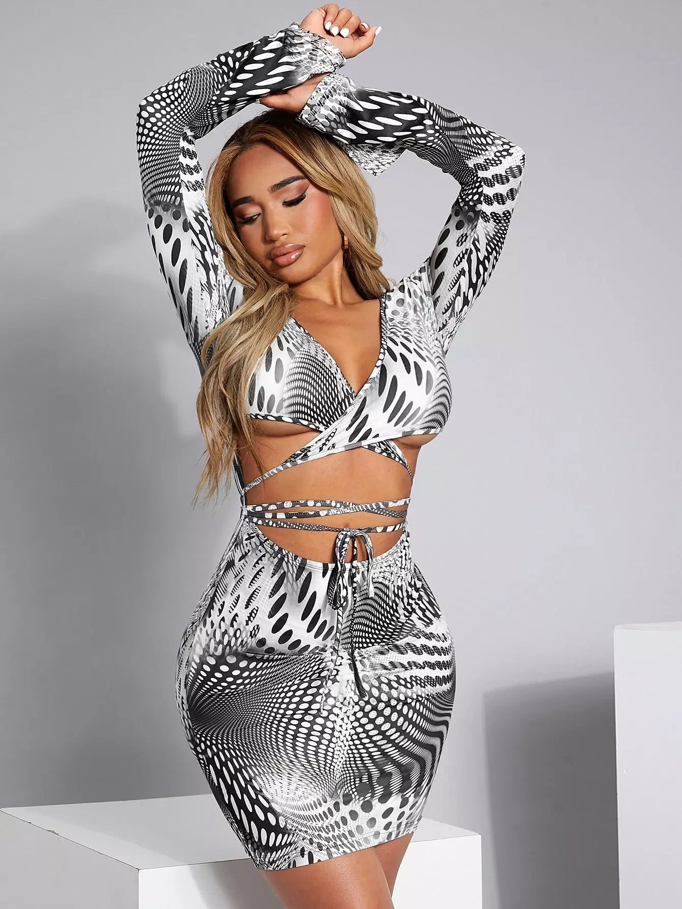 Allover Print Trumpet Sleeve Crisscross Tie Front Bodycon Dress