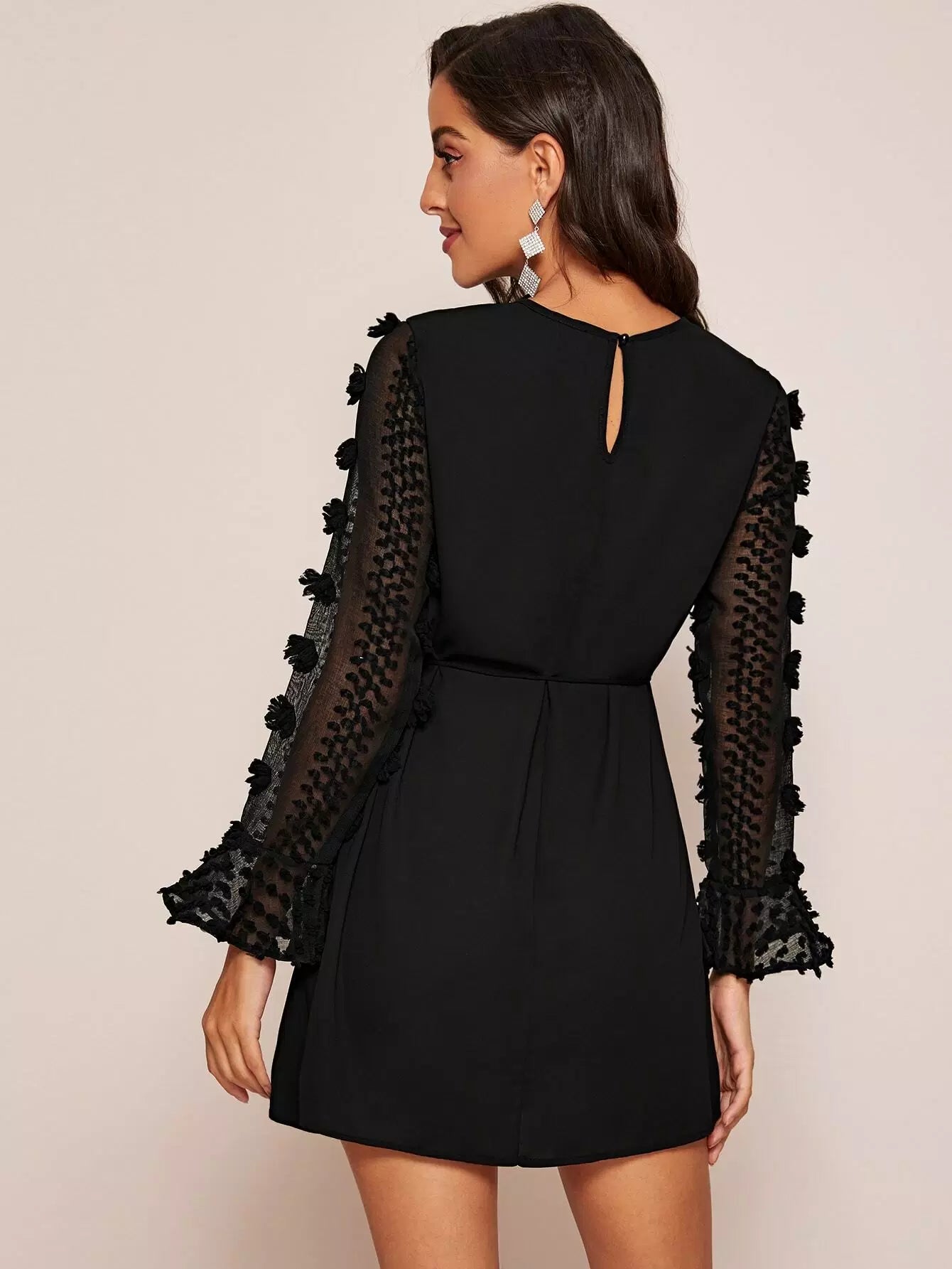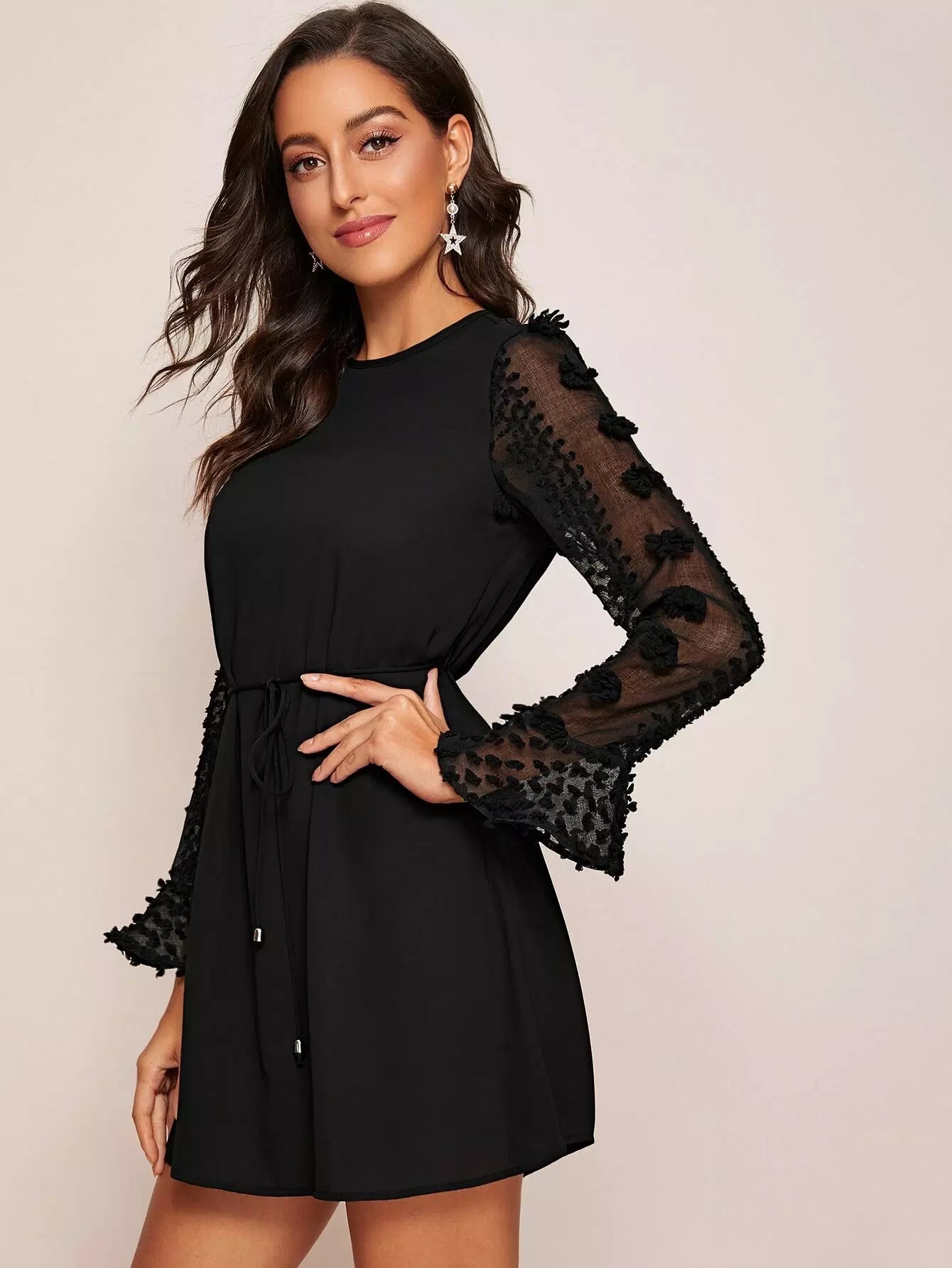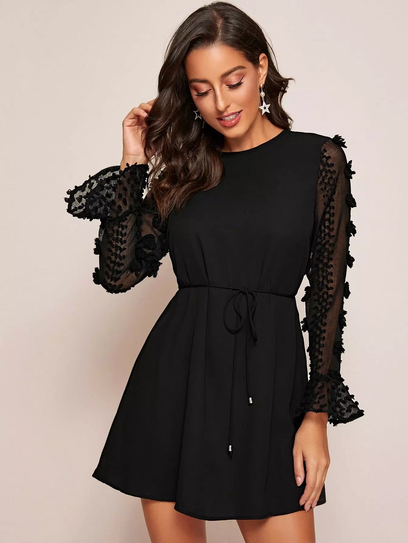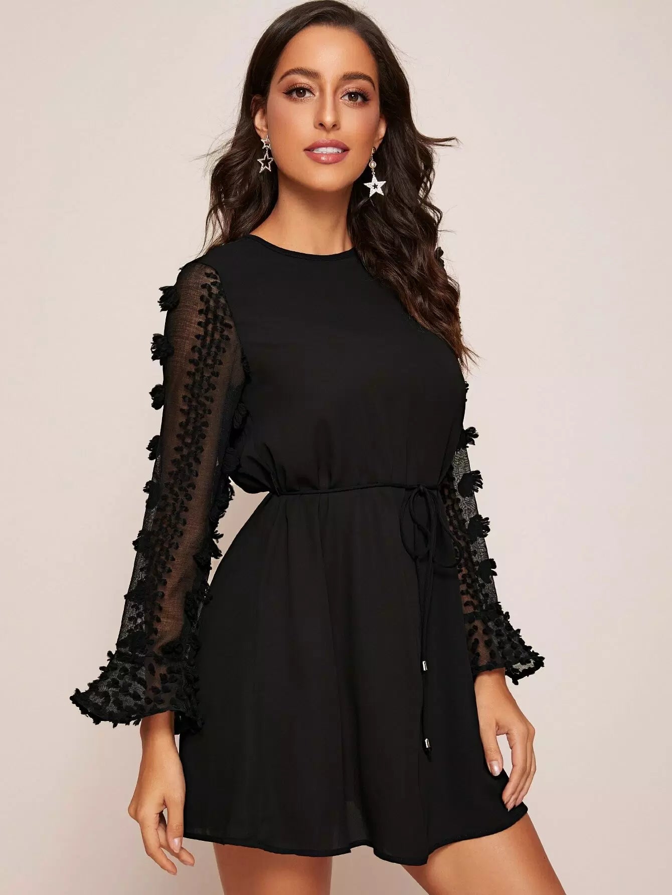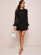 Applique Detail Ruffle Cuff Tie Waist Dress
