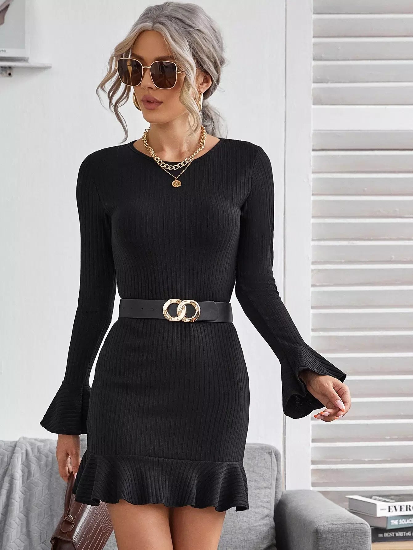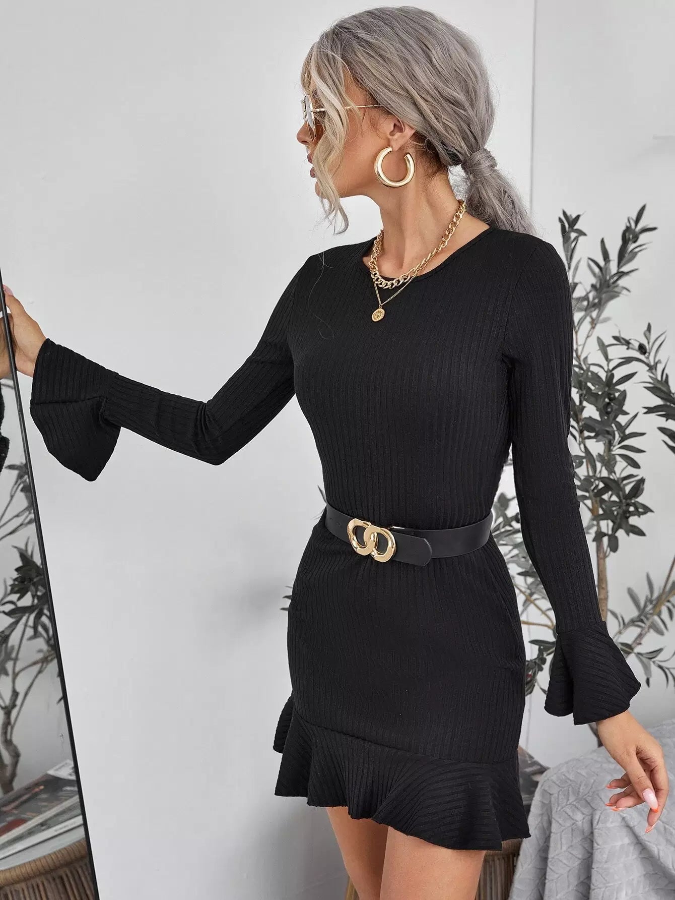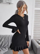 Bell Sleeve Ruffle Hem Rib-knit Dress Without Belt