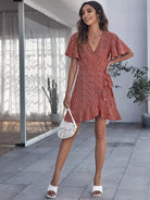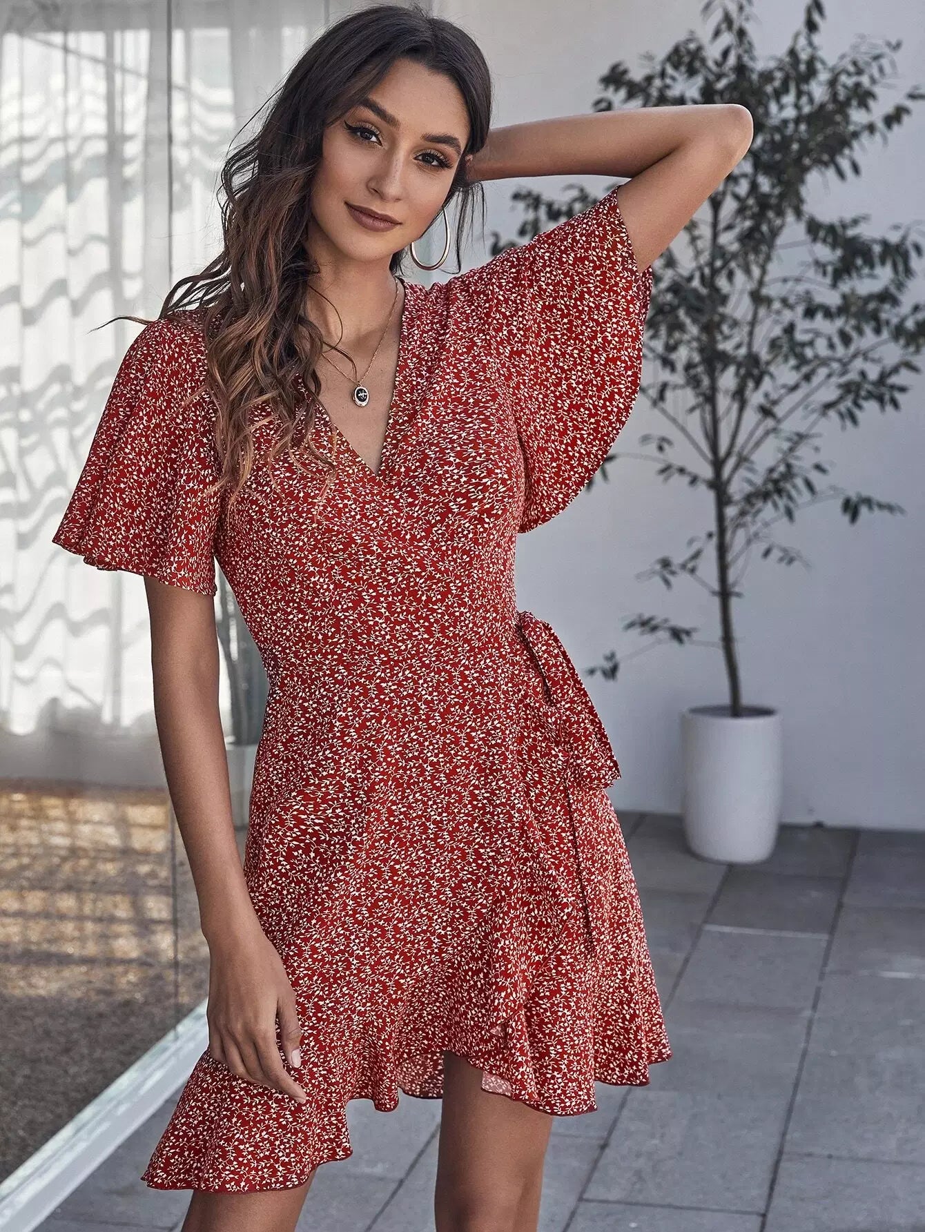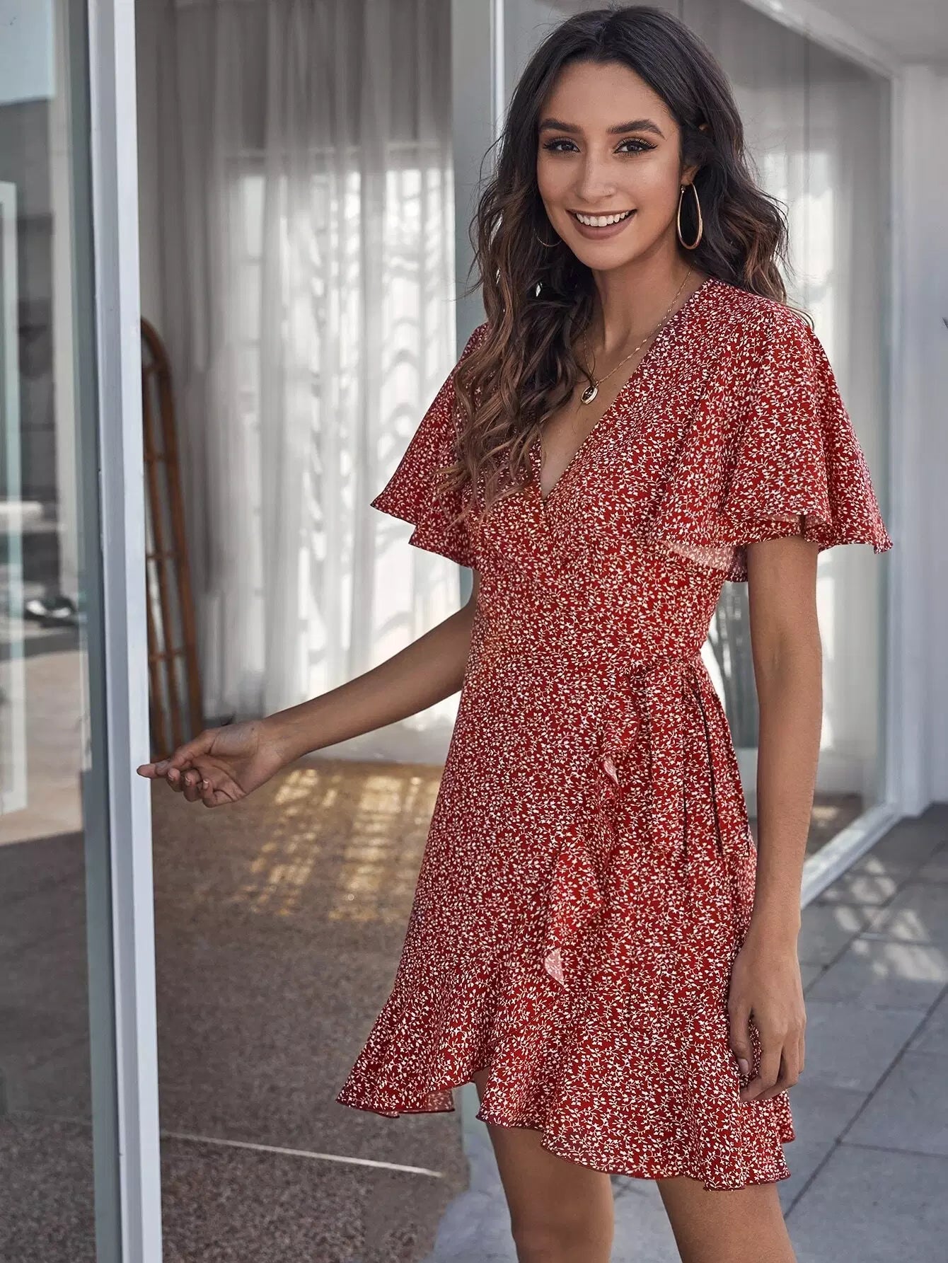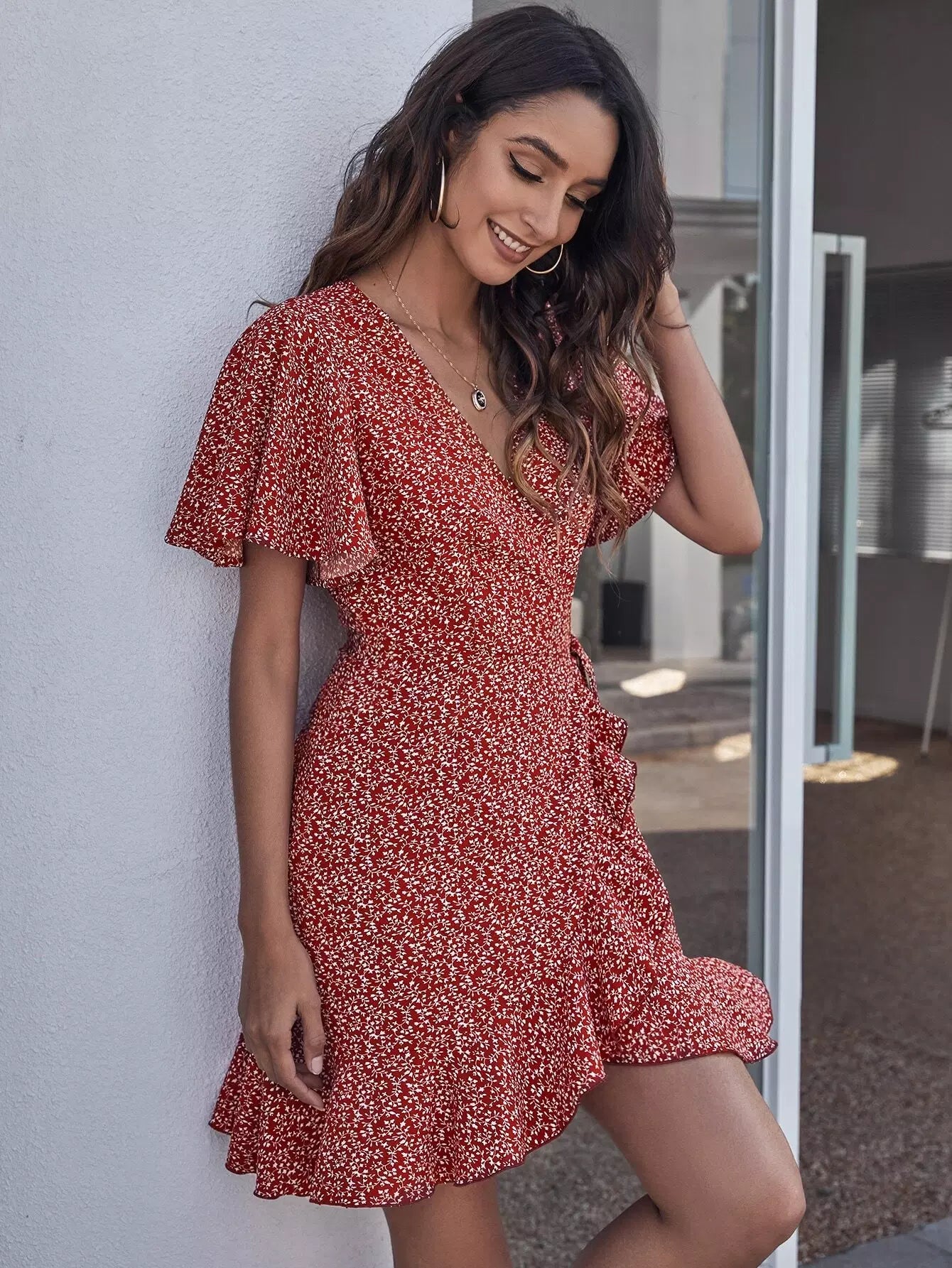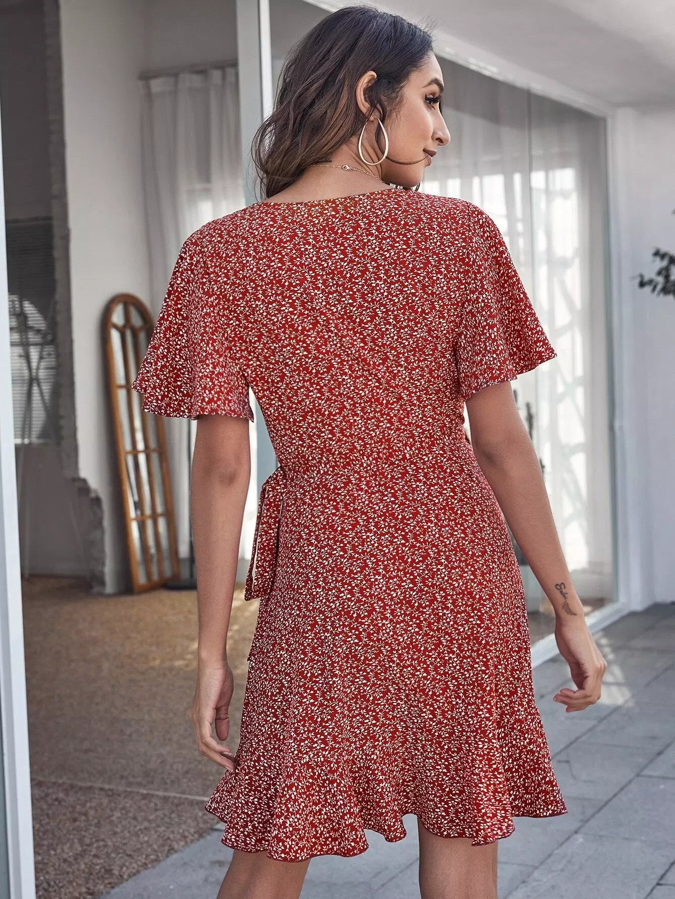Bell Sleeve Tie Side Ruffle Trim Ditsy Floral Dress