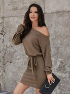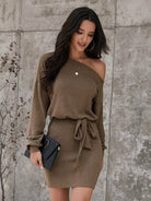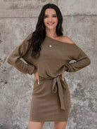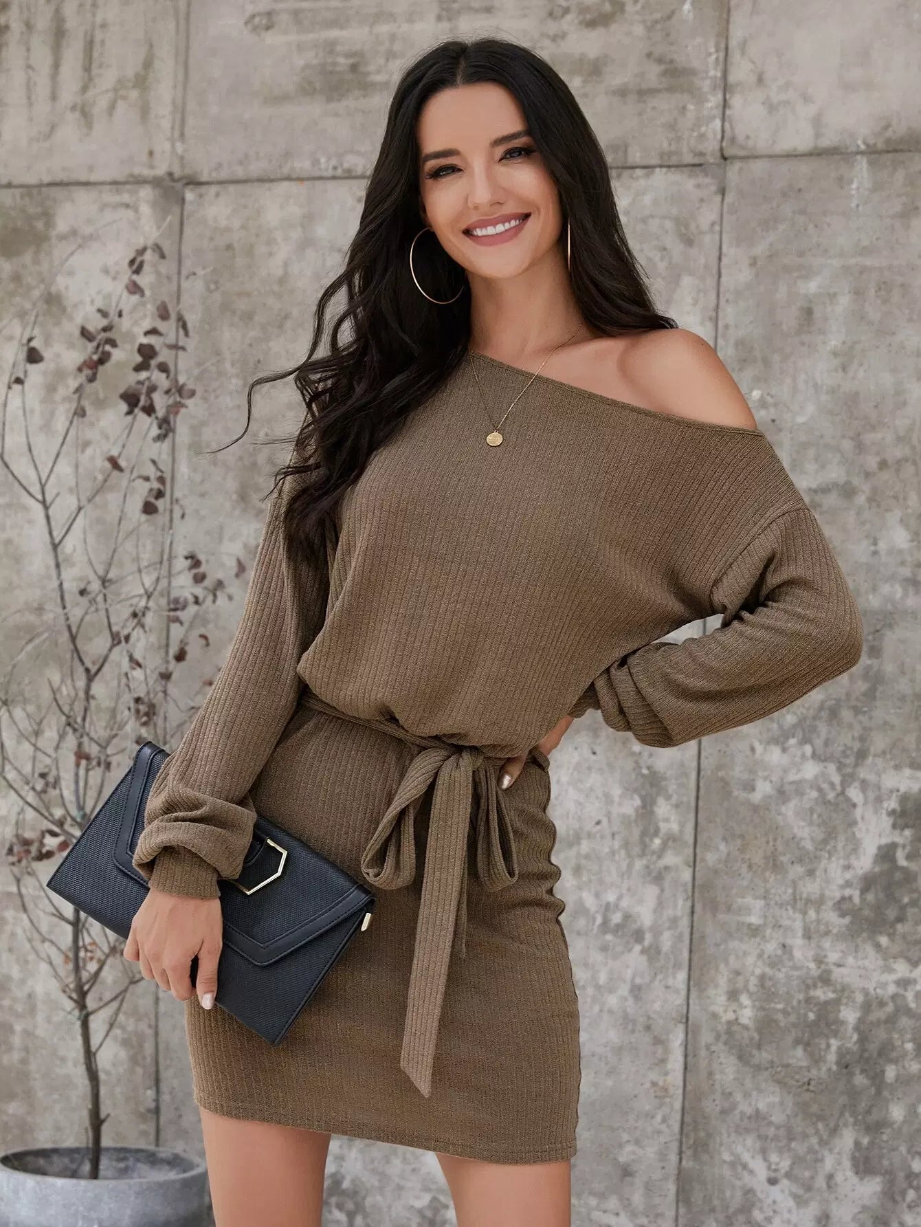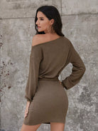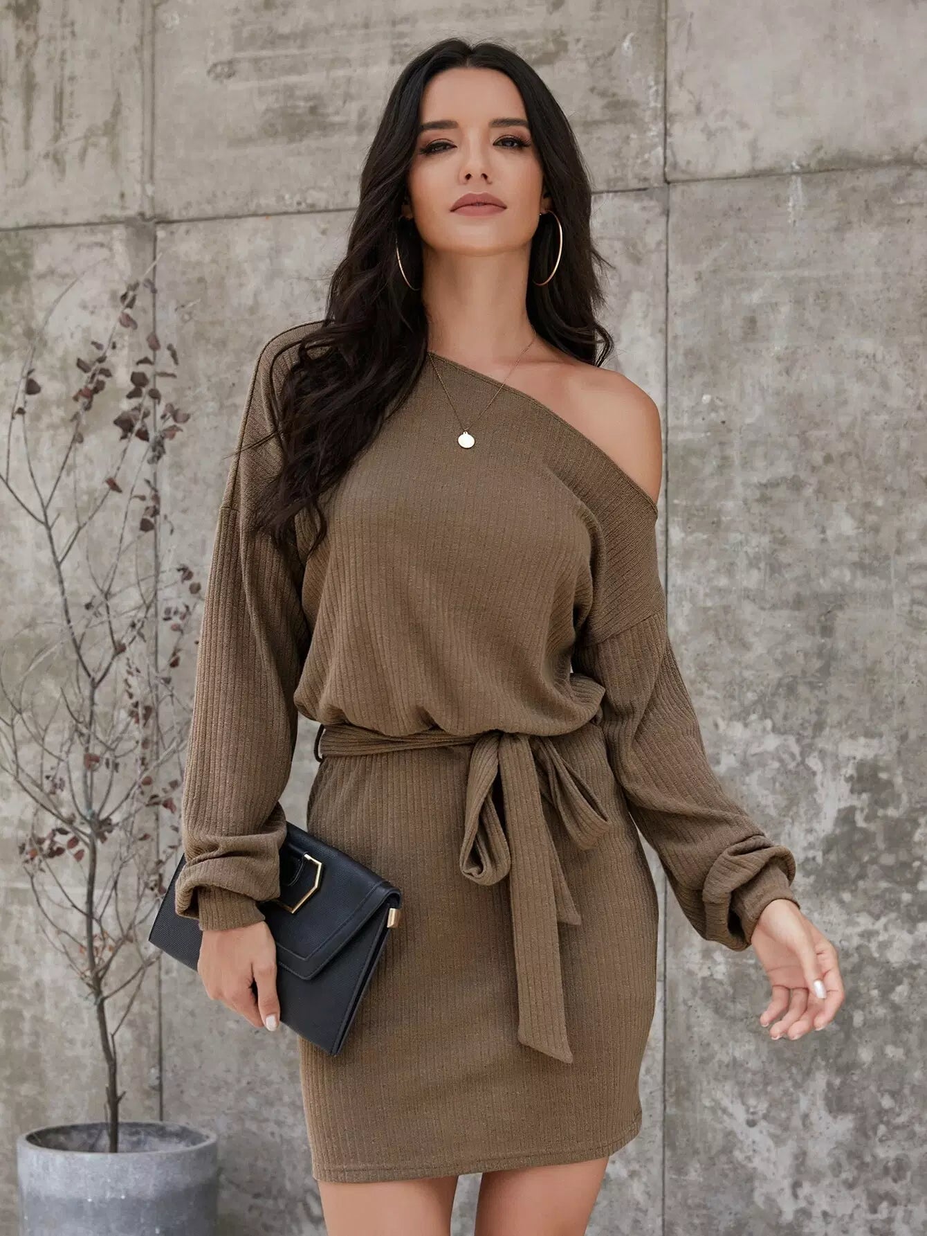 Ribbed Asymmetrical Neck Mini Dress Without Belt