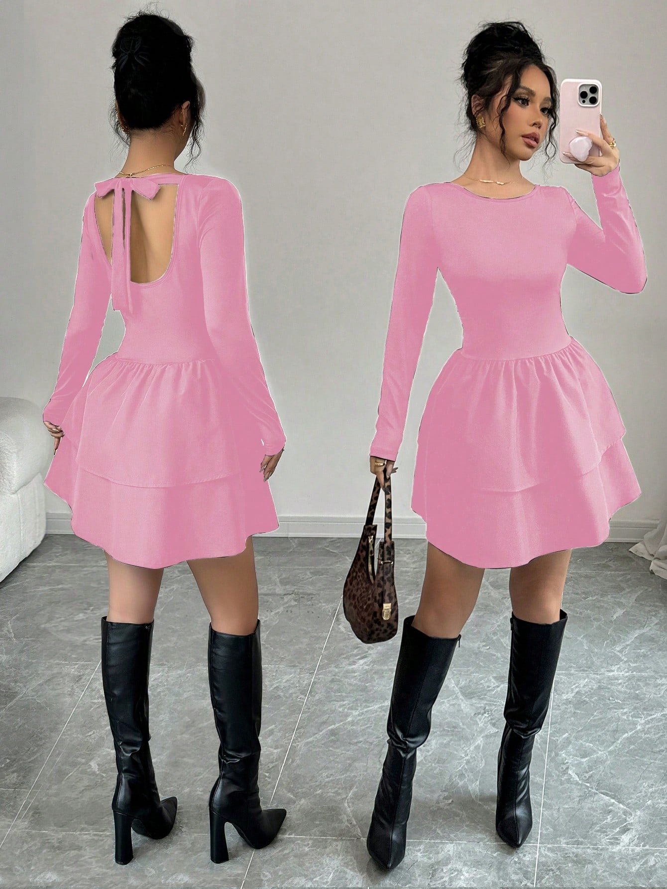 Chiquease Women's Casual Versatile Elastic Knit Cutout Bowknot Back Top Paired With Layered Pleated Hem