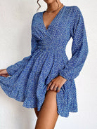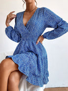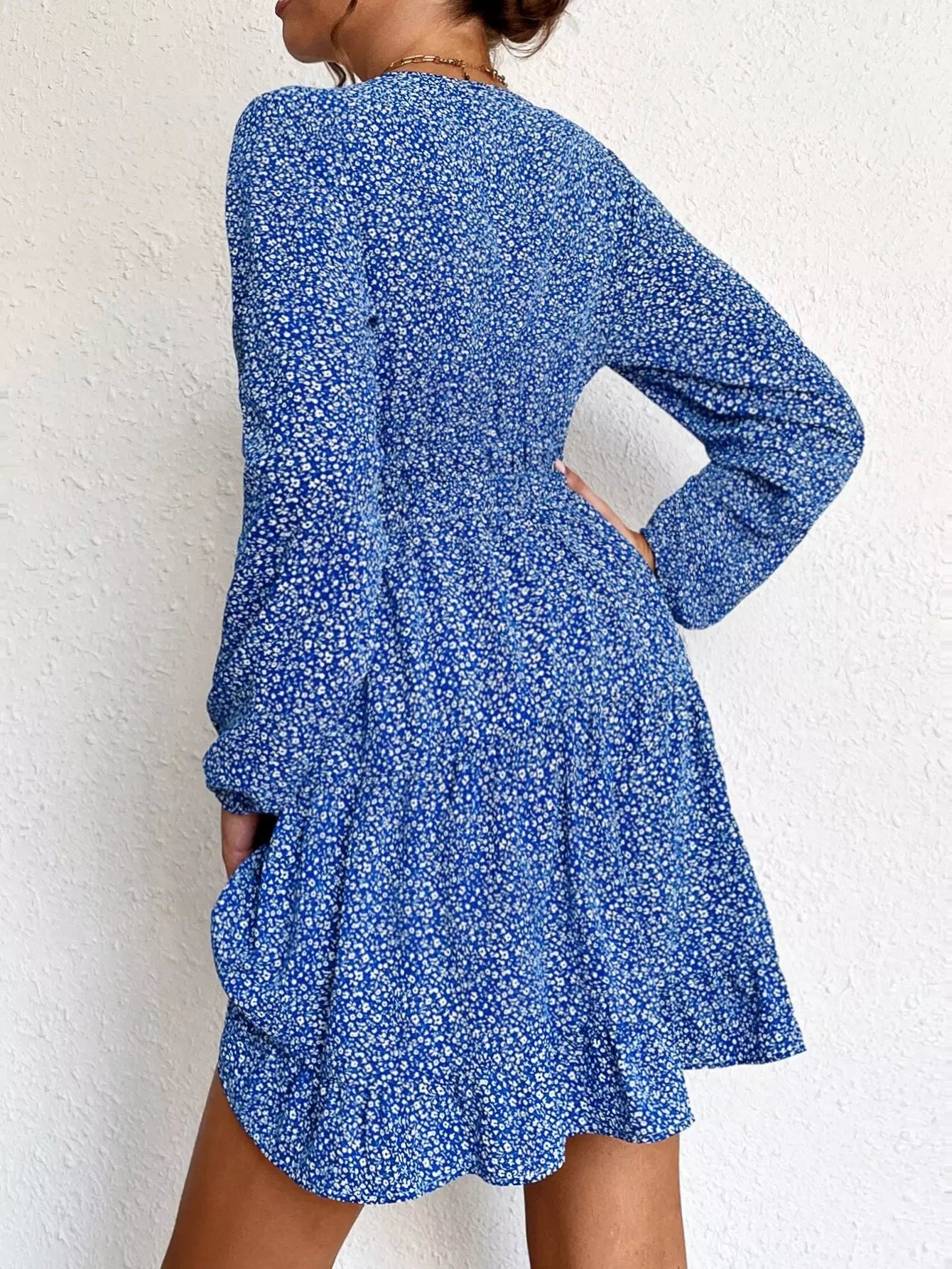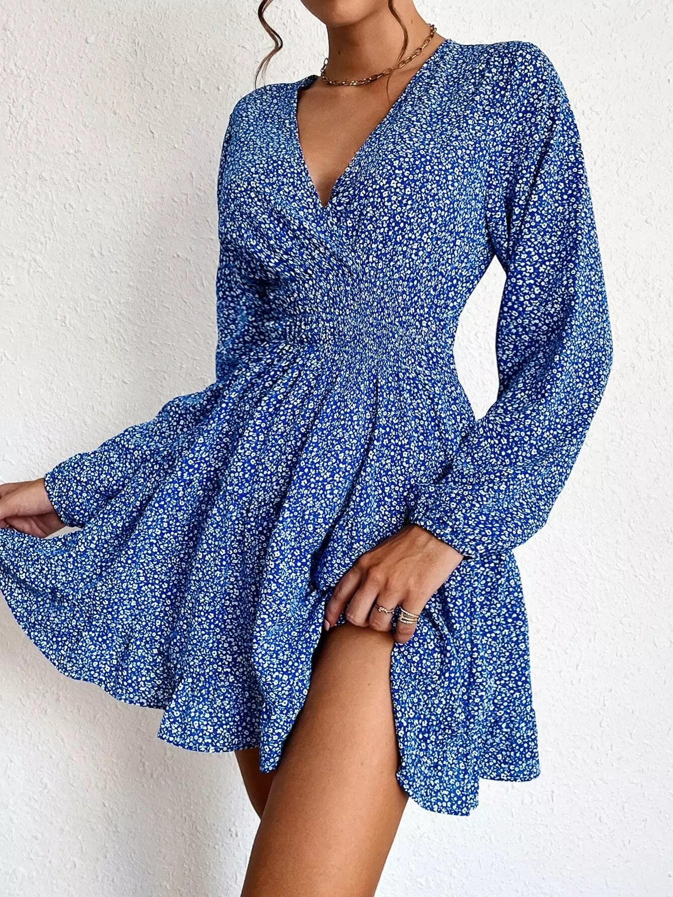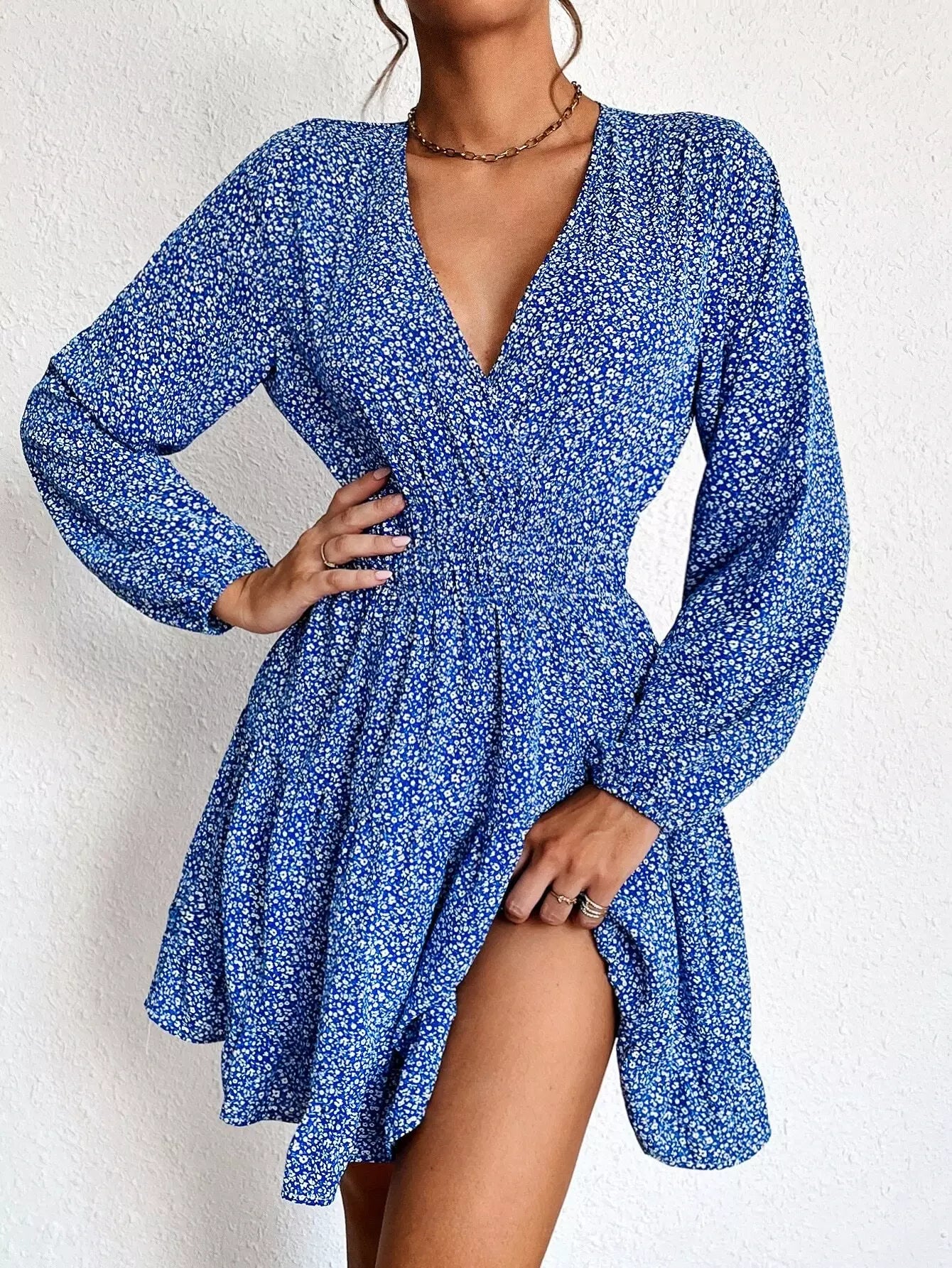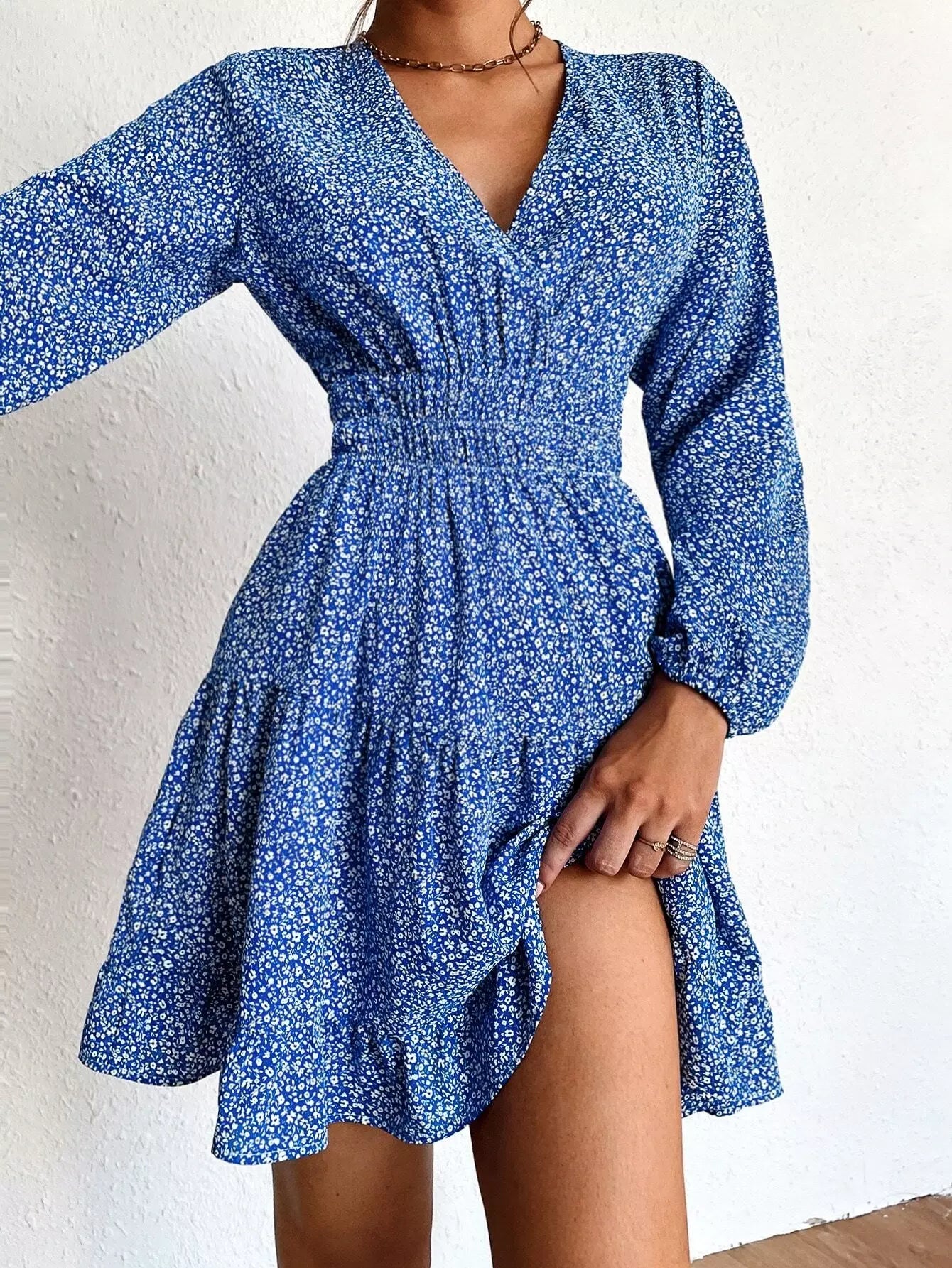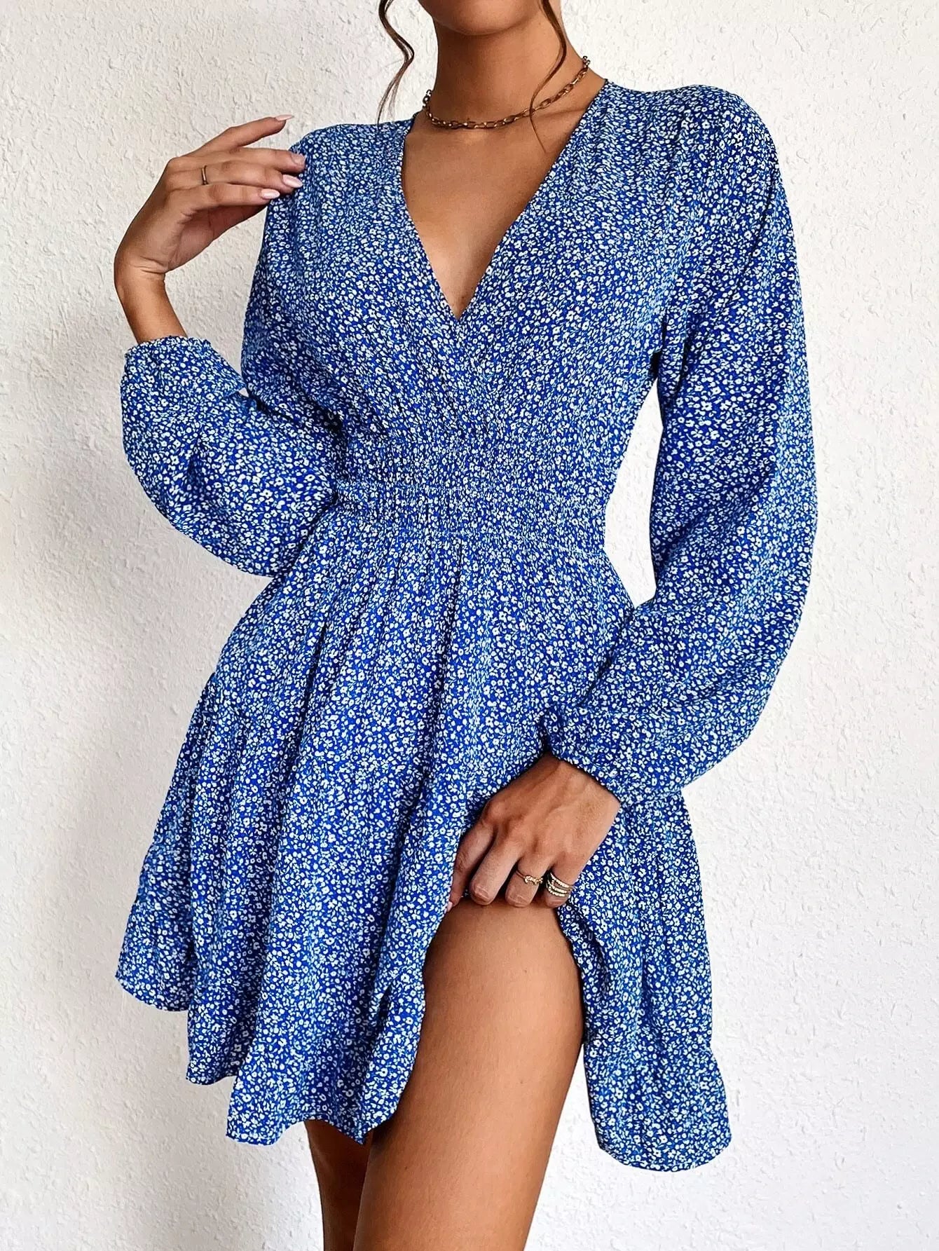 Ditsy Floral Shirred Bishop Sleeve Ruffle Hem Dress