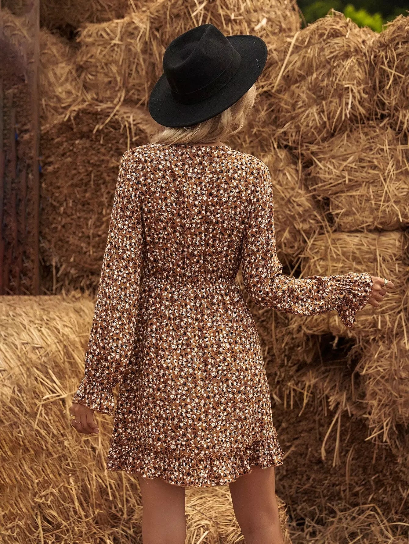 Ditsy Floral Surplice Neck Ruffle Hem Dress
