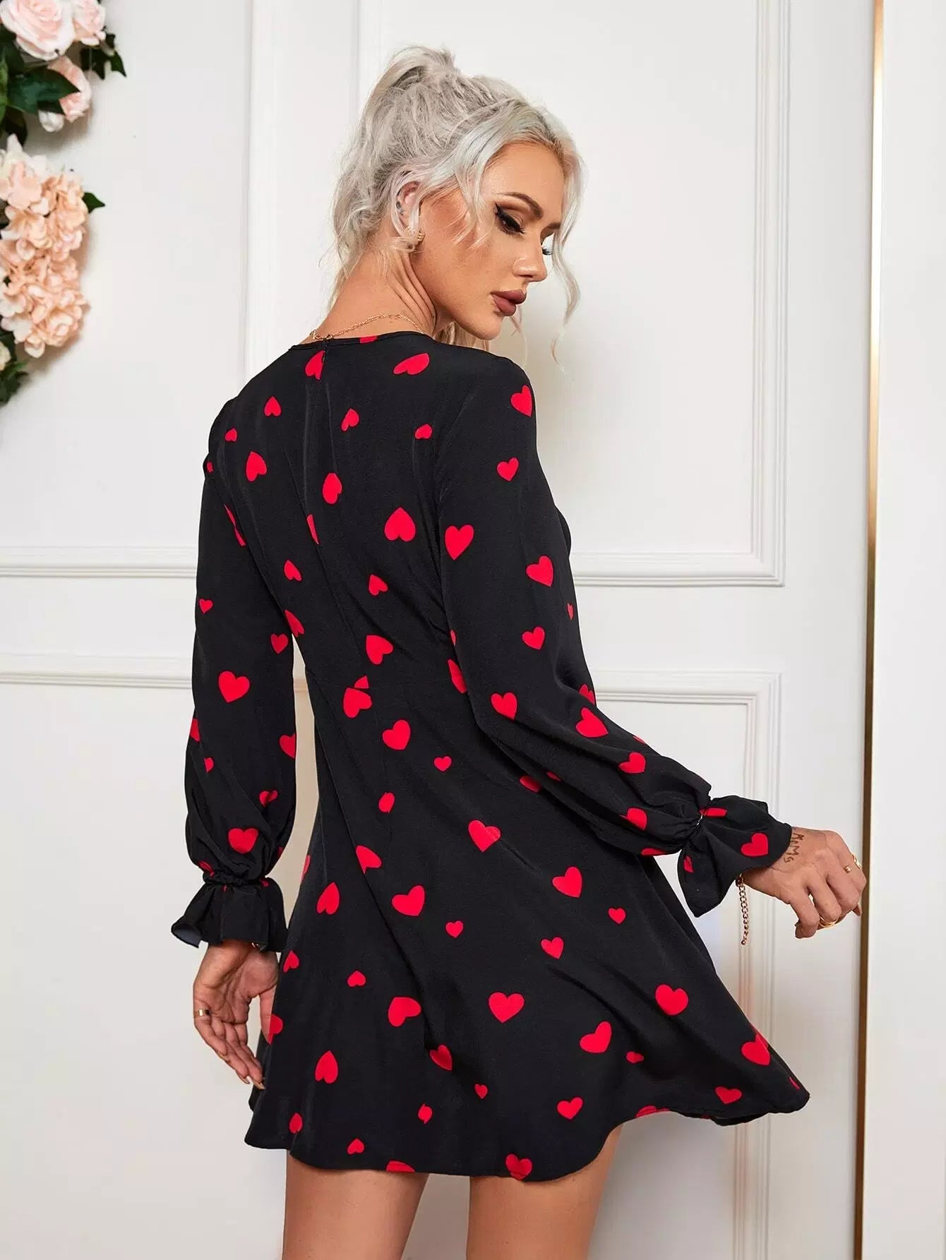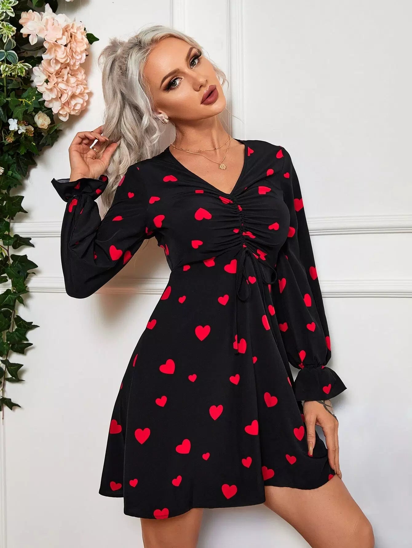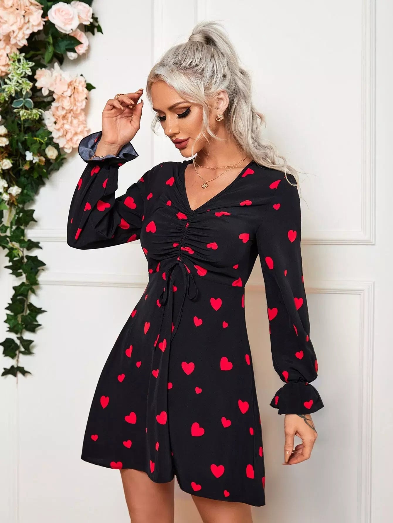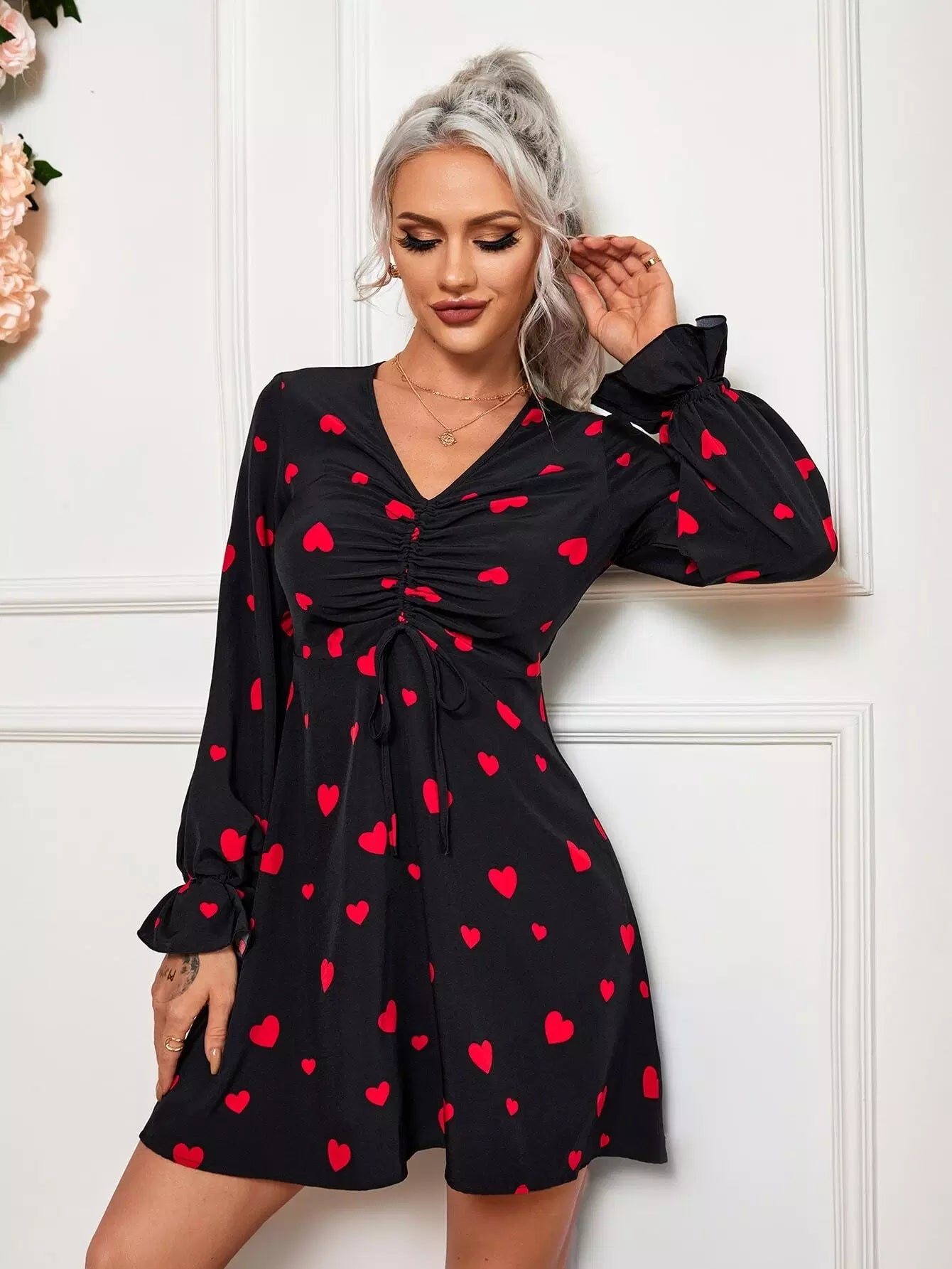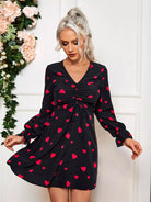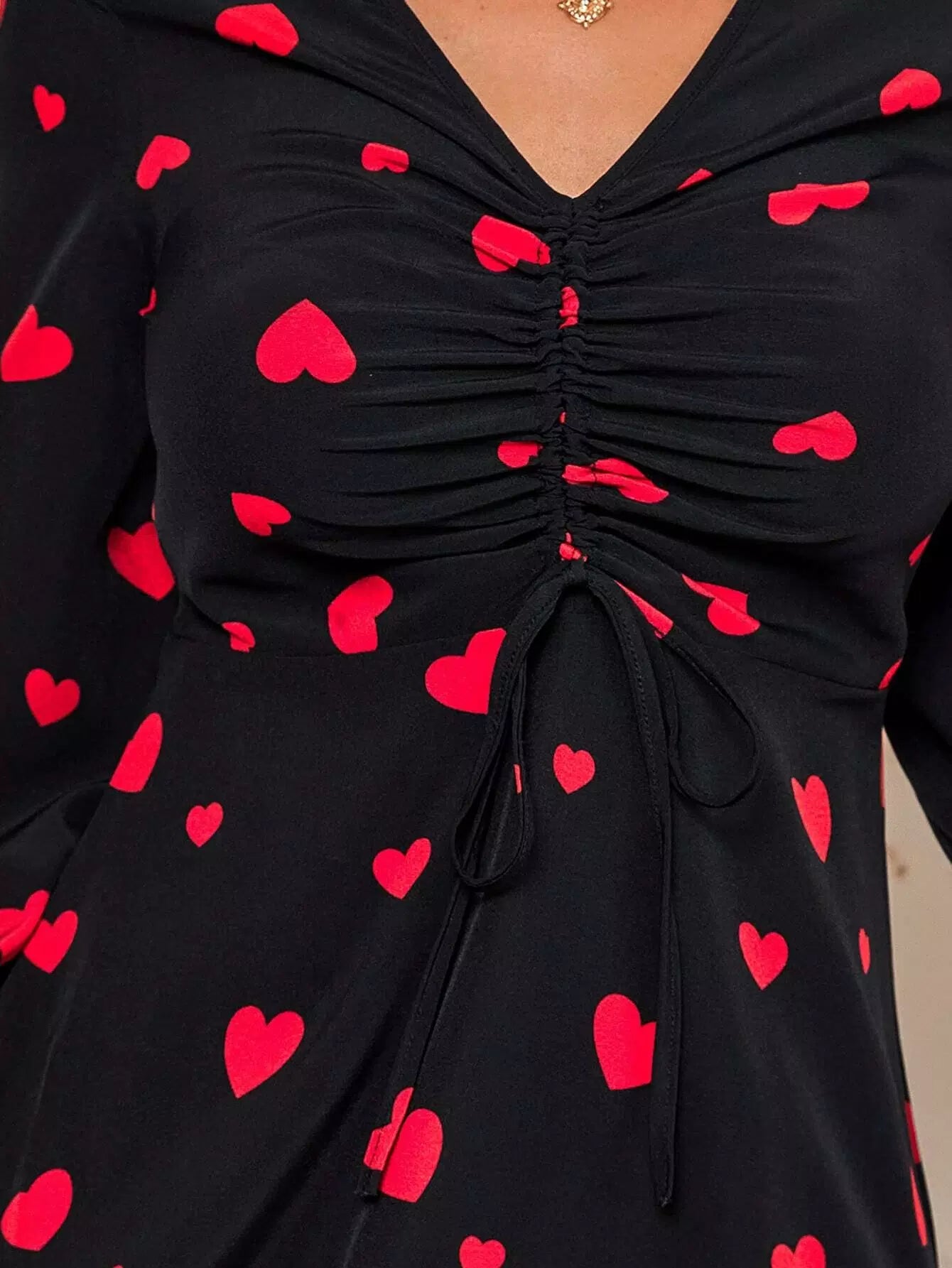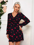 Drawstring Front Allover Heart Print Dress