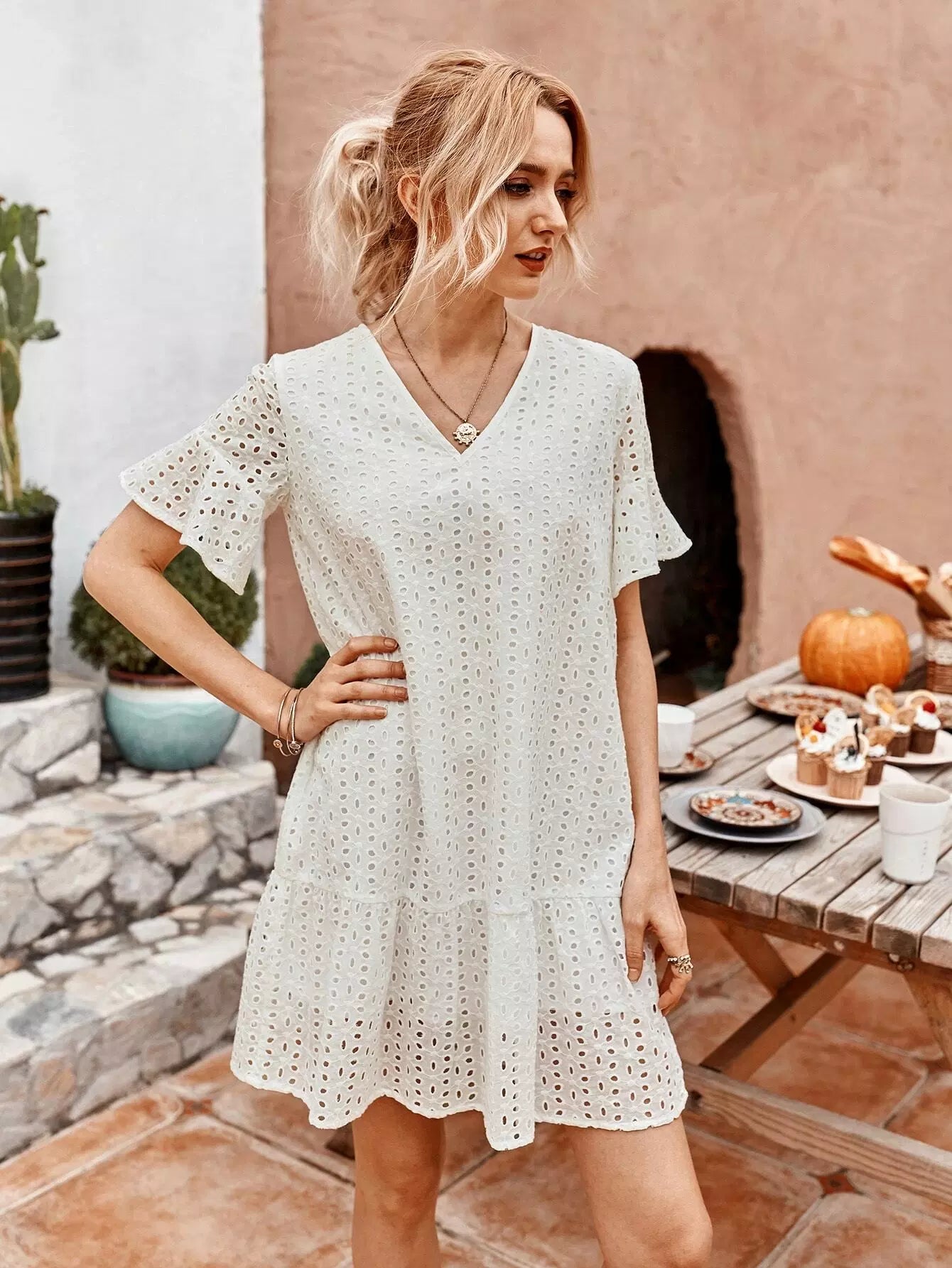 Eyelet Embroidery Ruffle Hem Smock Dress