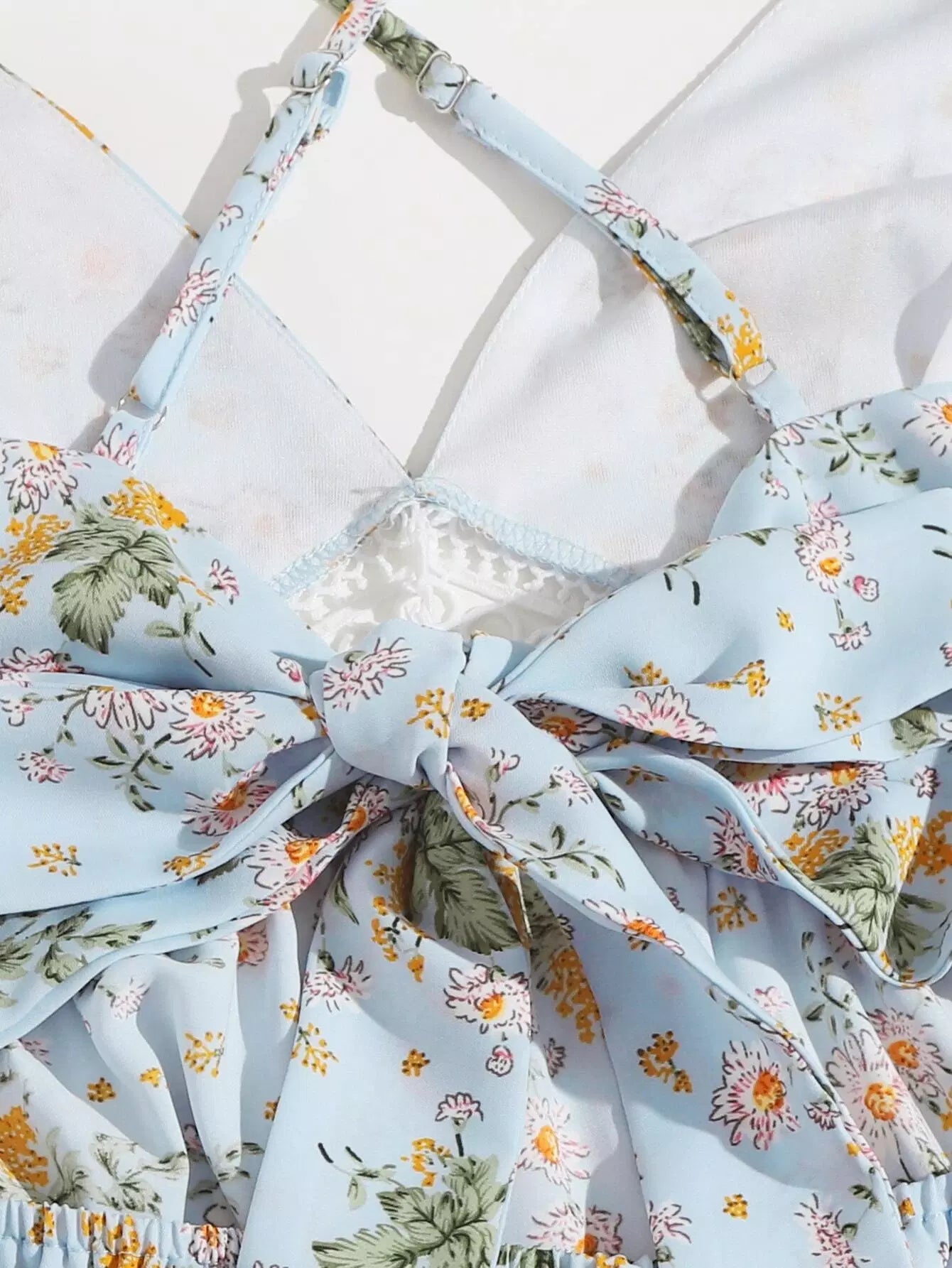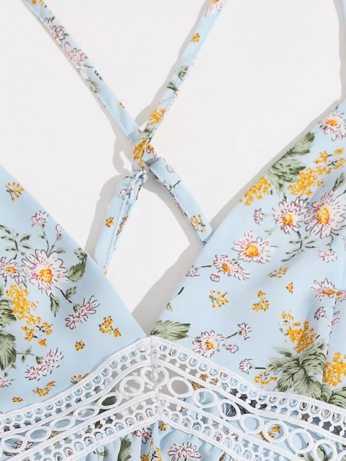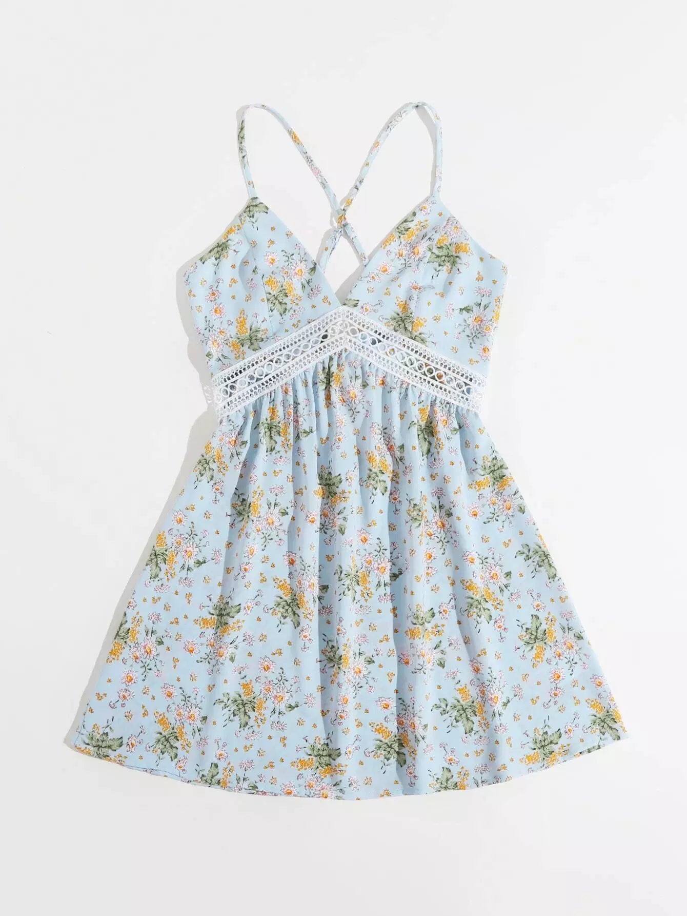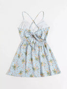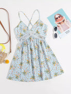 Floral Print Crisscross Tie Backless Contrast Lace Detail Slip Dress